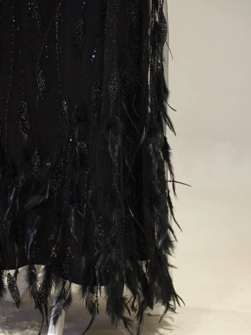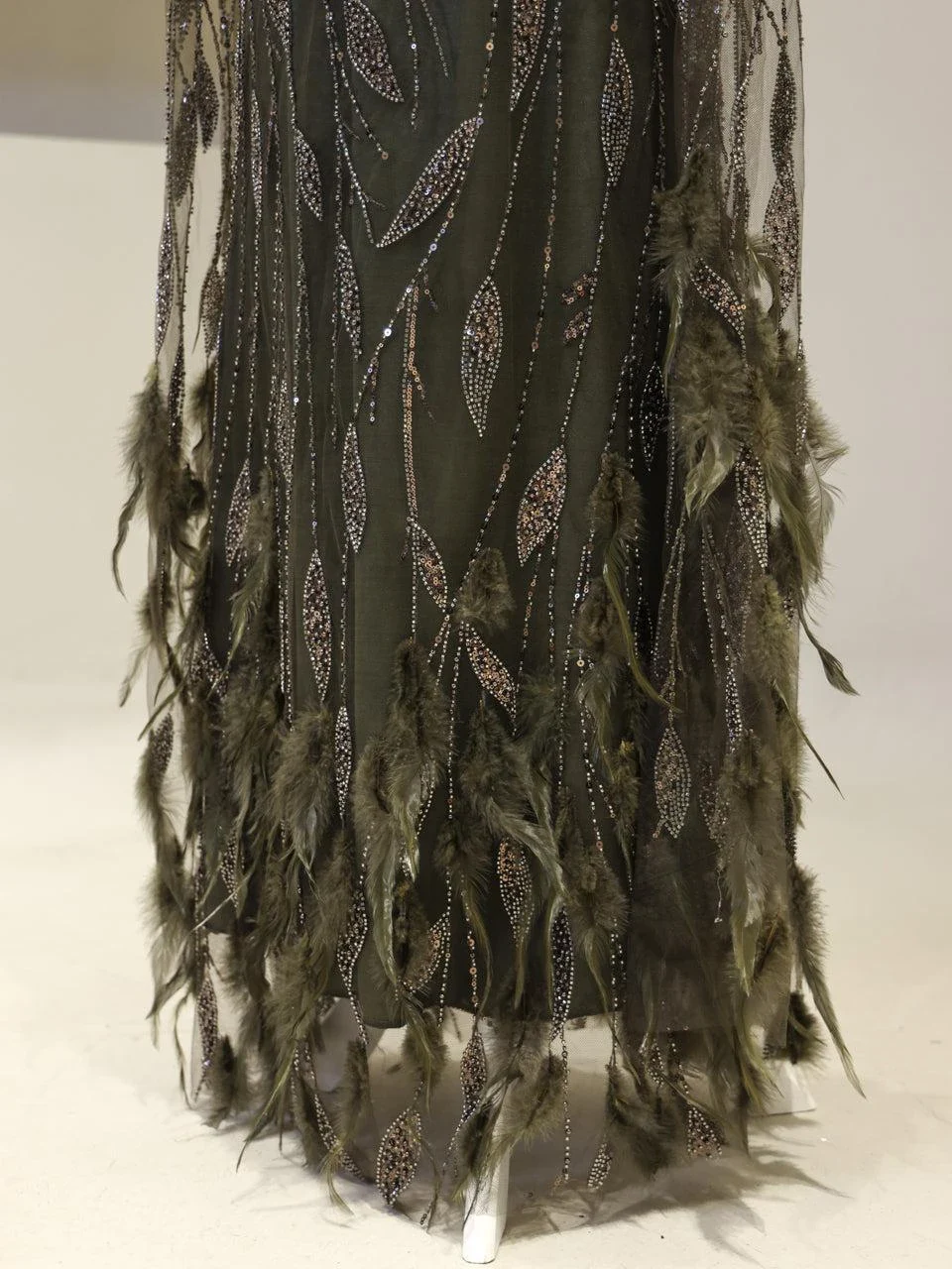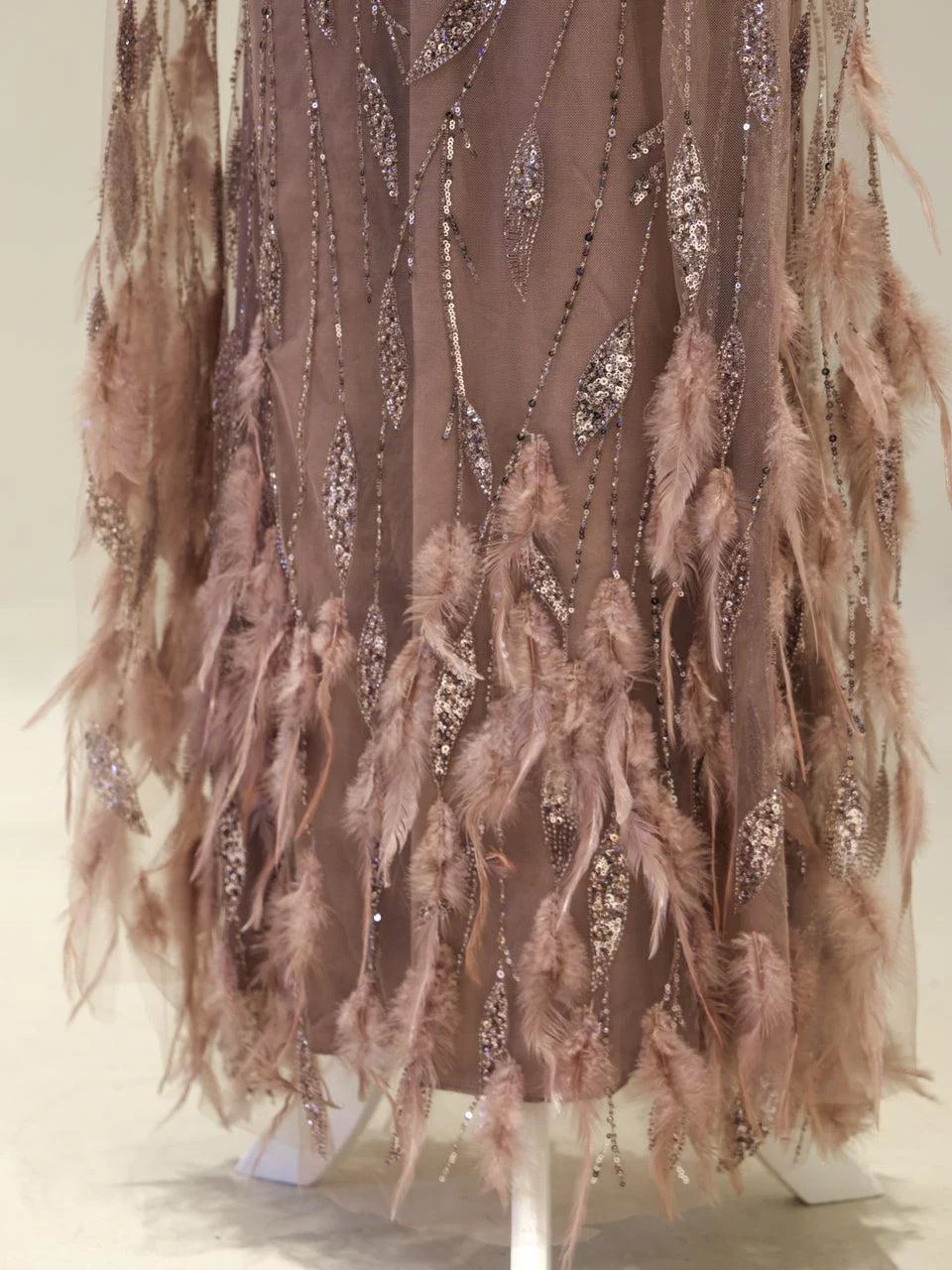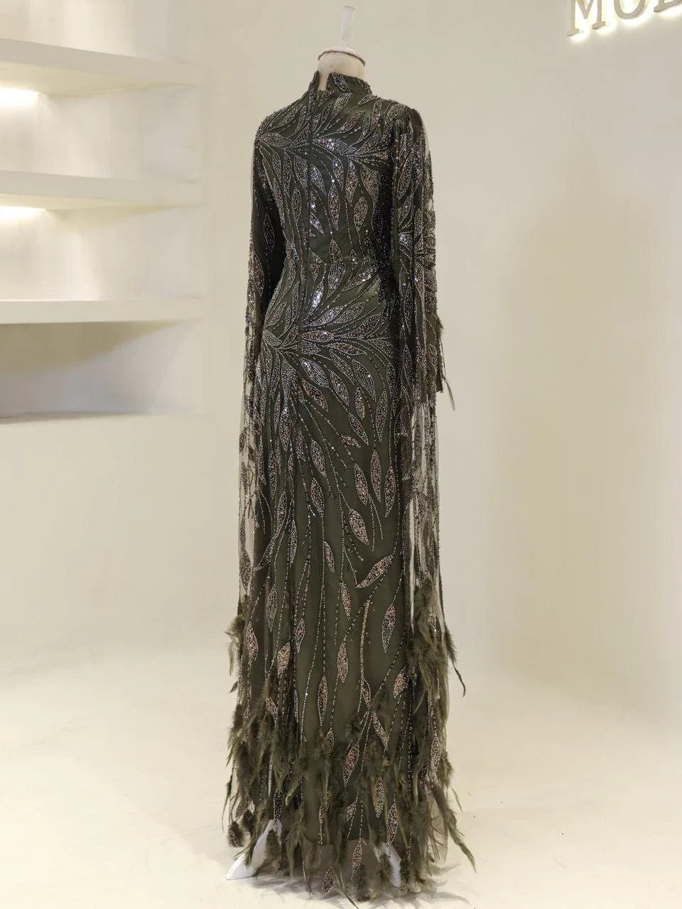 The Couture Lumira modest evening dress is designed with precision and elegance. Made from tulle fabric, it features a high neckline and a cape detail that extends from the shoulders to the hem. The dress has a straight skirt form and is approximately 160 cm in length. It is equipped with a back zipper for easy wear. The embellishments on the dress are not glued, ensuring durability. The dress is fully lined for comfort.