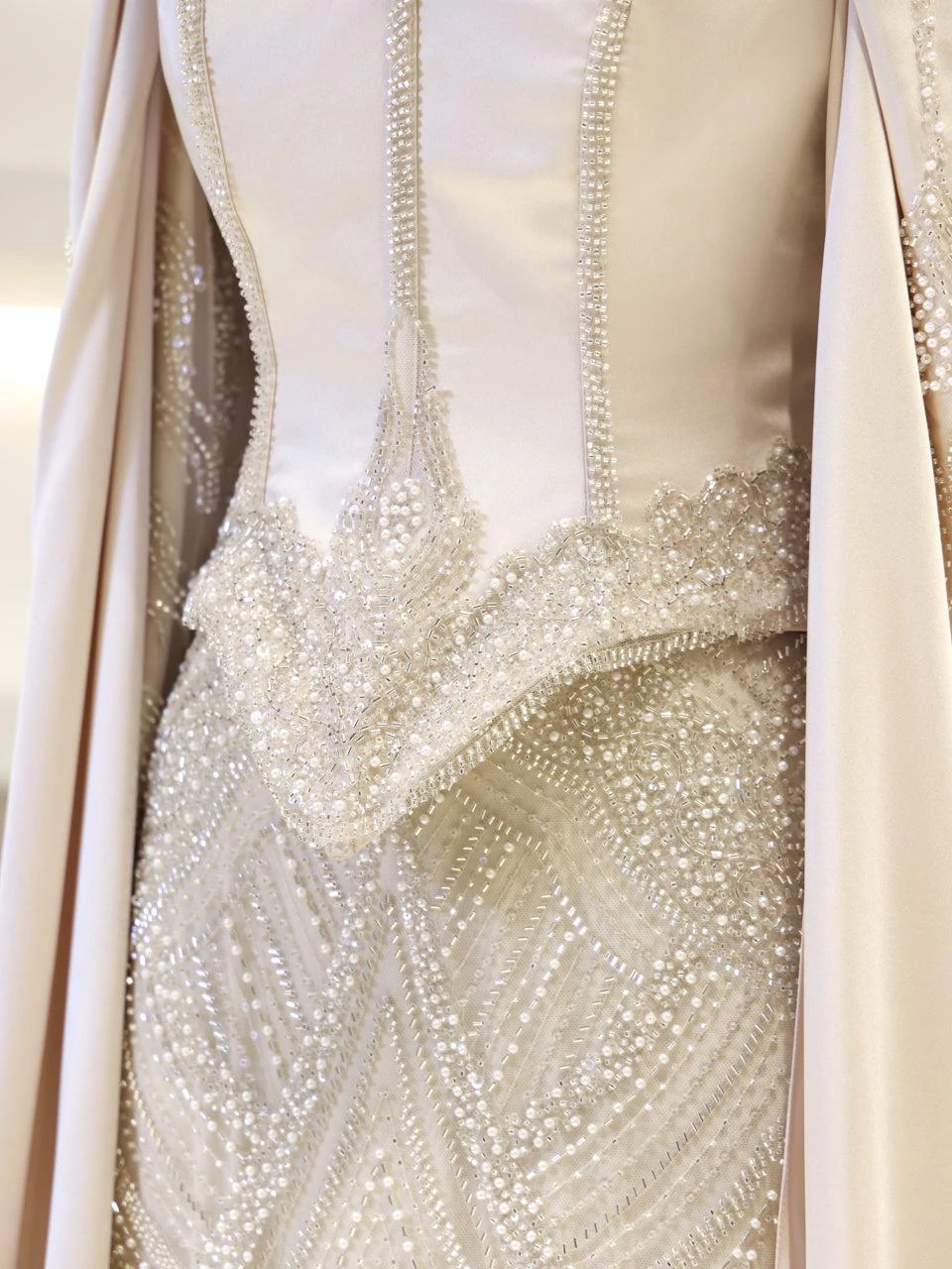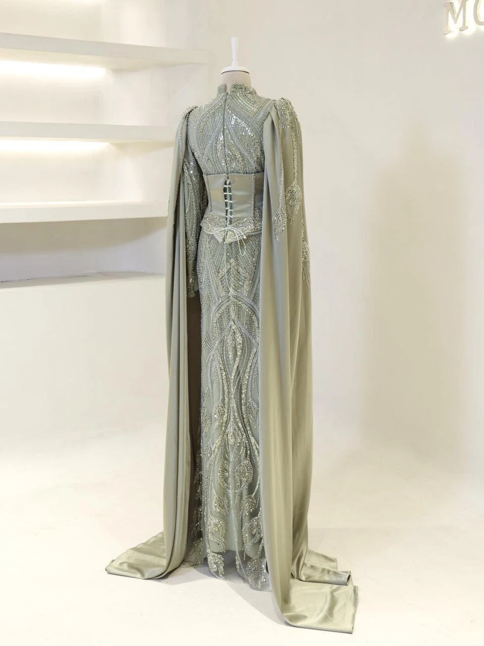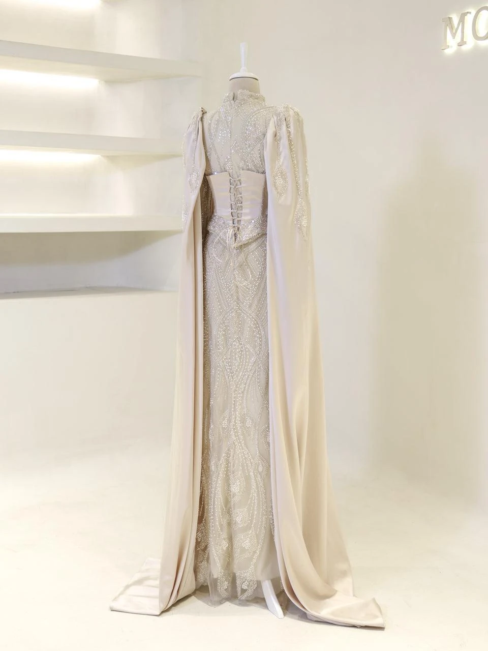 The Couture Lunara Modest Evening Dress is designed with a full fit and measures 165 cm in length. It features a lining and a back zipper for easy wear. The dress includes a cape detail that extends from the shoulders to the hem. The corset detail is detachable, providing versatility in styling. Unlike glued embellishments, the dress has secure, high-quality embellishments. The pencil skirt form adds a sleek touch to the overall design.