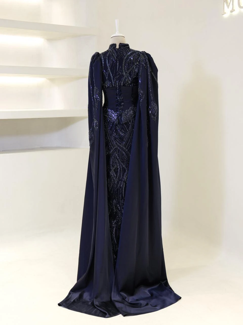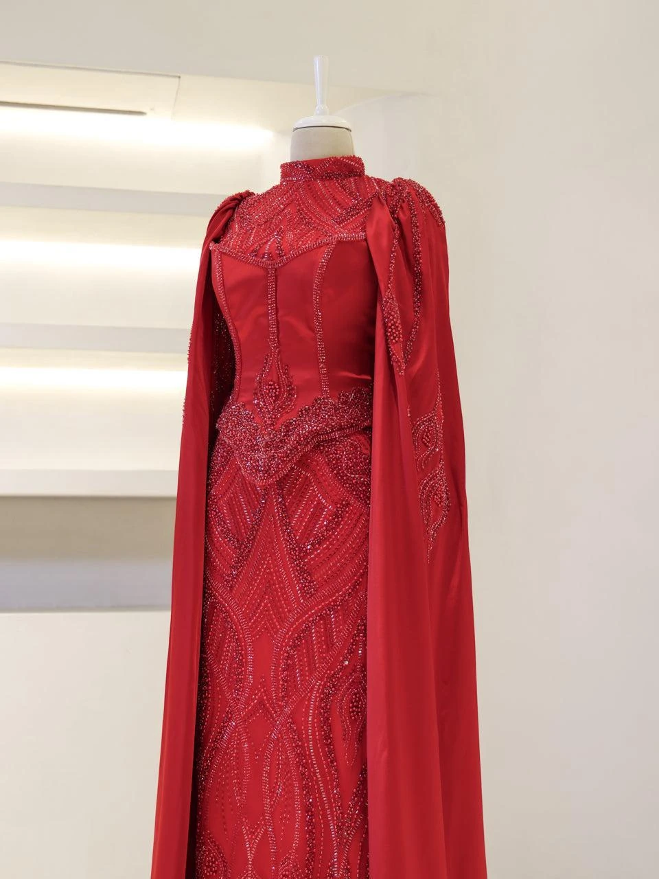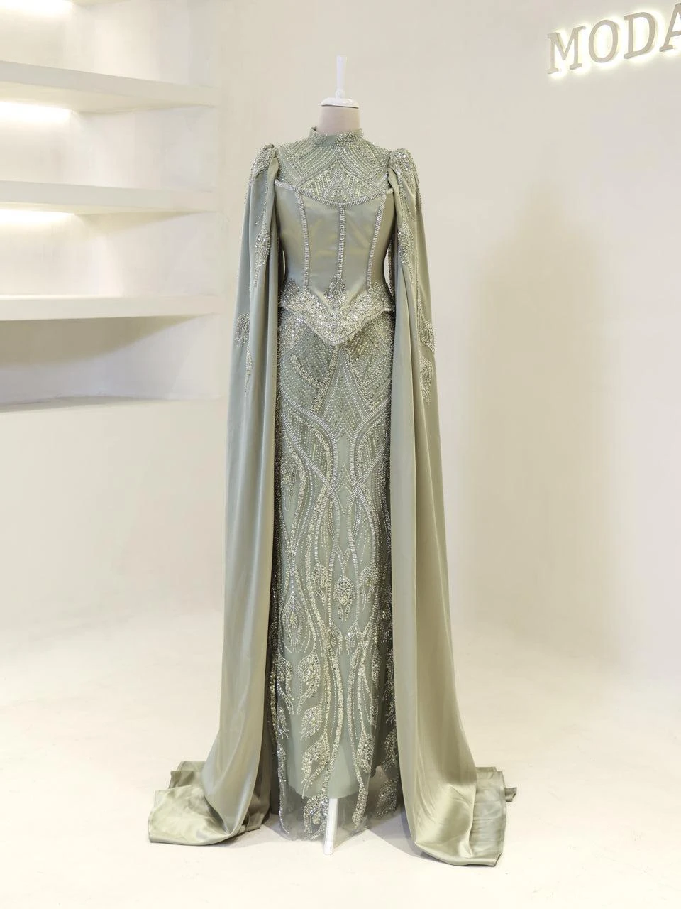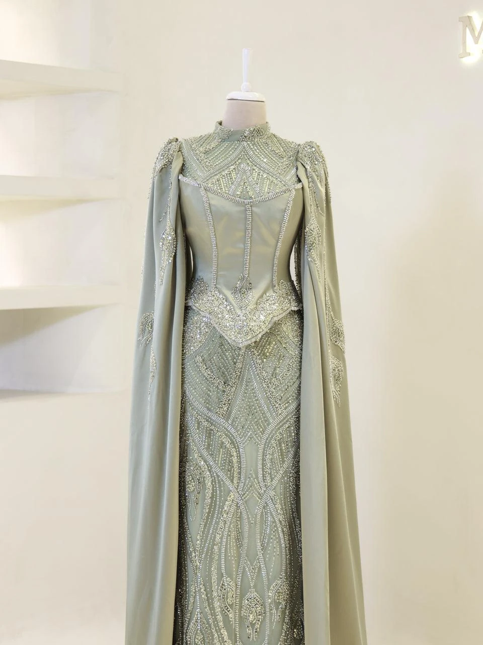 The Couture Lunara Modest Evening Dress is designed with a full fit and measures 165 cm in length. It features a lining and a back zipper for easy wear. The dress includes a cape detail that extends from the shoulders to the hem. The corset detail is detachable, providing versatility in styling. Unlike glued embellishments, the dress has secure, high-quality embellishments. The pencil skirt form adds a sleek touch to the overall design.