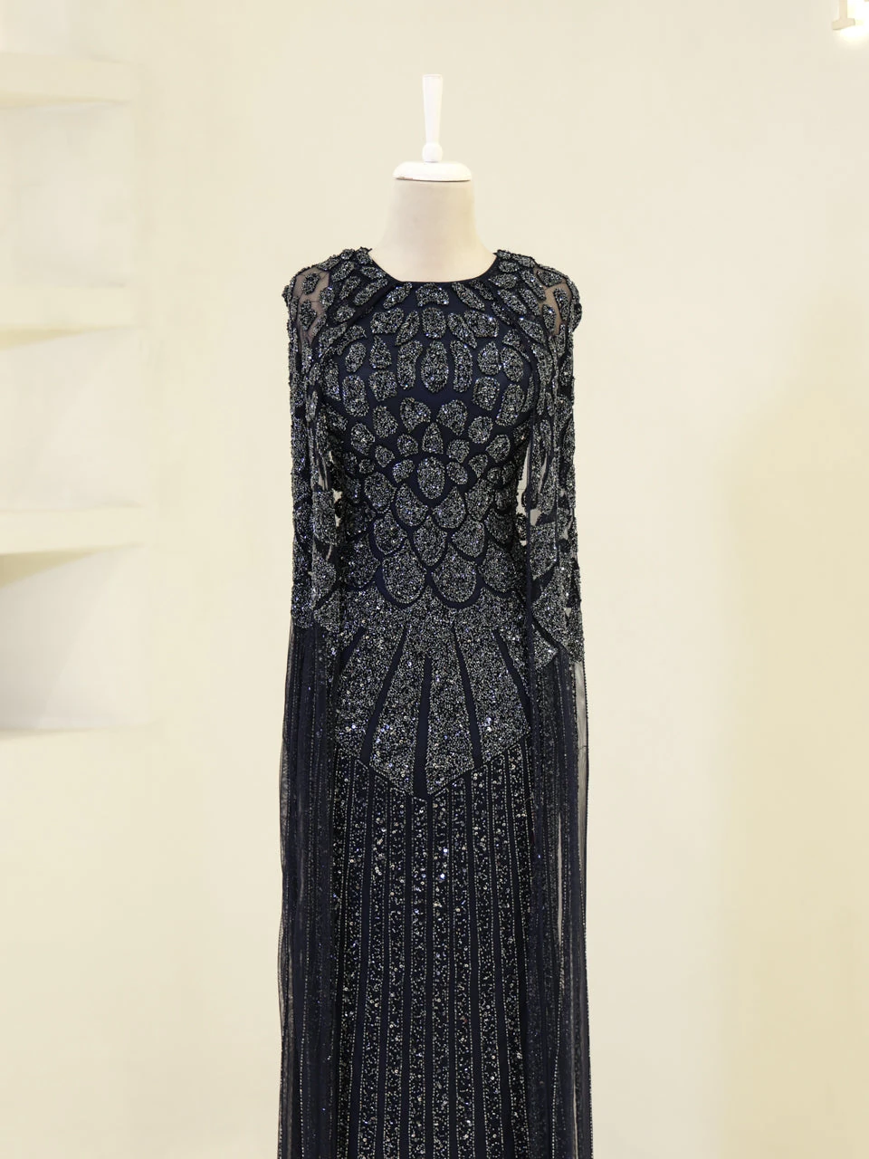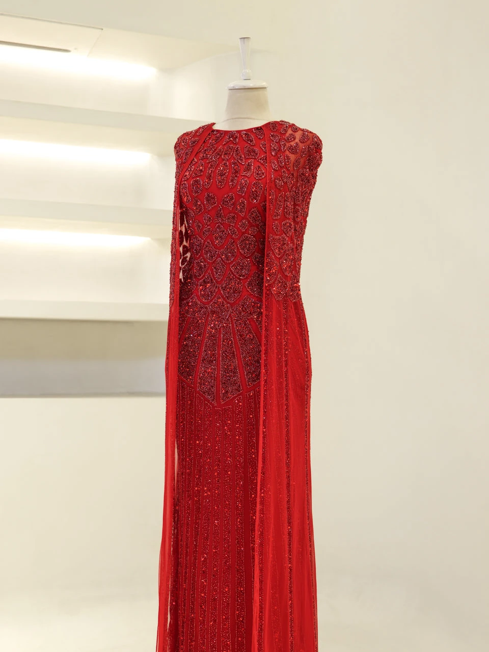 The Couture Lurella Evening Dress is designed to fit true to size, featuring an average length of 160 cm. This dress is crafted from an embroidered stretch fabric, providing both comfort and style. It includes a back zipper for easy wear and is fully lined for a smooth fit. The dress is sleeveless and features a cape detail, adding a touch of sophistication. Its straight skirt form offers a classic silhouette.