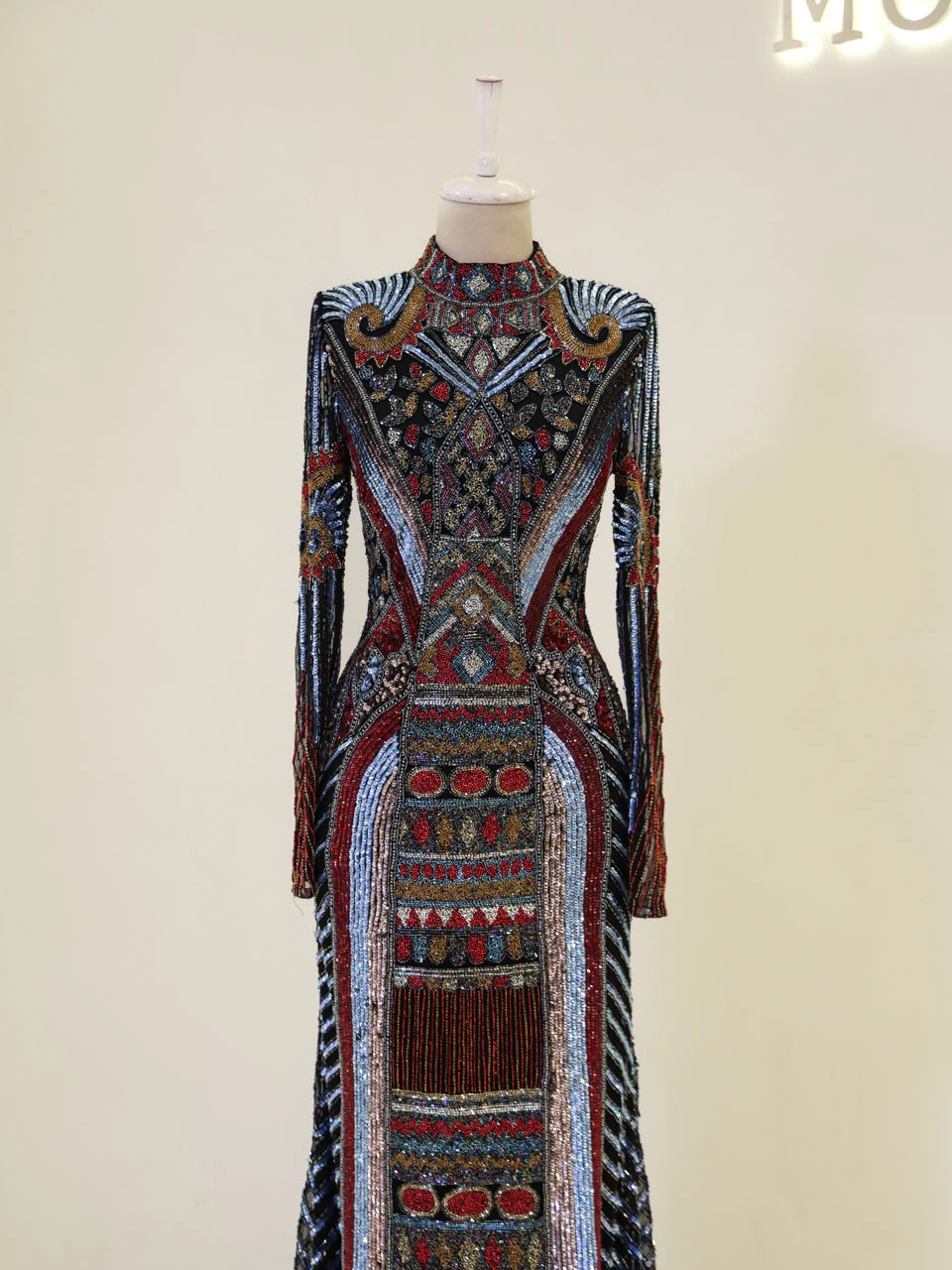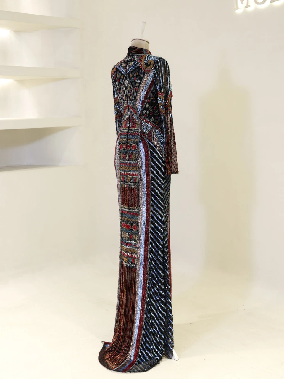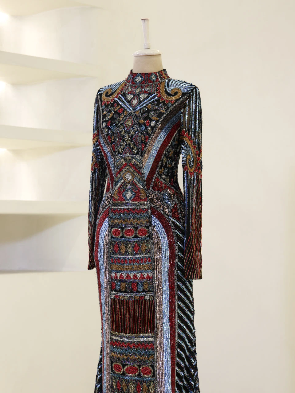 The Couture Luvina Modest Evening Dress offers a perfect fit with an average length of 165 cm. Designed with a train and a back zipper closure, this dress features a high collar and is made from embroidered stretch fabric. It includes a lining and has a flared skirt design. The sleeves are transparent, but can be customized to be covered upon request. For further details, please contact our WhatsApp line at +90 553 978 48 86.
