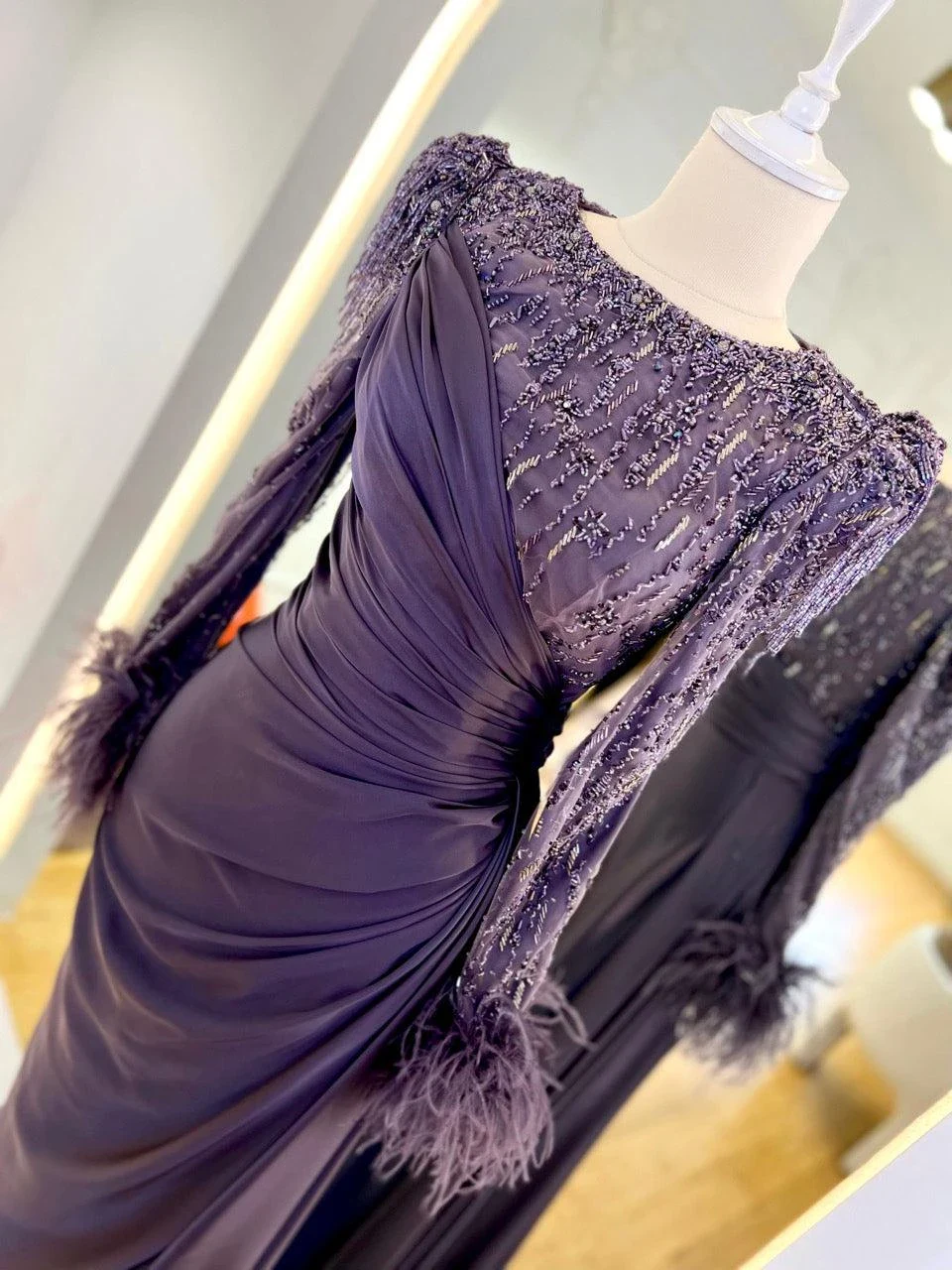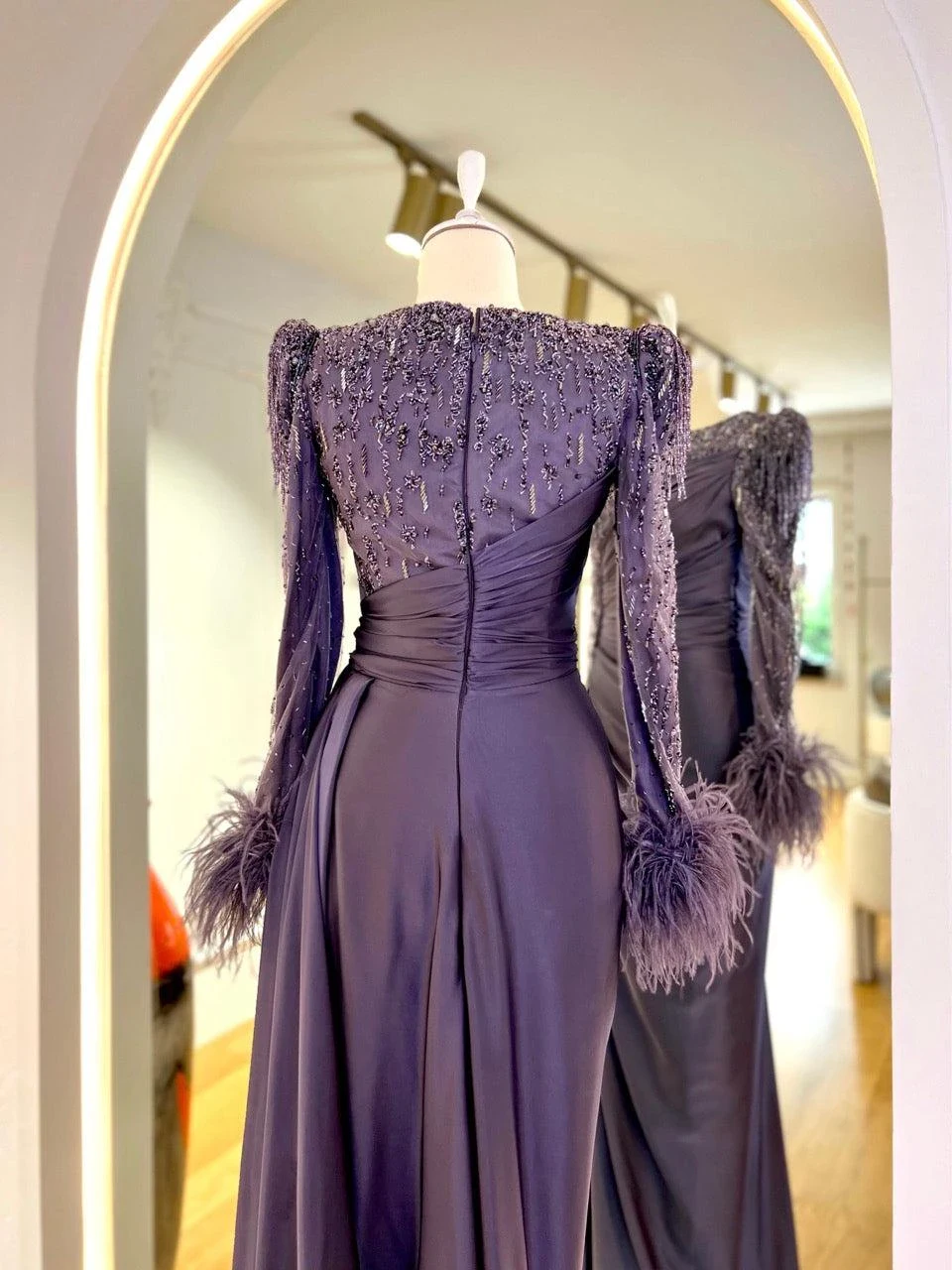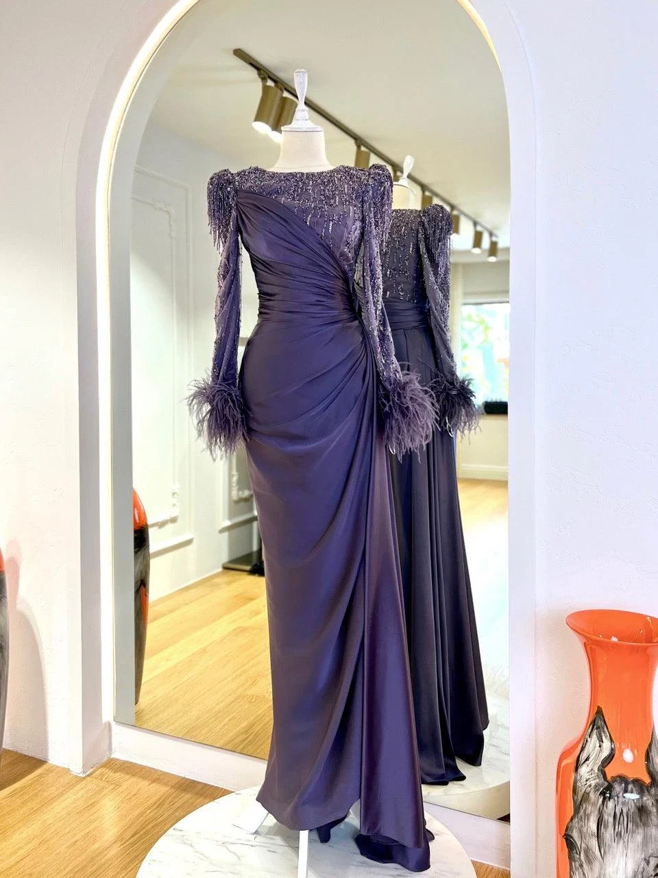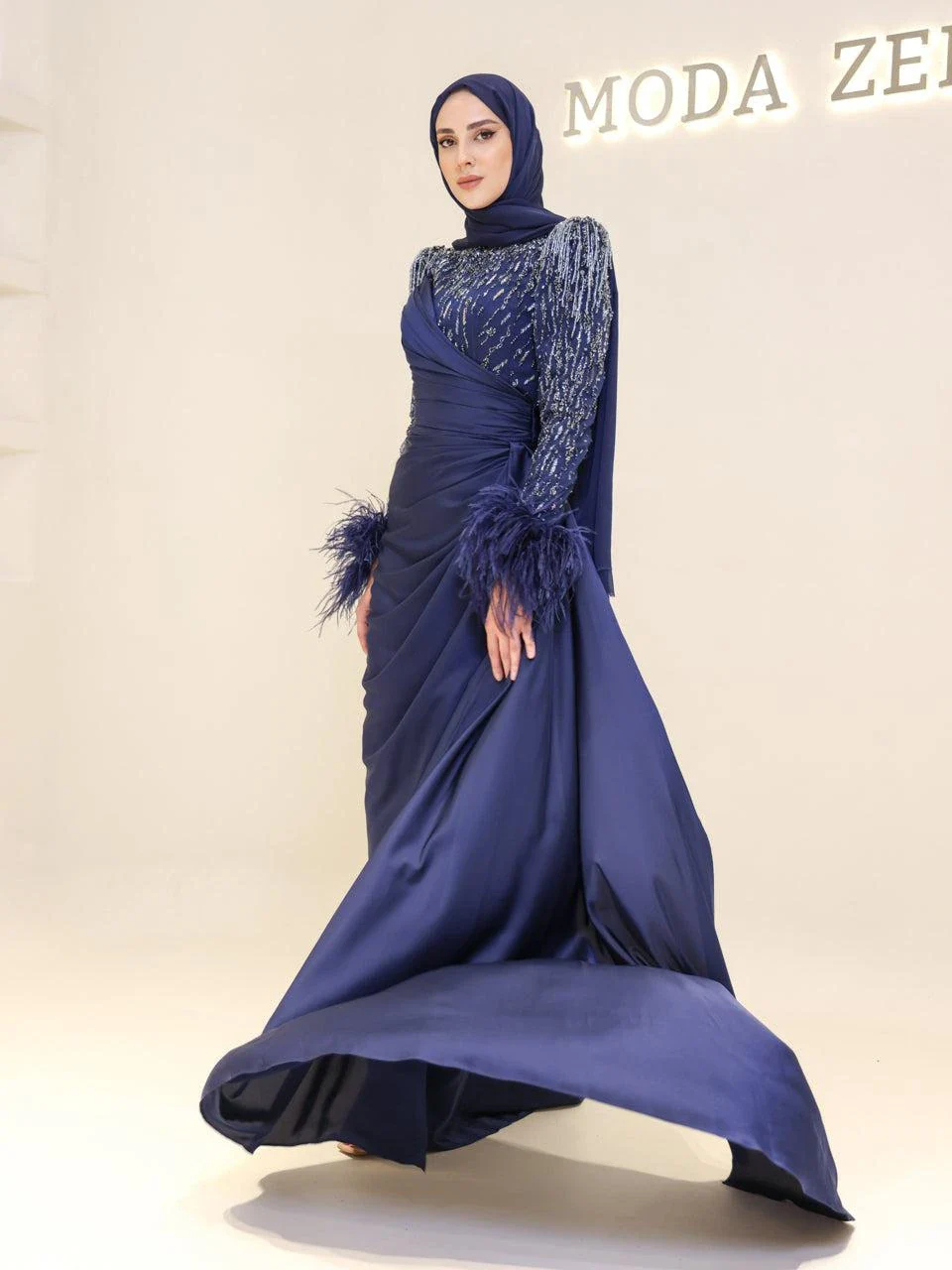 The Couture Mathilda Modest Evening Dress offers a refined silhouette with its precise fit. The dress features a front length of 160 cm and a back length of 175 cm, crafted from luxurious silk fabric. It includes a lining for added comfort and a rear zipper closure. The upper skirt and waist areas are adorned with drape details, while the cuffs are accented with non-detachable feather details. The embellishments are securely attached, and the dress is designed in a pencil form with padded shoulders.
