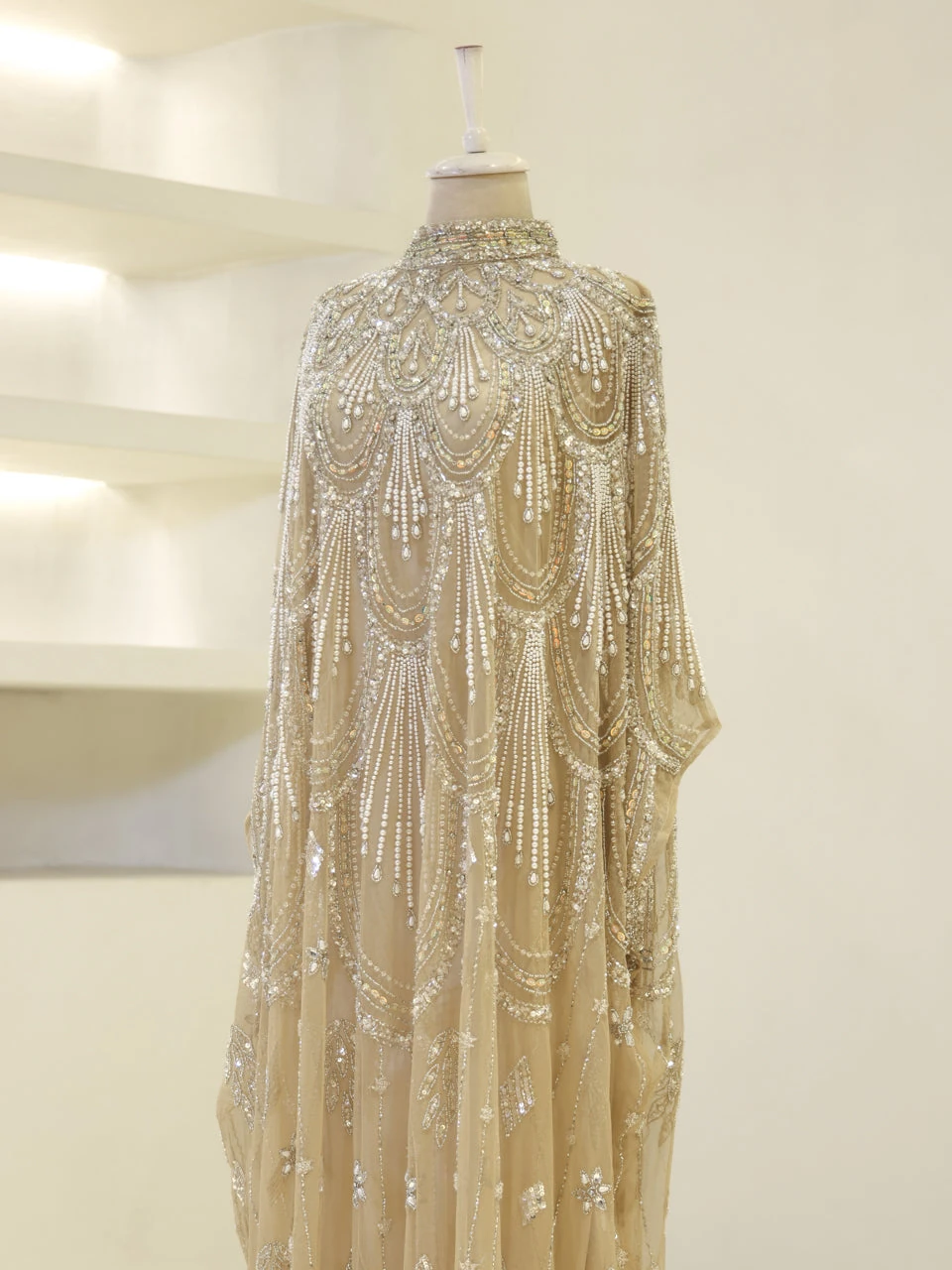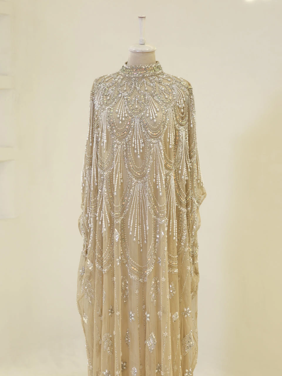 The Couture Mavielle Evening Dress is designed with precision to fit true to size. It features an average length of 160 cm and is crafted from embroidered stretch fabric. The dress includes a sleeveless inner garment and a batwing cape, which is not detachable. It is fully lined and has a straight skirt design, offering both style and comfort.
