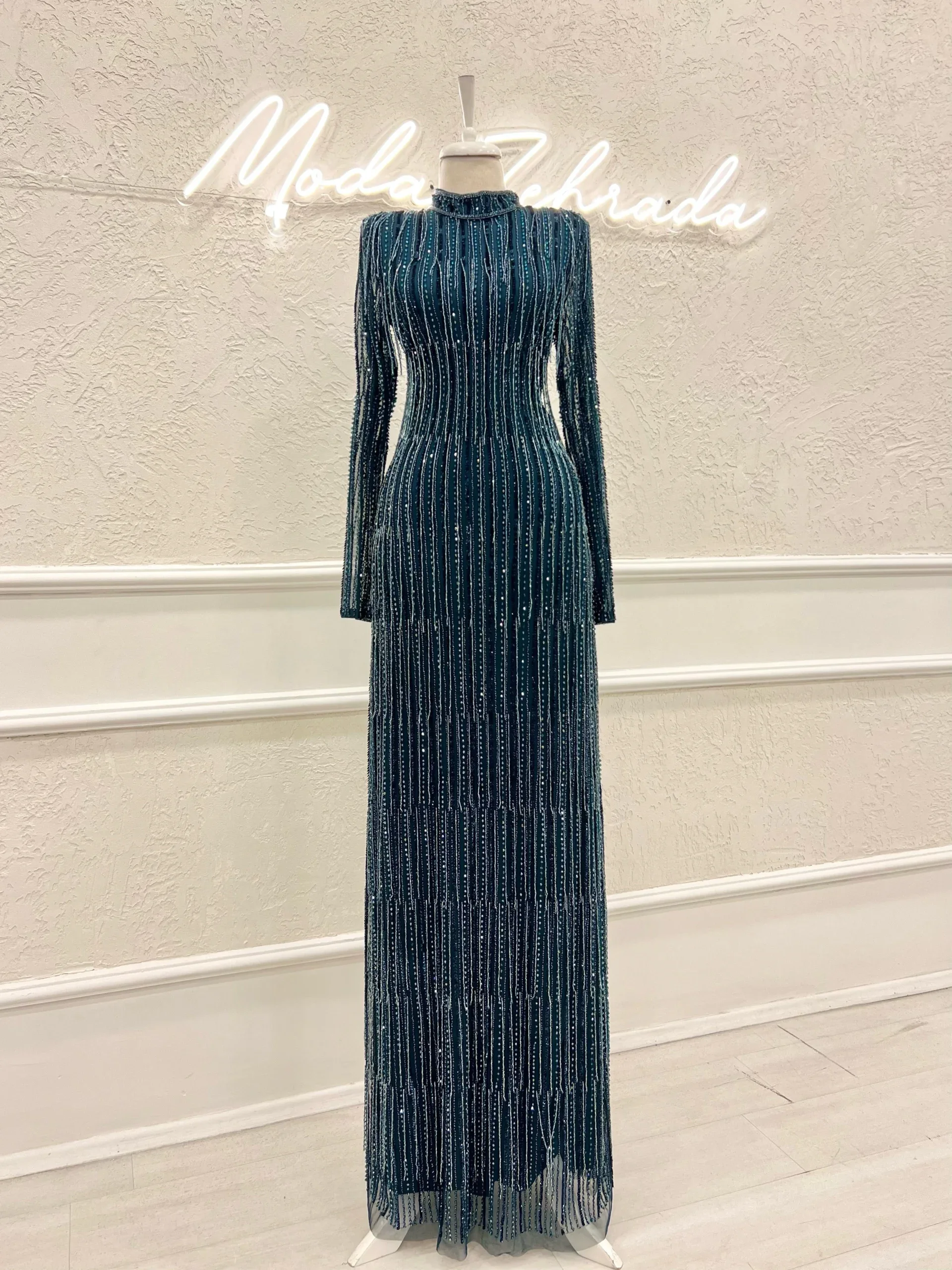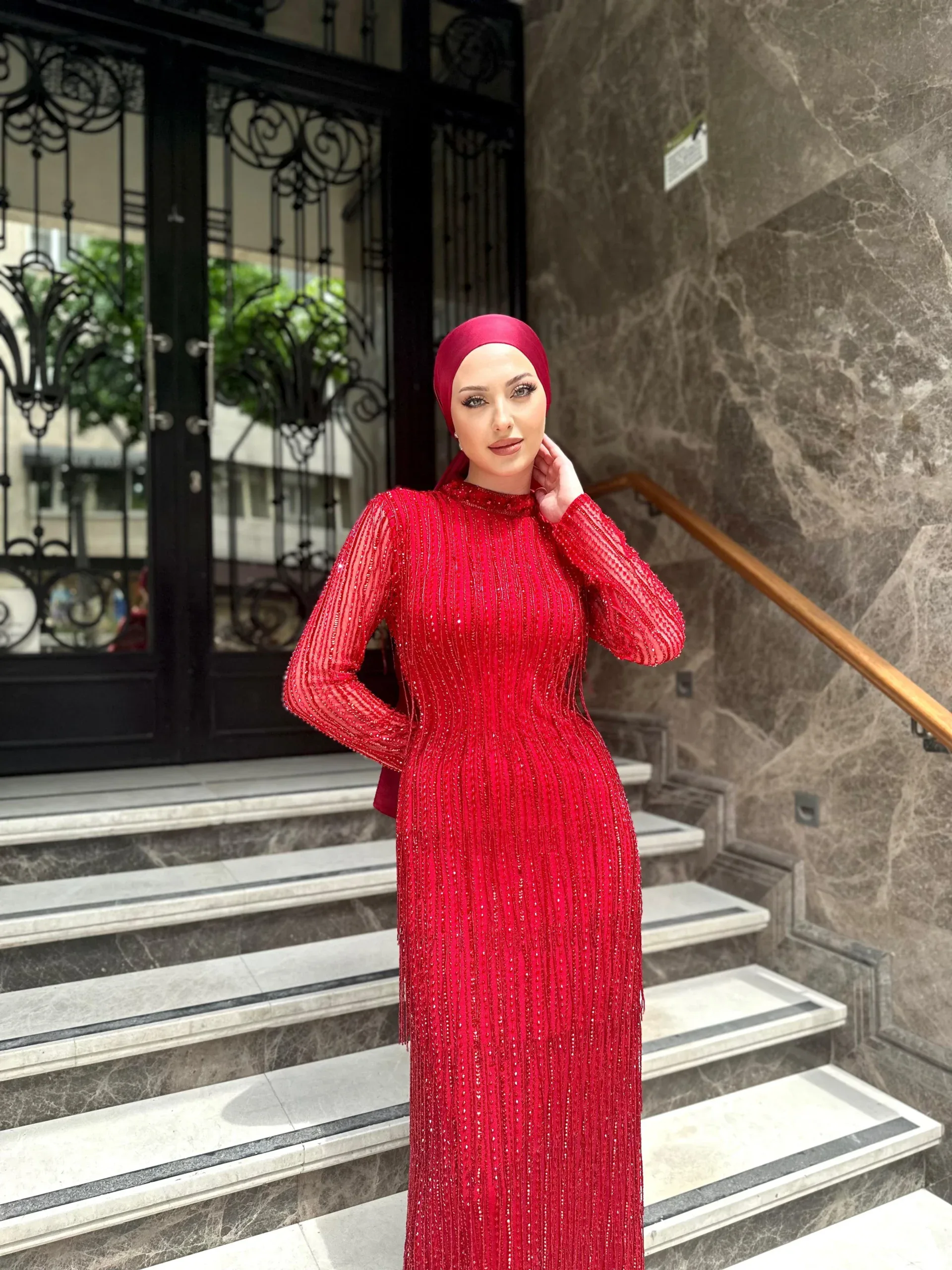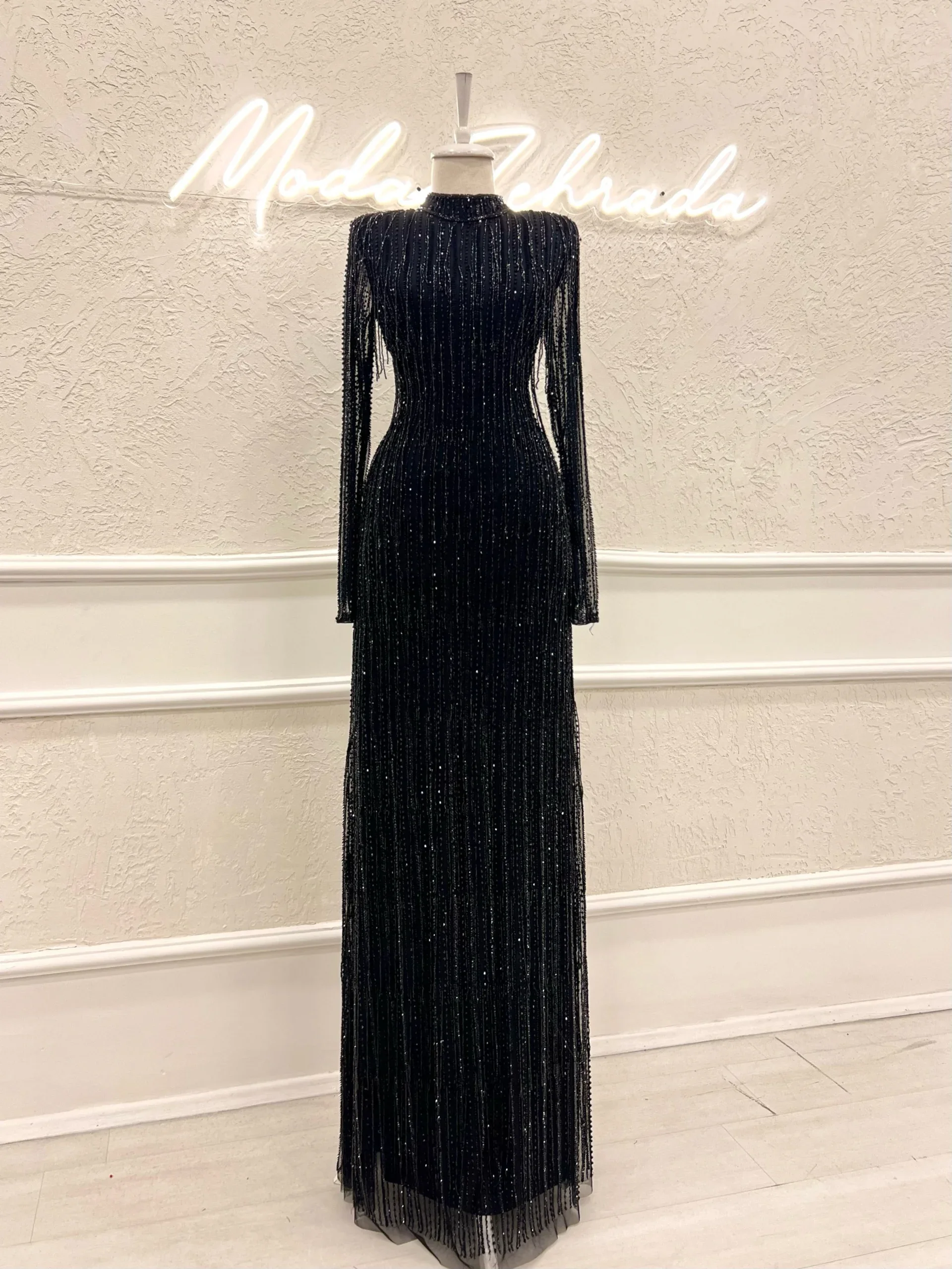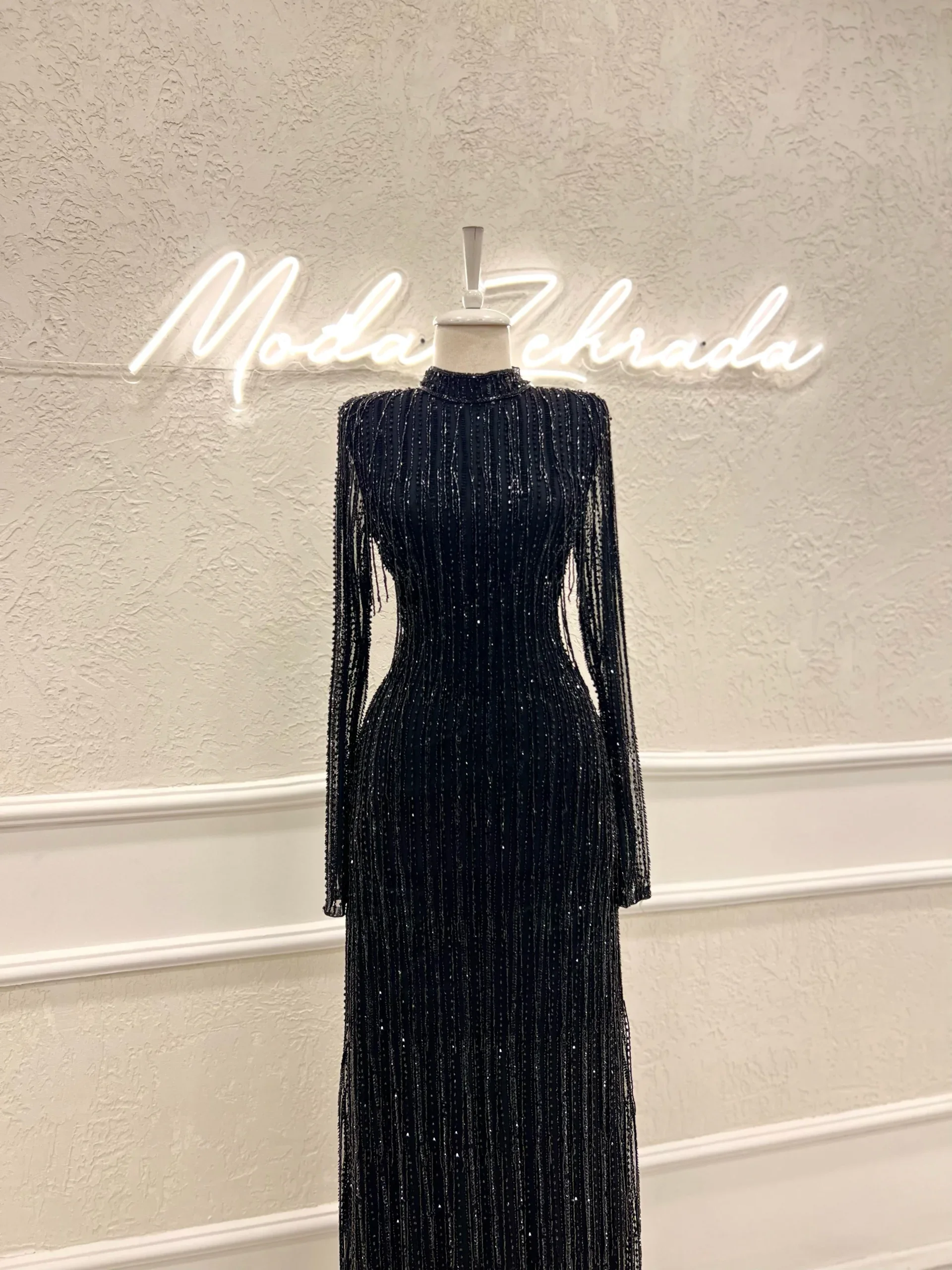 The Couture Melinda Evening Dress features a pencil silhouette with a length of 170 cm. Made from a stretchable fabric, it offers a perfect fit with a 2-3 cm allowance. The dress is designed with a turtleneck and a back zipper closure. The sleeves are transparent, and the dress is adorned with sequin, stone, and bead embellishments. Both the front and back of the dress feature fringe details. Note: The transparent sleeve details can be covered upon request. For more information, contact us via WhatsApp at -.