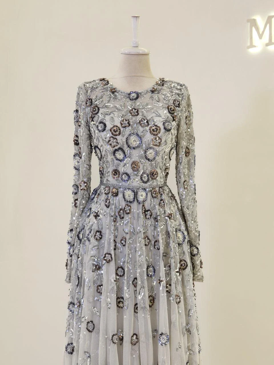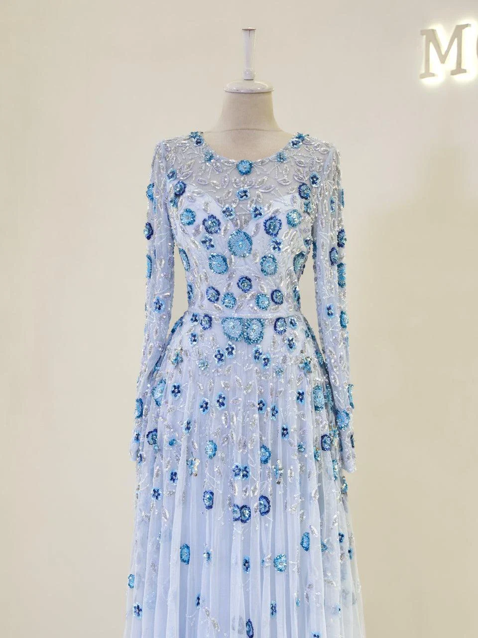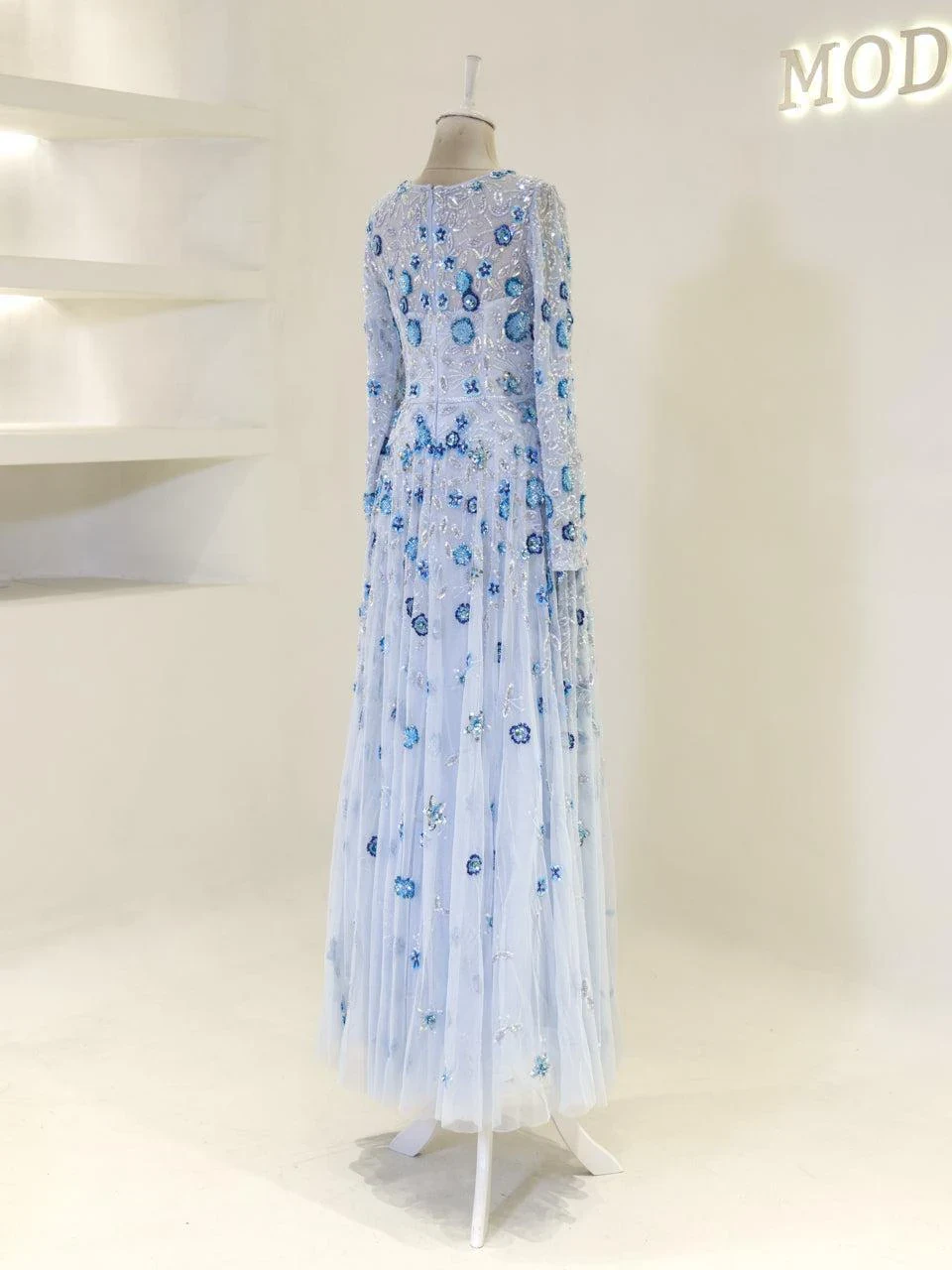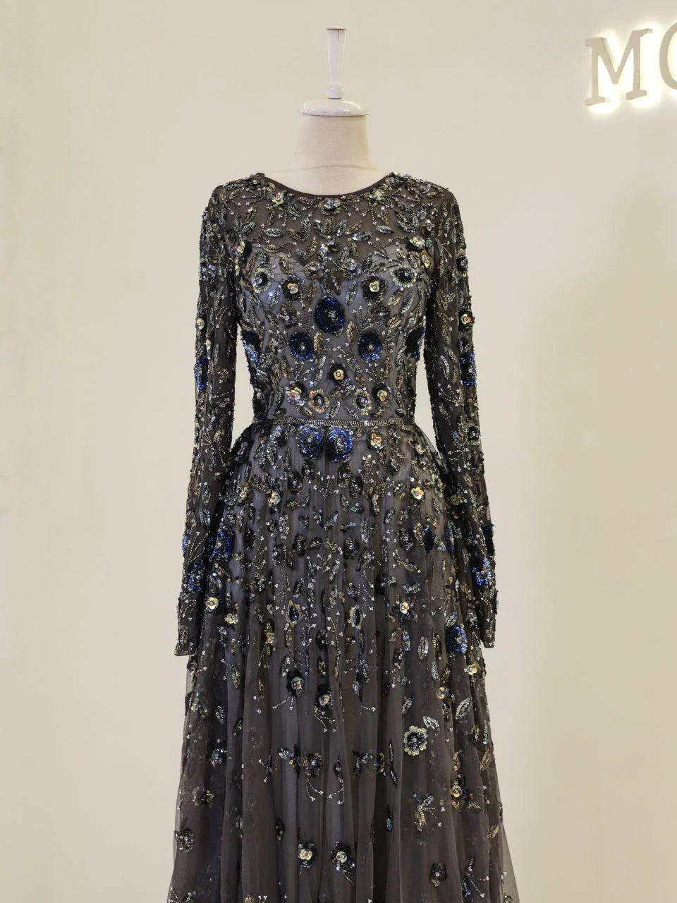 The Couture Mignon Modest Evening Dress is designed with precision, offering a true-to-size fit and an average length of 170 cm. Crafted from tulle fabric, this dress features a lined interior and a wide neckline. It is equipped with a back zipper for easy wear. Unlike glued embellishments, the dress boasts sewn details. The sleeves and chest areas are transparent, adding a sophisticated touch, while the voluminous skirt enhances the overall silhouette. Note: Upon request, the transparent sleeve and chest details can be covered. For further information, please contact our WhatsApp line at -.