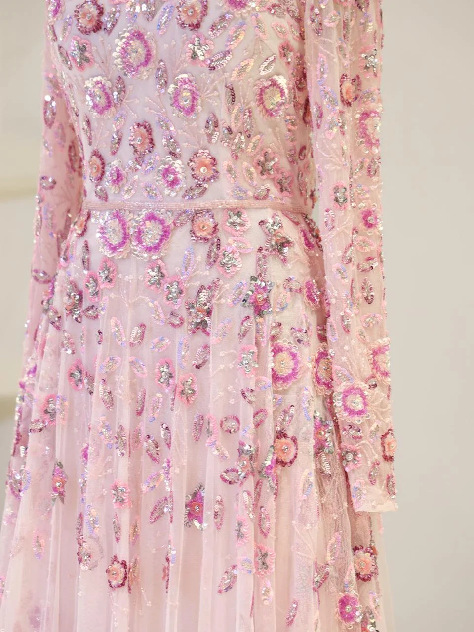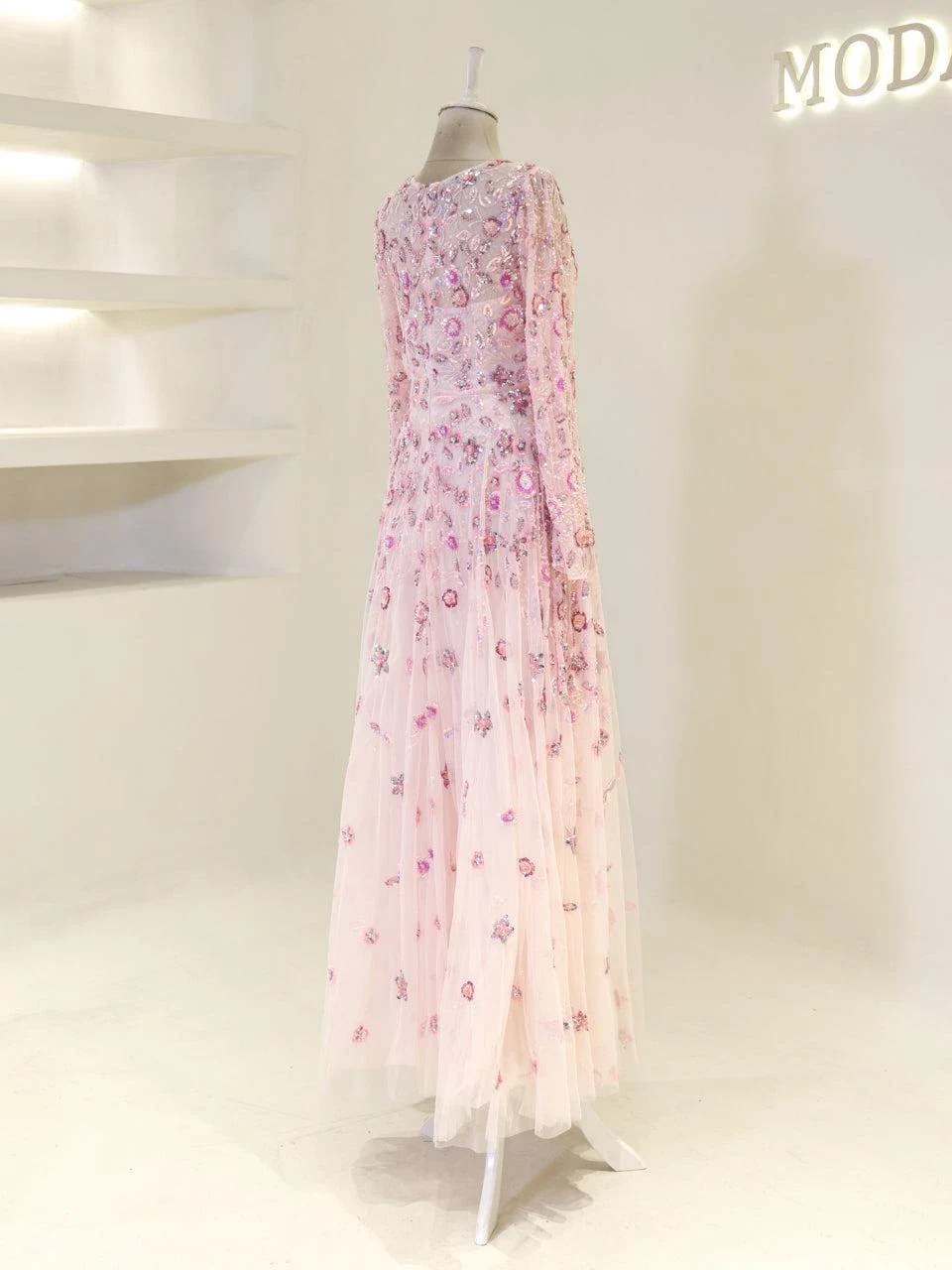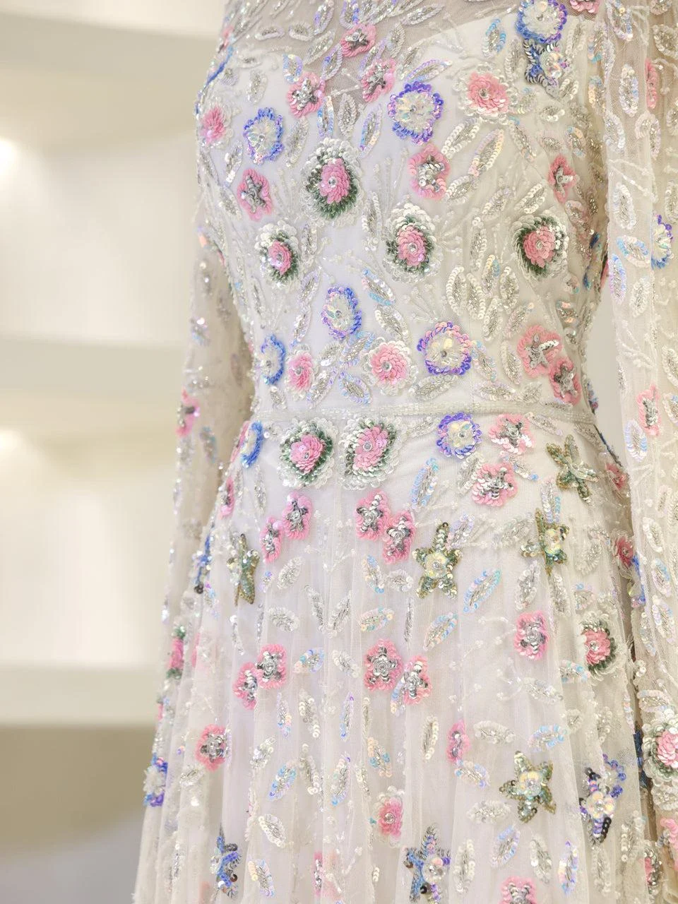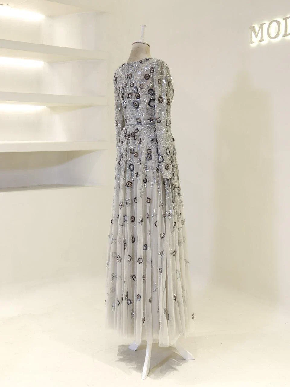 The Couture Mignon Modest Evening Dress is designed with precision, offering a true-to-size fit and an average length of 170 cm. Crafted from tulle fabric, this dress features a lined interior and a wide neckline. It is equipped with a back zipper for easy wear. Unlike glued embellishments, the dress boasts sewn details. The sleeves and chest areas are transparent, adding a sophisticated touch, while the voluminous skirt enhances the overall silhouette. Note: Upon request, the transparent sleeve and chest details can be covered. For further information, please contact our WhatsApp line at -.