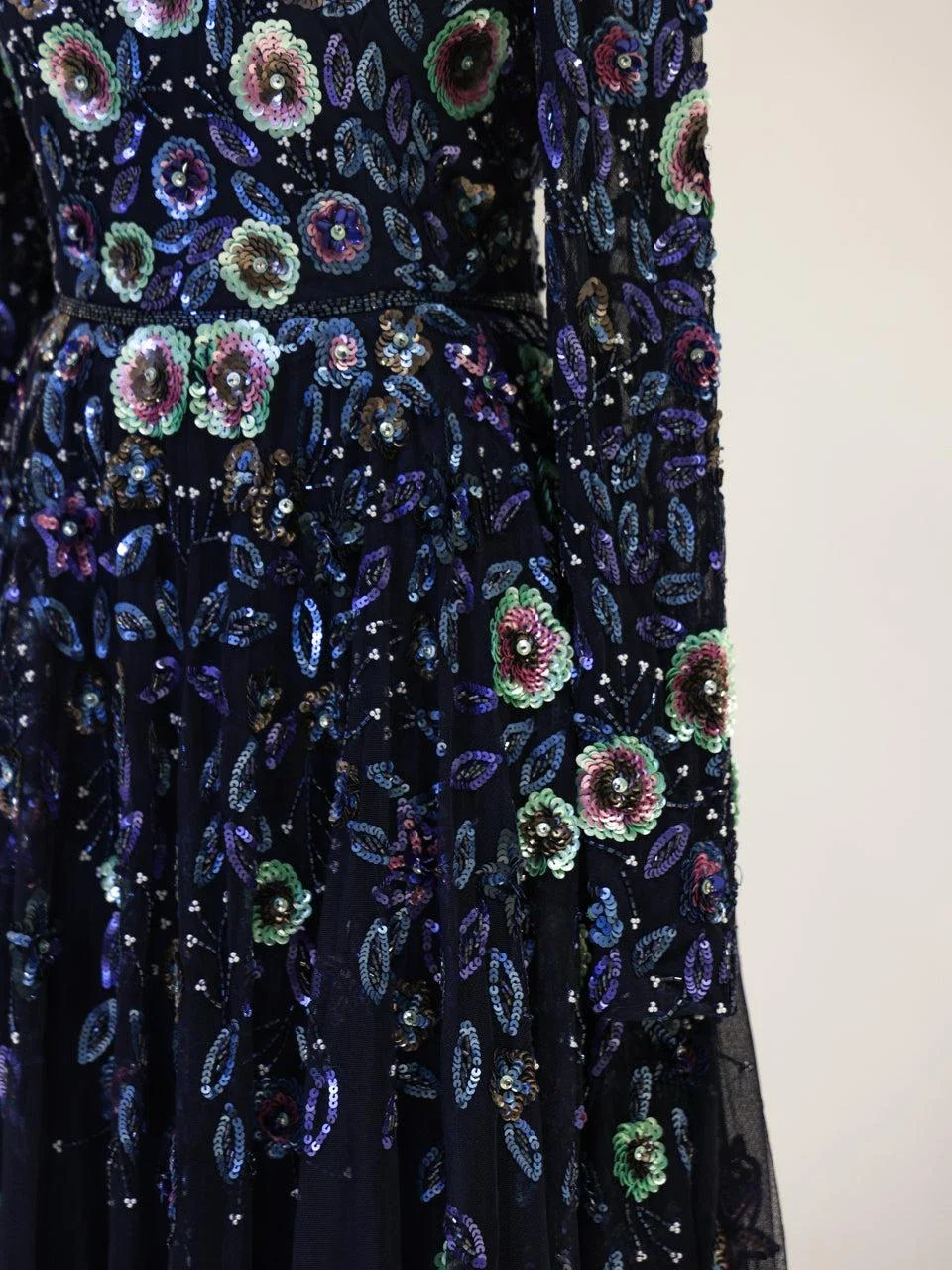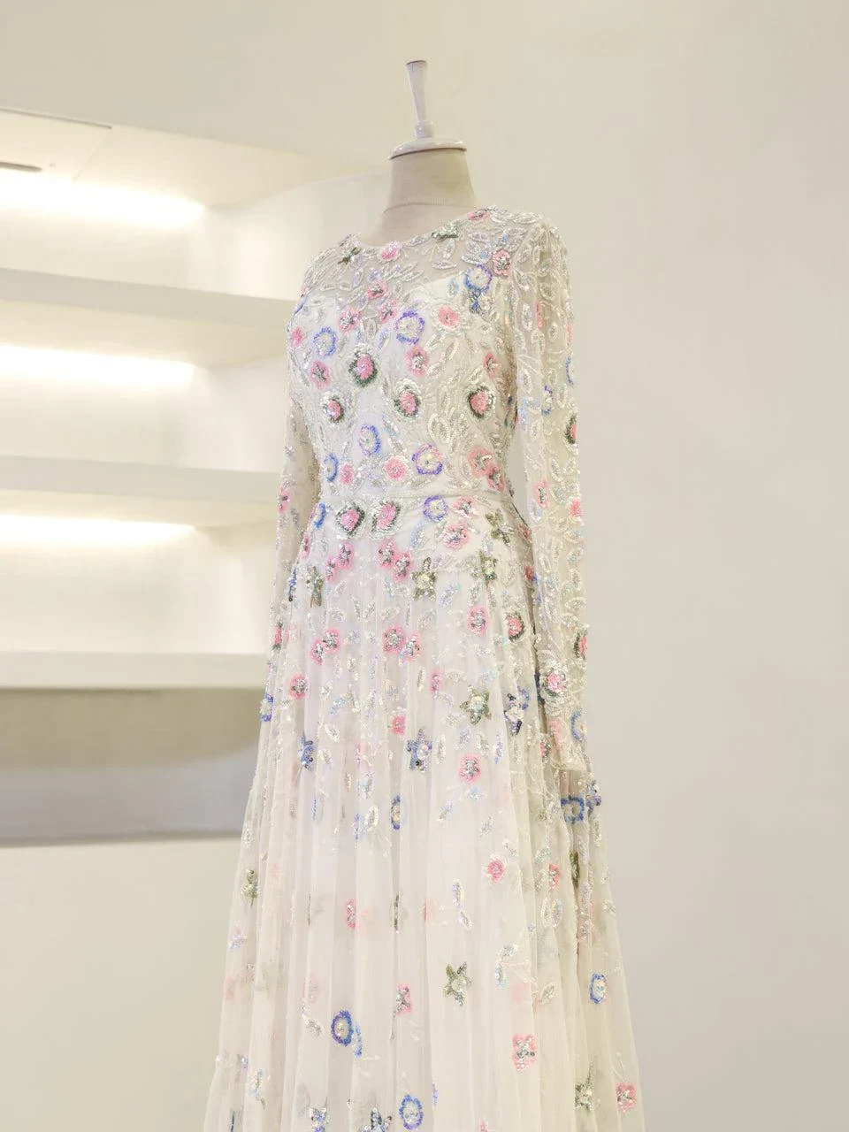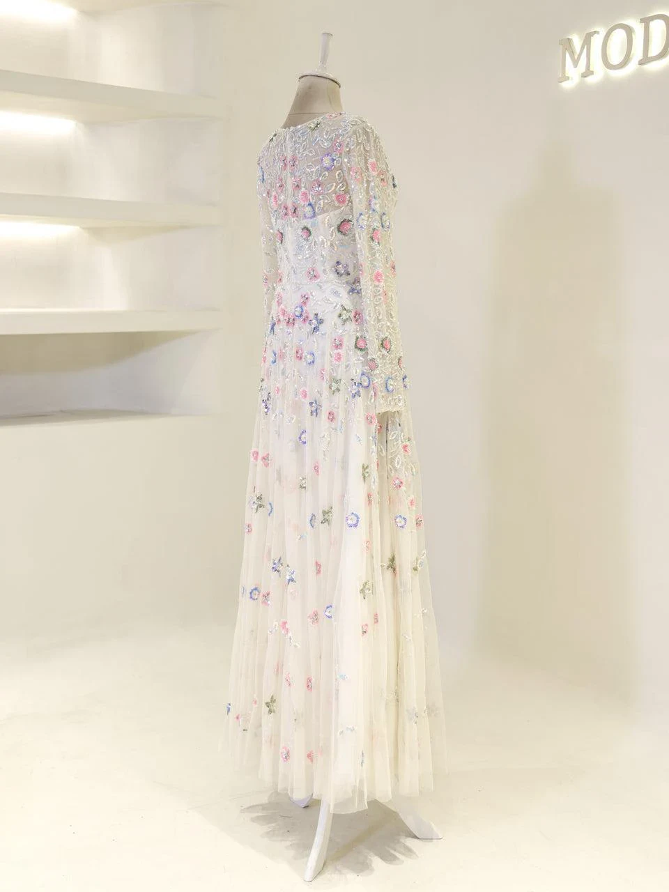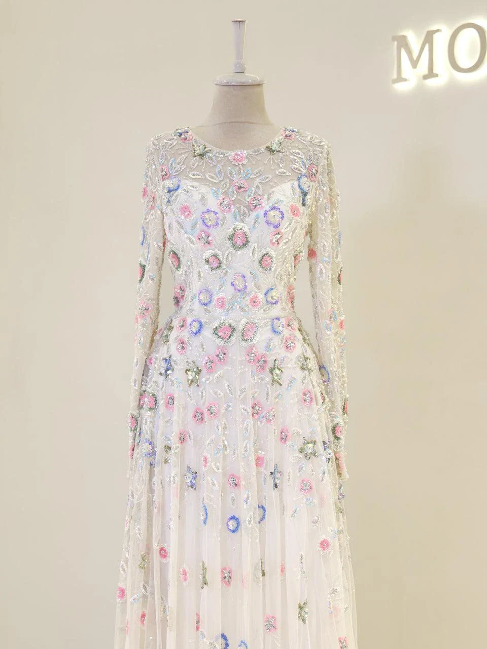 The Couture Mignon Modest Evening Dress is designed with precision, offering a true-to-size fit and an average length of 170 cm. Crafted from tulle fabric, this dress features a lined interior and a wide neckline. It is equipped with a back zipper for easy wear. Unlike glued embellishments, the dress boasts sewn details. The sleeves and chest areas are transparent, adding a sophisticated touch, while the voluminous skirt enhances the overall silhouette. Note: Upon request, the transparent sleeve and chest details can be covered. For further information, please contact our WhatsApp line at -.