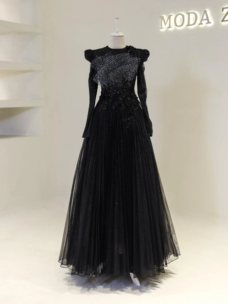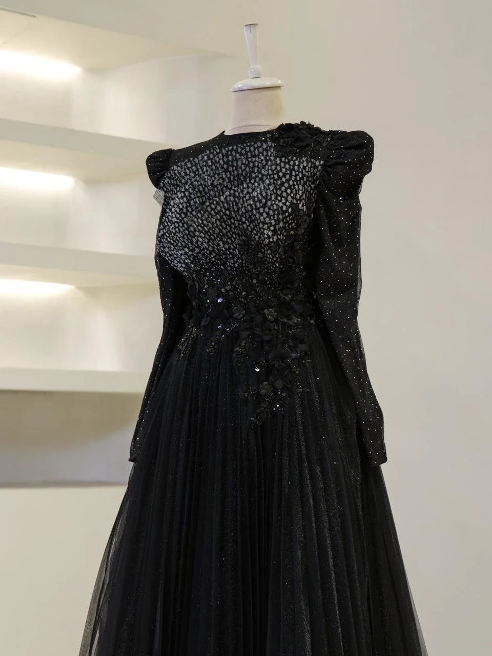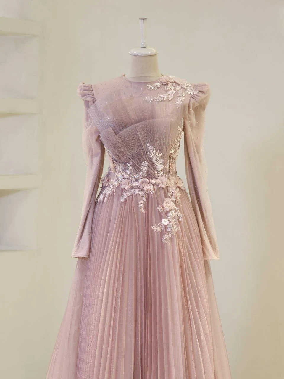 The Couture Misra Modest Evening Dress is designed to offer elegance and comfort. It is crafted from orchid fabric and includes a lining for added comfort. The dress has an average front length of 160 cm and an average back length of 180 cm, providing a sophisticated silhouette. The dress features a pleated skirt and a zipper closure at the back. The embellishments are securely attached, ensuring durability.