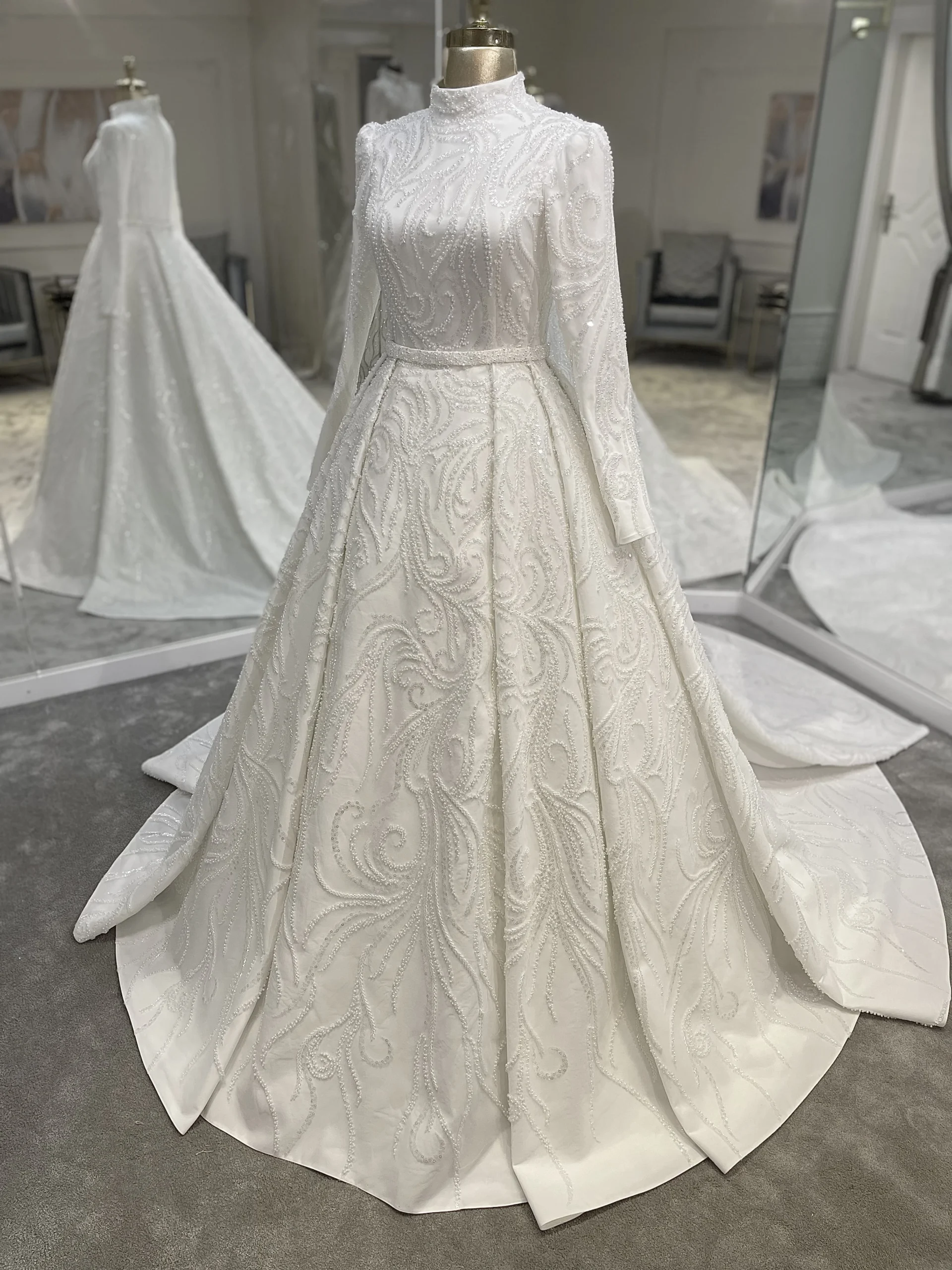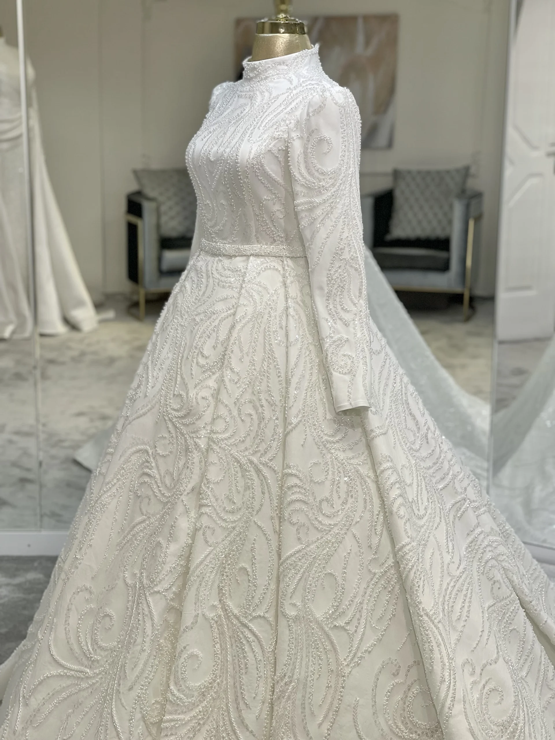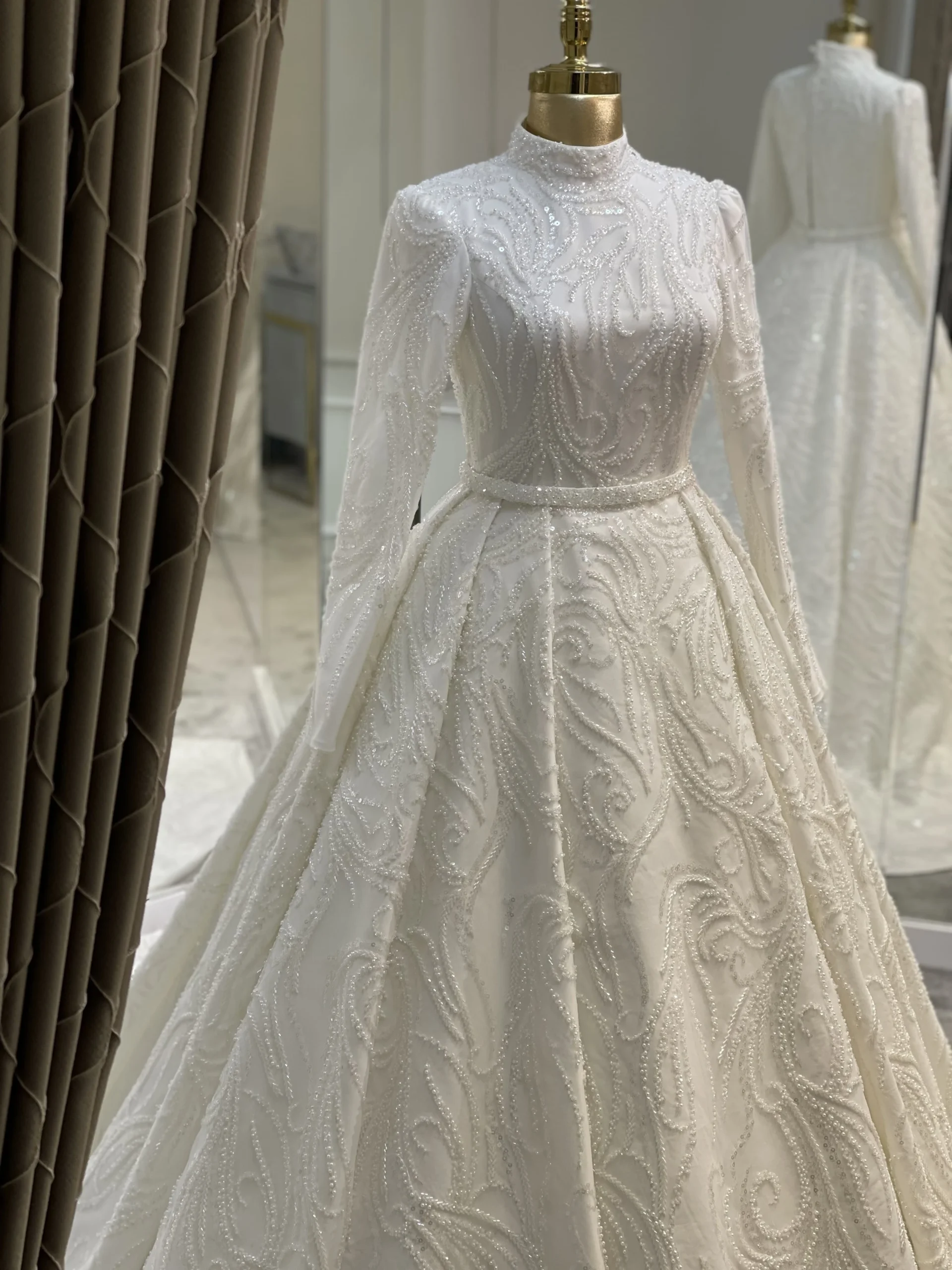 The Couture Pearl Embellished Modest Wedding Dress is a custom-made garment tailored to your specific measurements. The average preparation time for this dress is approximately 20-25 days. This special design features handcrafted embellishments. A veil can be added upon request. For pricing information, please contact the number provided below. For detailed information and remote fitting, reach out to us via our WhatsApp line at -. IMPORTANT: In our custom-made models, slight variations in embellishments may occur as the size increases.