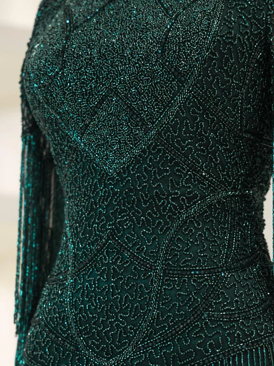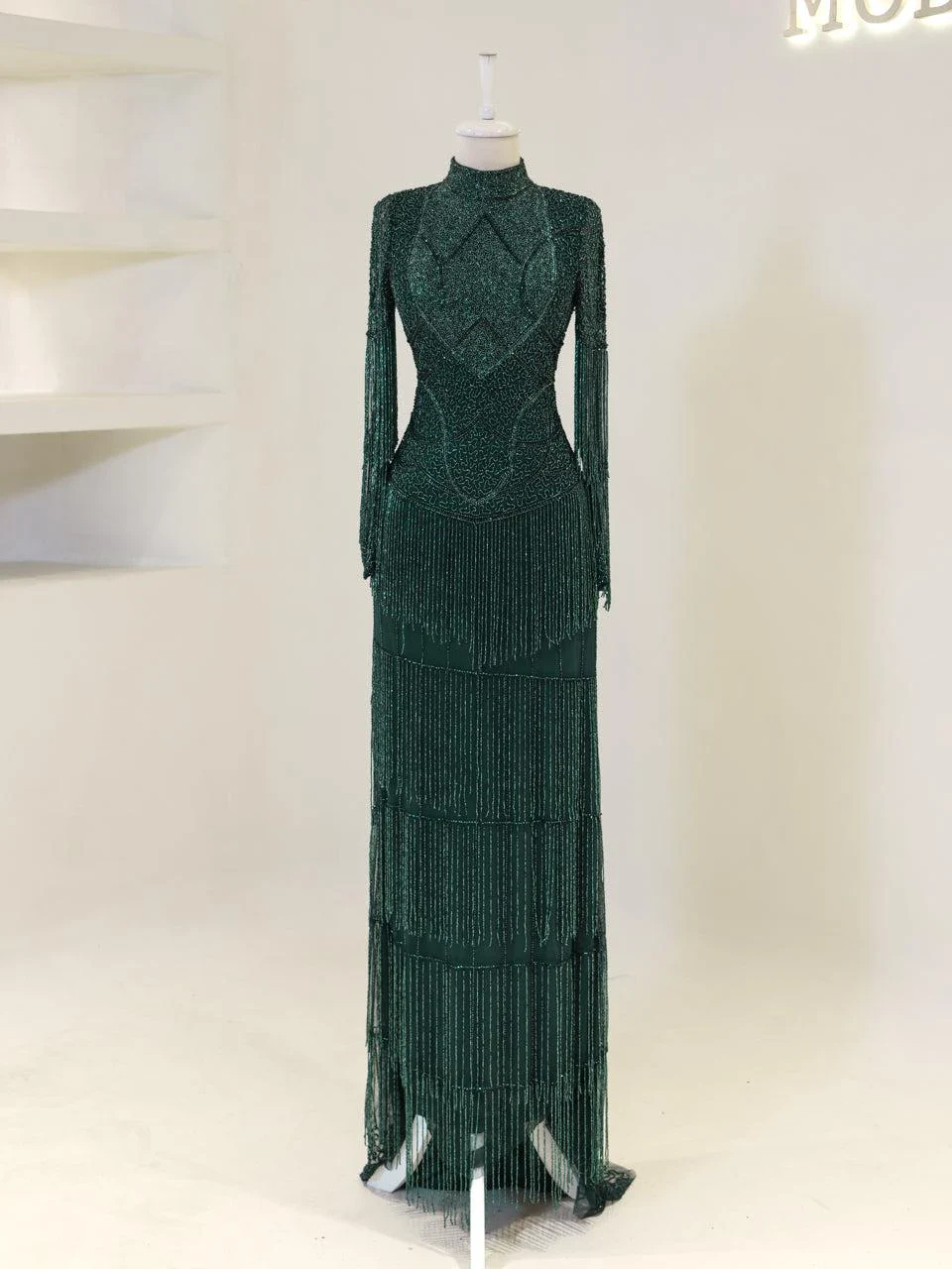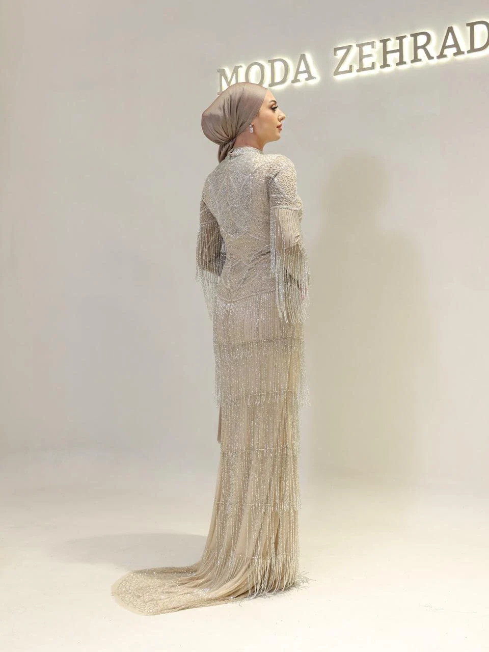 The Couture Rita Modest Evening Dress is designed with a precise fit, featuring an average front length of 165 cm and a back length of 190 cm. The dress is lined and includes a back zipper for ease of wear. Unlike glued embellishments, the detailing is securely attached. The sleeves are transparent, adding a unique touch to the pencil-shaped design, which also offers a flexible structure. Note: Upon request, the transparent sleeve details can be covered. For pricing and further information, please contact us via WhatsApp at -.