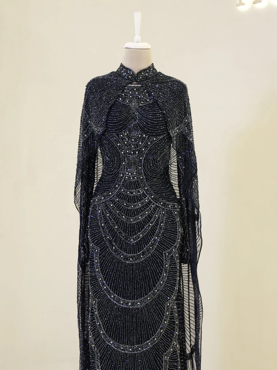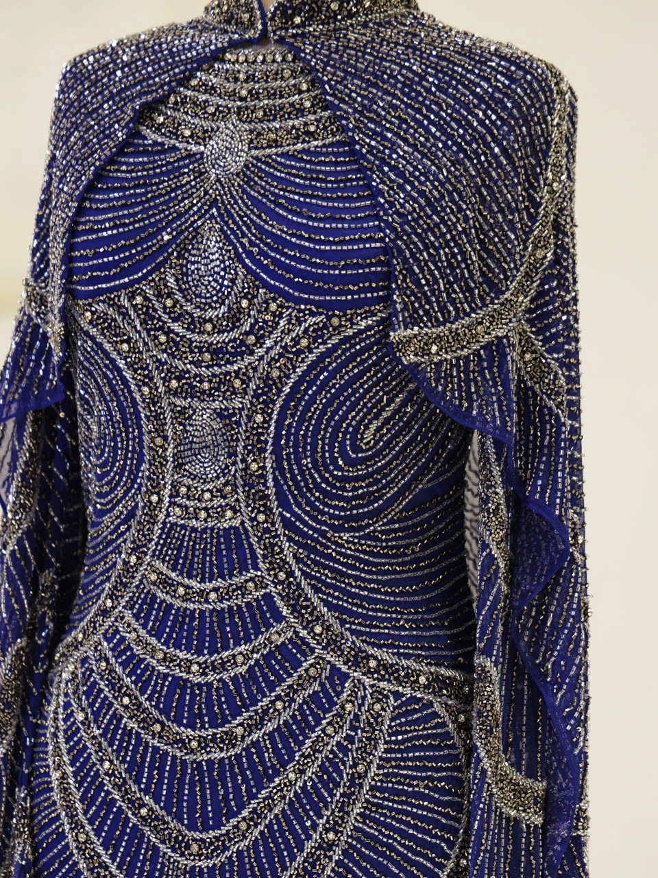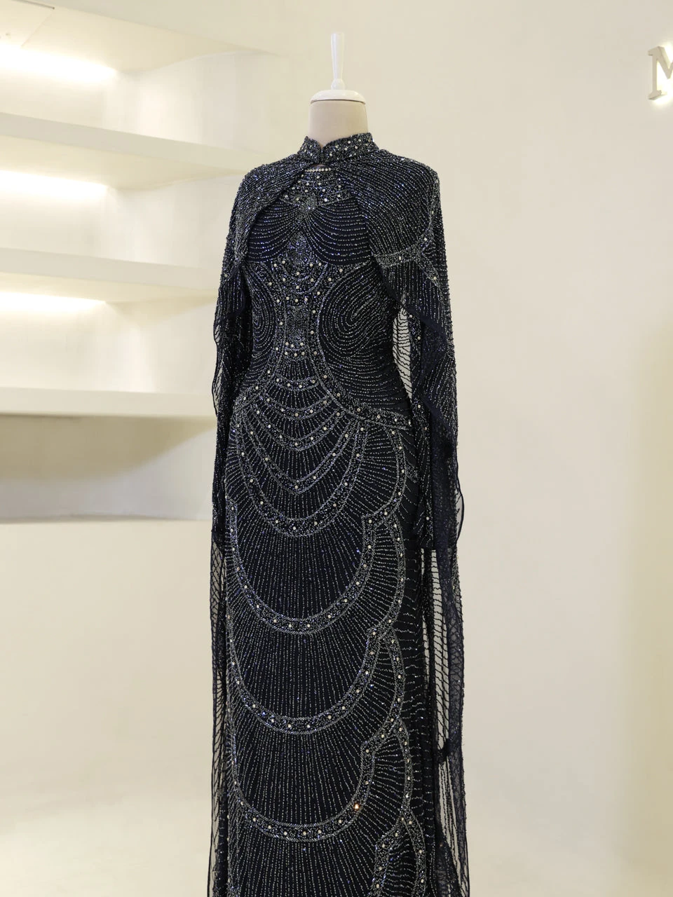 The Couture Sorev Modest Evening Dress is designed with precision, offering a true-to-size fit and an average length of 160 cm. It features a back zipper for easy wear and is crafted from an embroidered stretch fabric. The dress includes a detachable cape detail and is fully lined for comfort. It has a pencil skirt silhouette and transparent sleeves, which can be customized upon request. For more details, please contact our WhatsApp line.