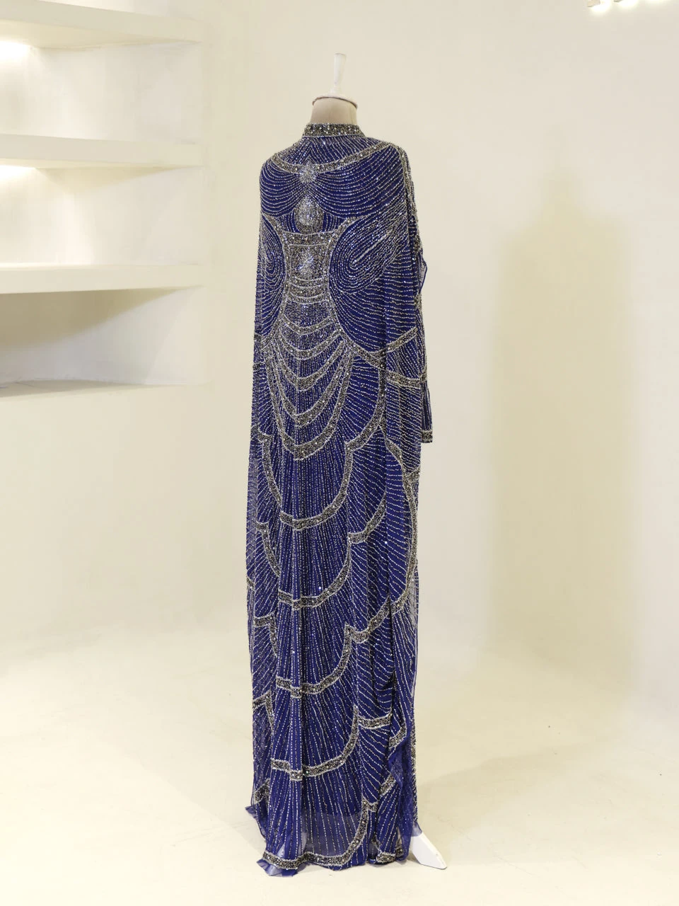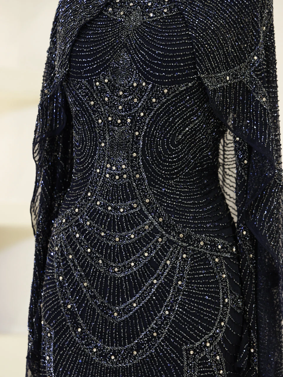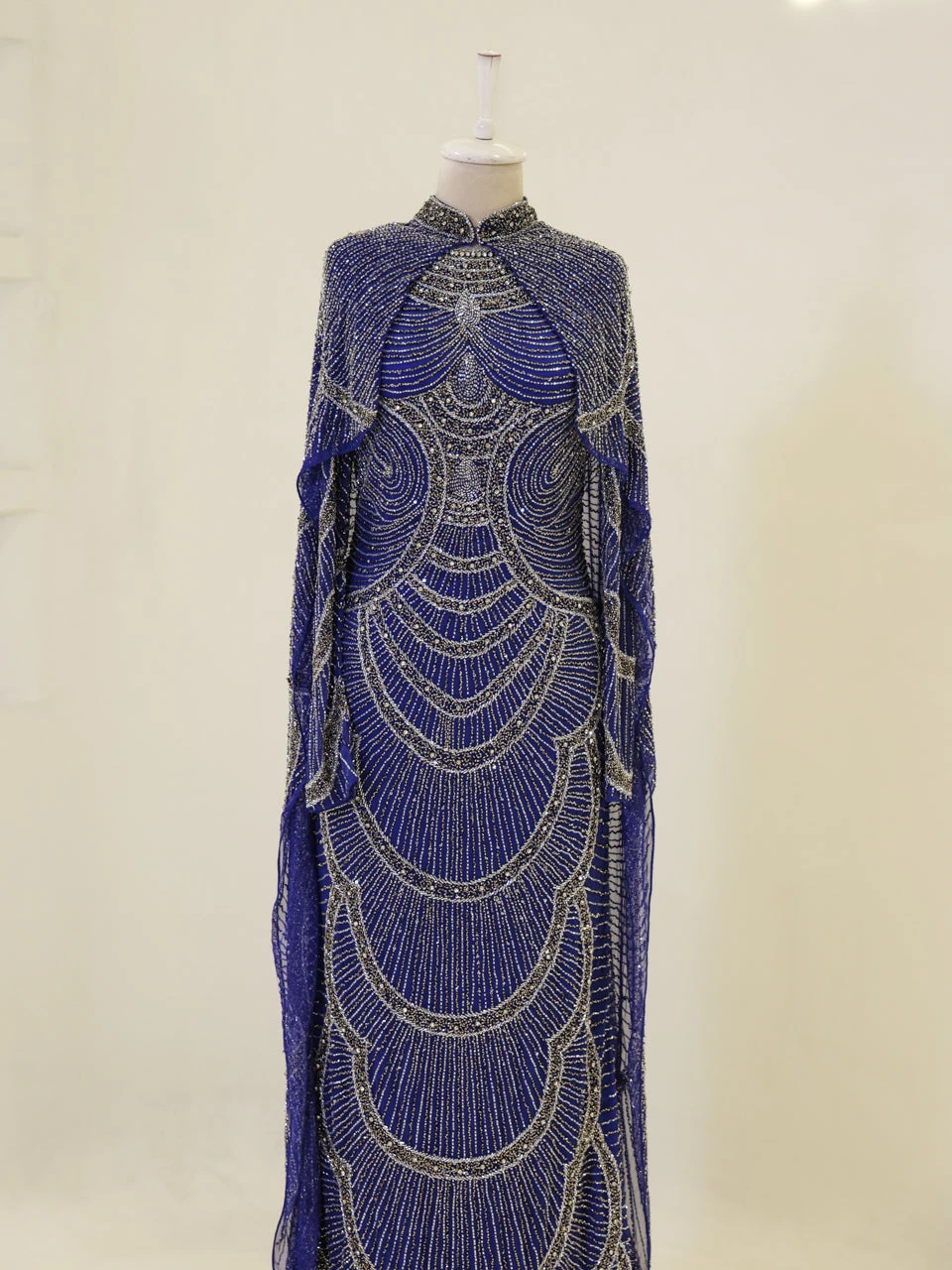 The Couture Sorev Modest Evening Dress is designed with precision, offering a true-to-size fit and an average length of 160 cm. It features a back zipper for easy wear and is crafted from an embroidered stretch fabric. The dress includes a detachable cape detail and is fully lined for comfort. It has a pencil skirt silhouette and transparent sleeves, which can be customized upon request. For more details, please contact our WhatsApp line.