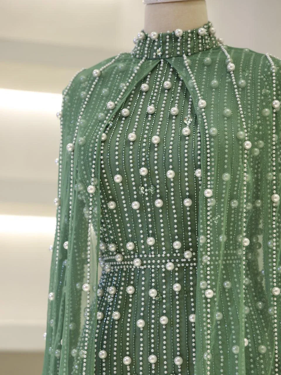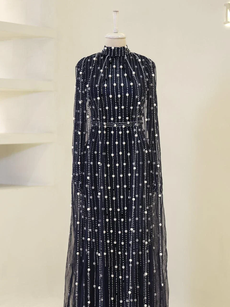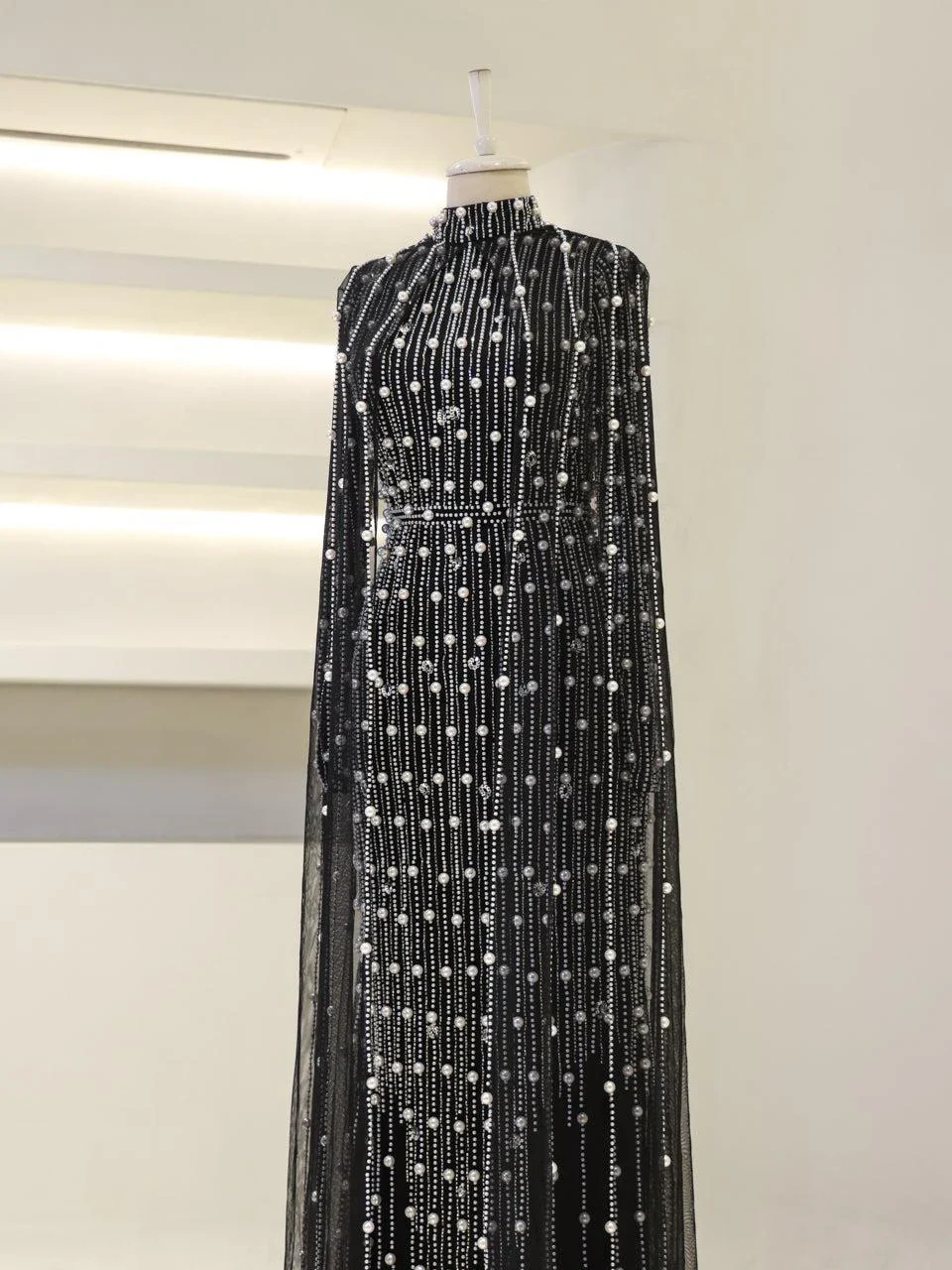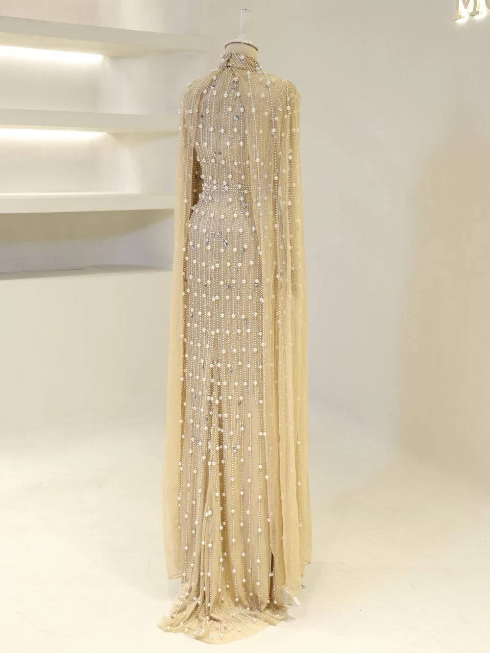The Couture Tasha Modest Evening Dress is designed to fit true to size with an average length of 170 cm. It features non-adhesive embellishments and is fully lined for comfort. The dress has a back zipper closure and a turtleneck design. The sleeves are transparent, and it includes a cape detail. The dress is in a pencil form. Note: Upon request, the transparent sleeve details can be covered. For pricing information, please contact us via WhatsApp.