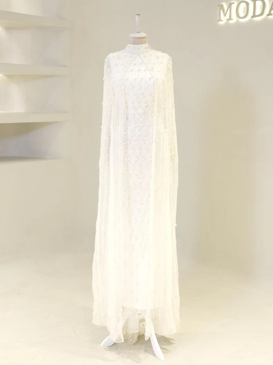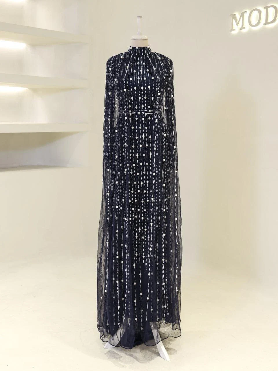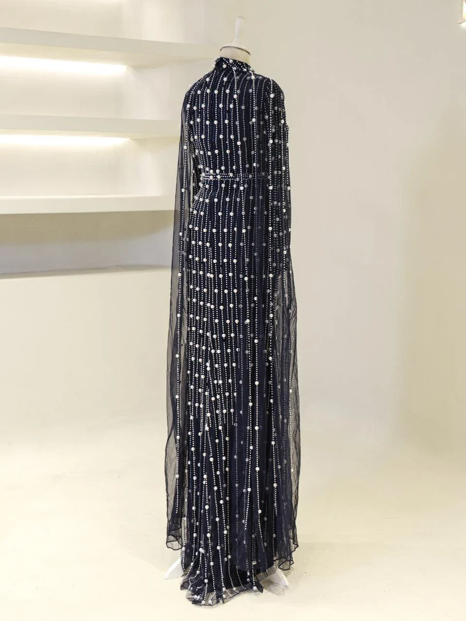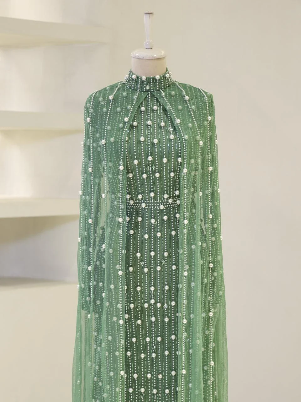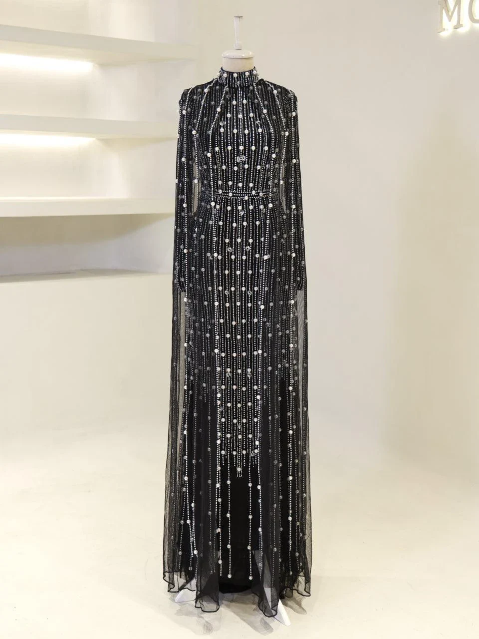 The Couture Tasha Modest Evening Dress is designed to fit true to size with an average length of 170 cm. It features non-adhesive embellishments and is fully lined for comfort. The dress has a back zipper closure and a turtleneck design. The sleeves are transparent, and it includes a cape detail. The dress is in a pencil form. Note: Upon request, the transparent sleeve details can be covered. For pricing information, please contact us via WhatsApp.