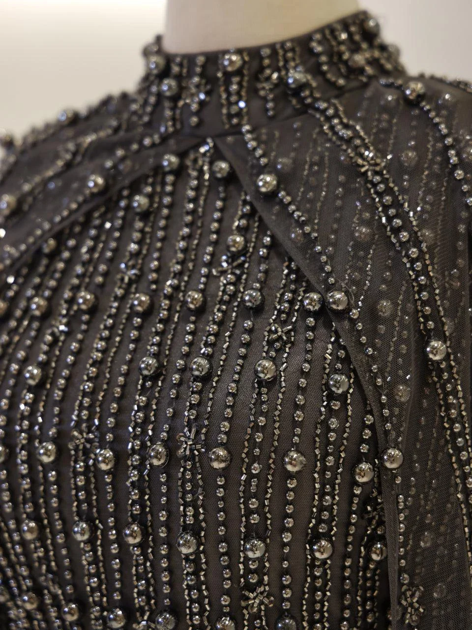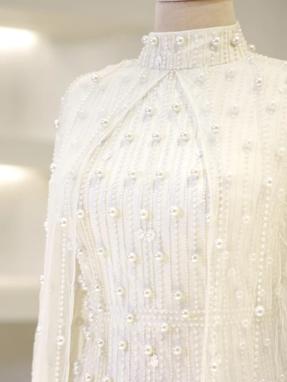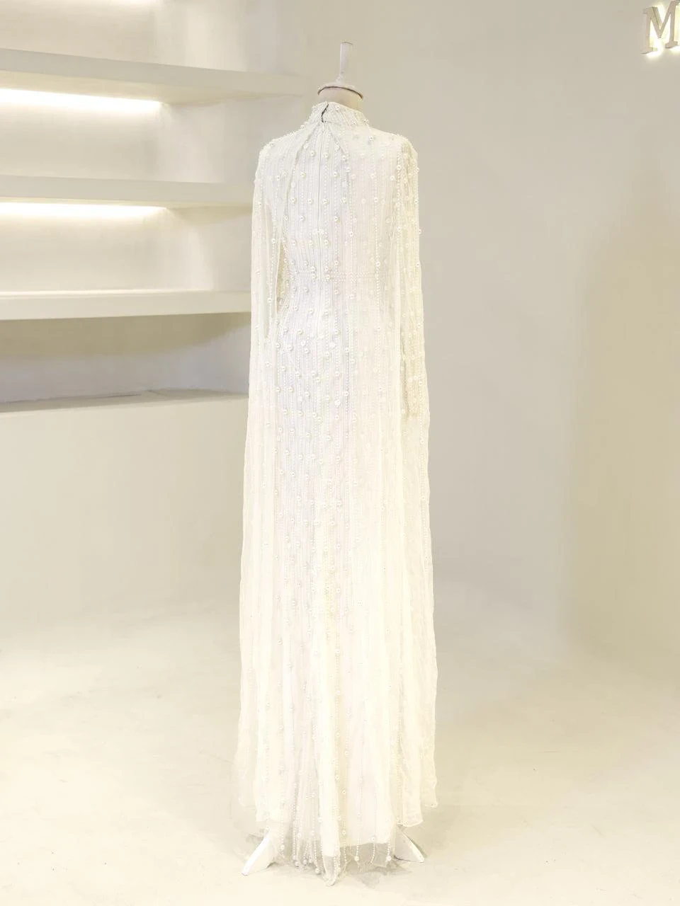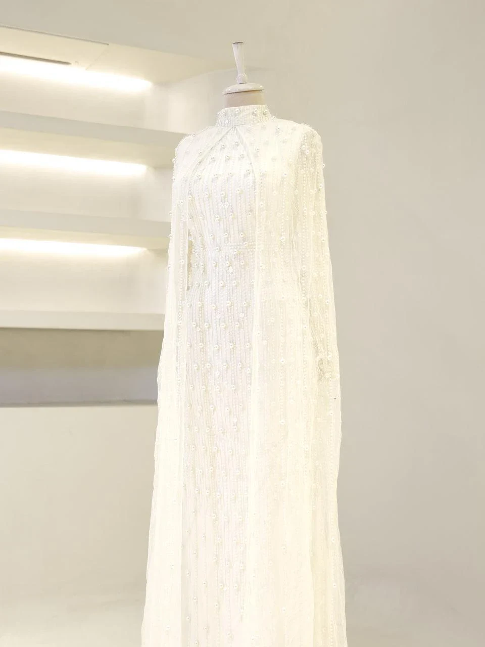 The Couture Tasha Modest Evening Dress is designed to fit true to size with an average length of 170 cm. It features non-adhesive embellishments and is fully lined for comfort. The dress has a back zipper closure and a turtleneck design. The sleeves are transparent, and it includes a cape detail. The dress is in a pencil form. Note: Upon request, the transparent sleeve details can be covered. For pricing information, please contact us via WhatsApp.