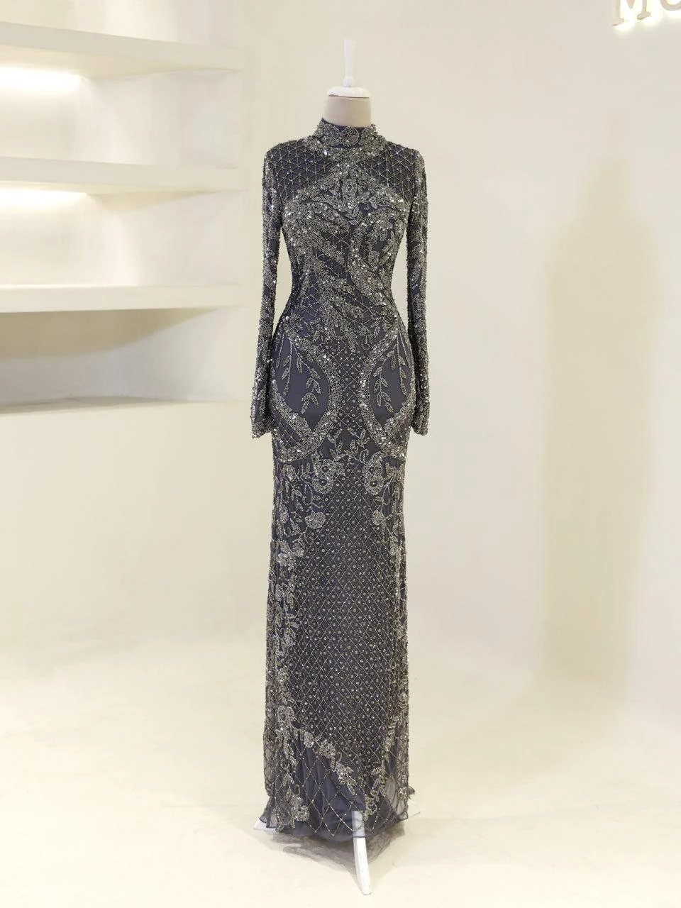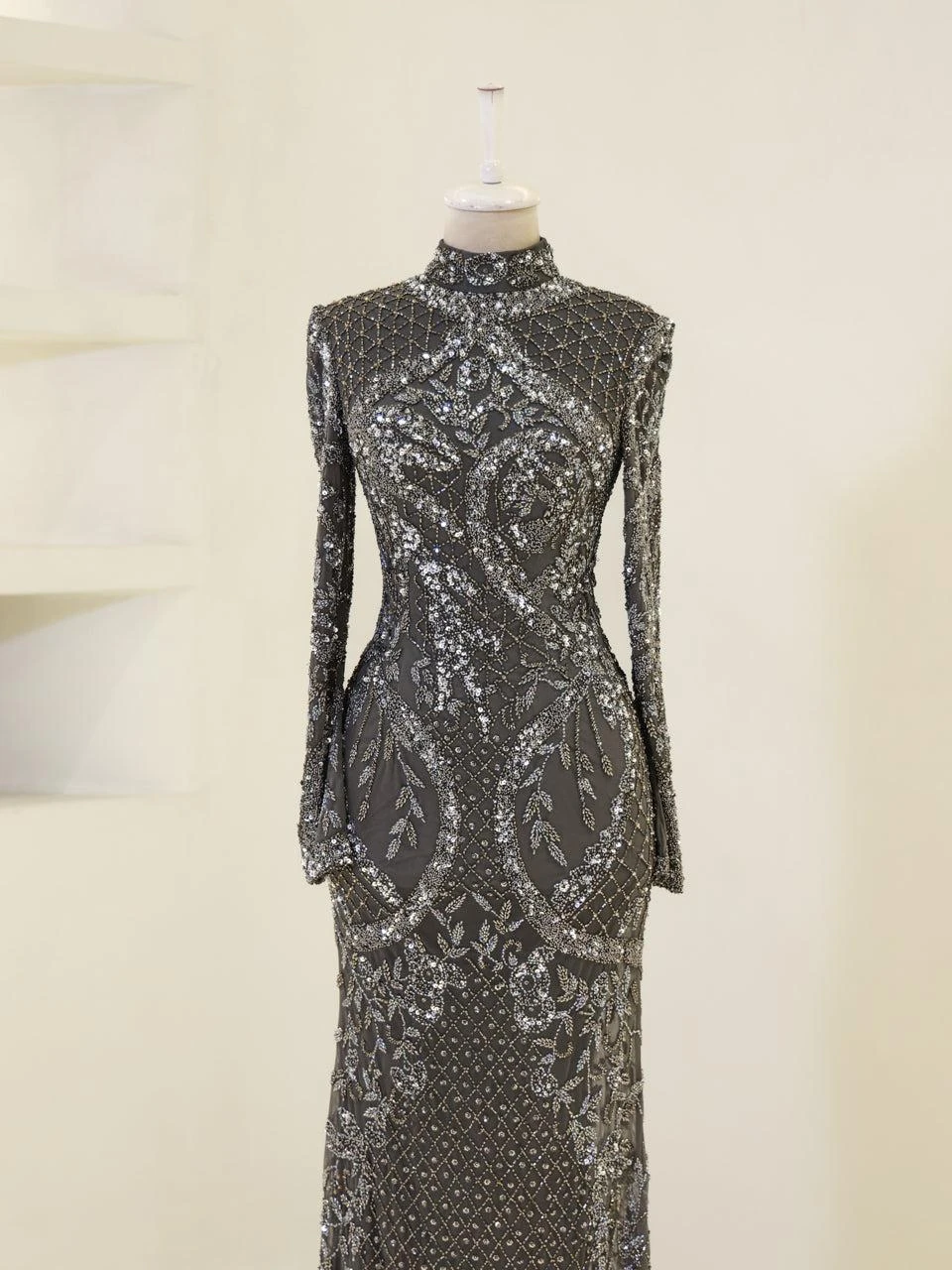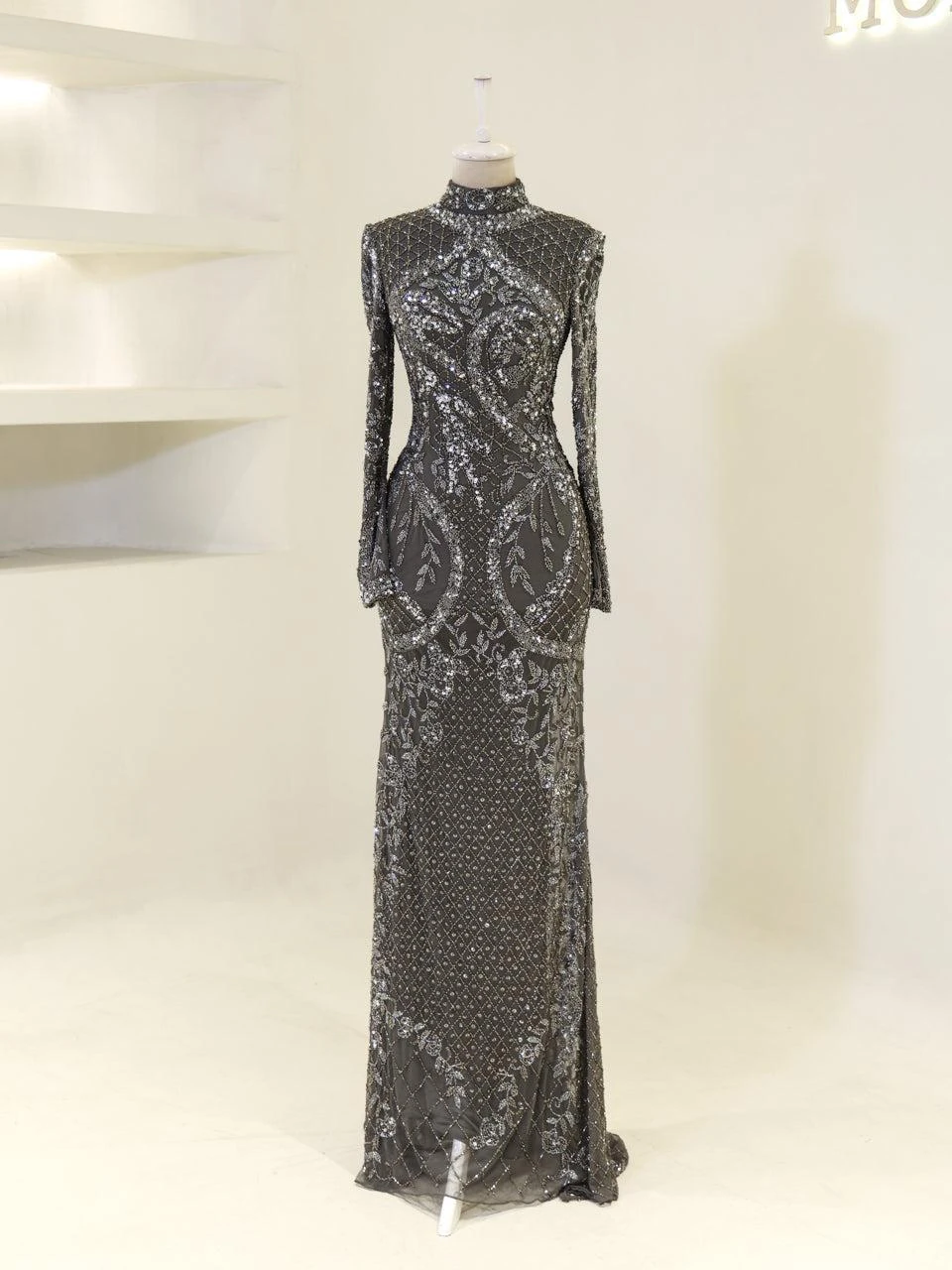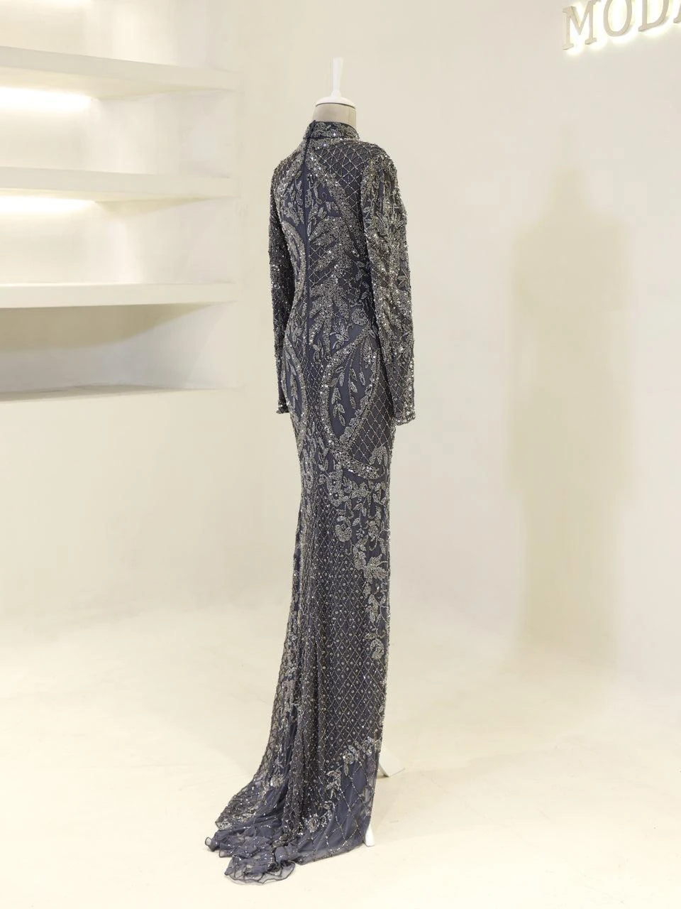 The Couture Trieste Modest Evening Dress is crafted with precision to offer a perfect fit. The dress measures approximately 160 cm in length and features a train for added elegance. It is designed with a back zipper for easy wear. Made from embroidered stretch fabric, it includes a lining for comfort. The dress has a straight skirt design and features transparent sleeves. Note: The transparent sleeve section can be covered upon request. For more details, please contact our WhatsApp line at +90 553 978 48 86.