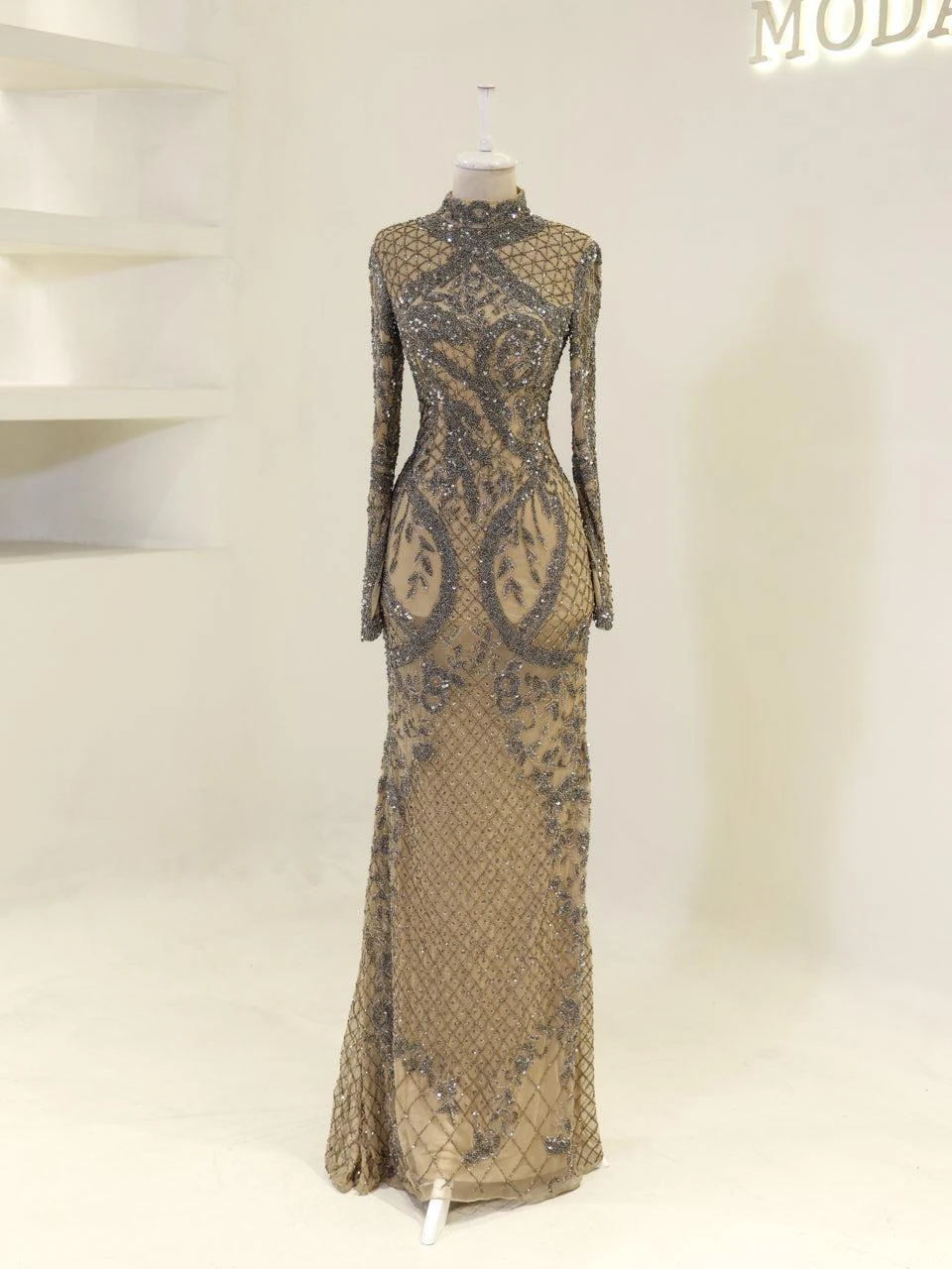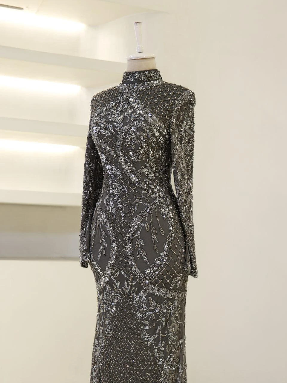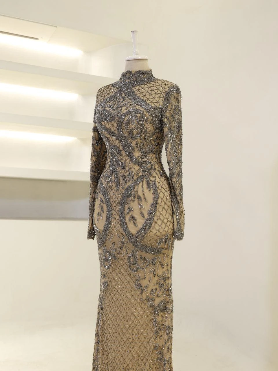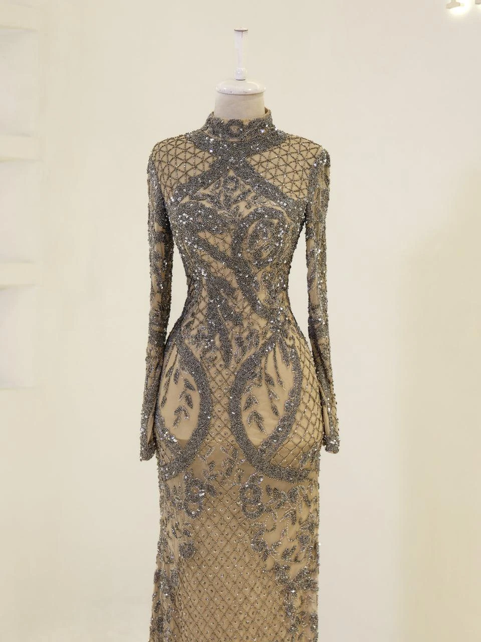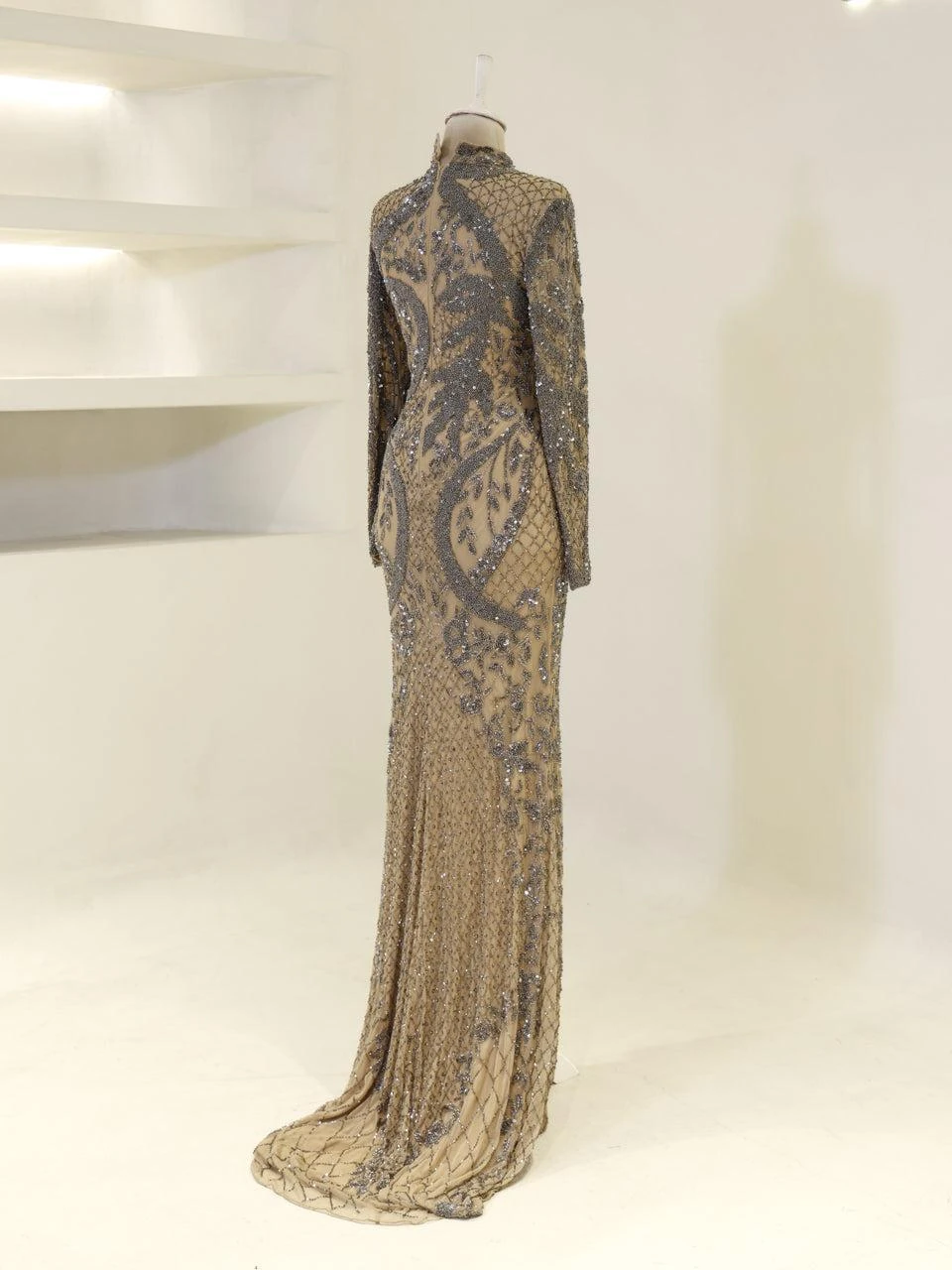 The Couture Trieste Modest Evening Dress is crafted with precision to offer a perfect fit. The dress measures approximately 160 cm in length and features a train for added elegance. It is designed with a back zipper for easy wear. Made from embroidered stretch fabric, it includes a lining for comfort. The dress has a straight skirt design and features transparent sleeves. Note: The transparent sleeve section can be covered upon request. For more details, please contact our WhatsApp line at +90 553 978 48 86.