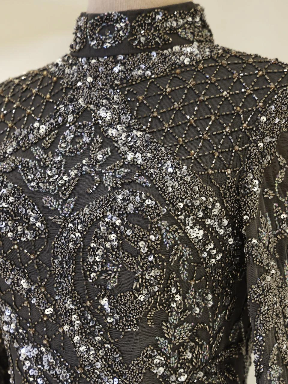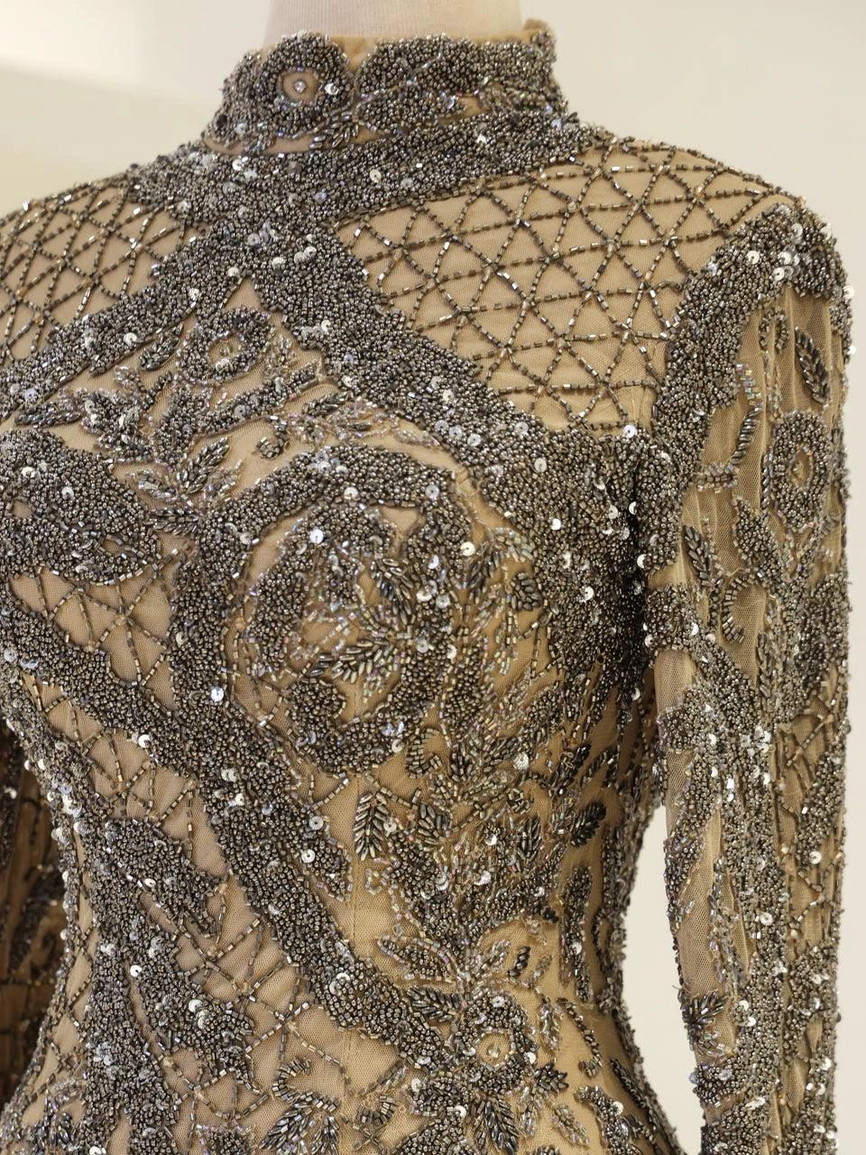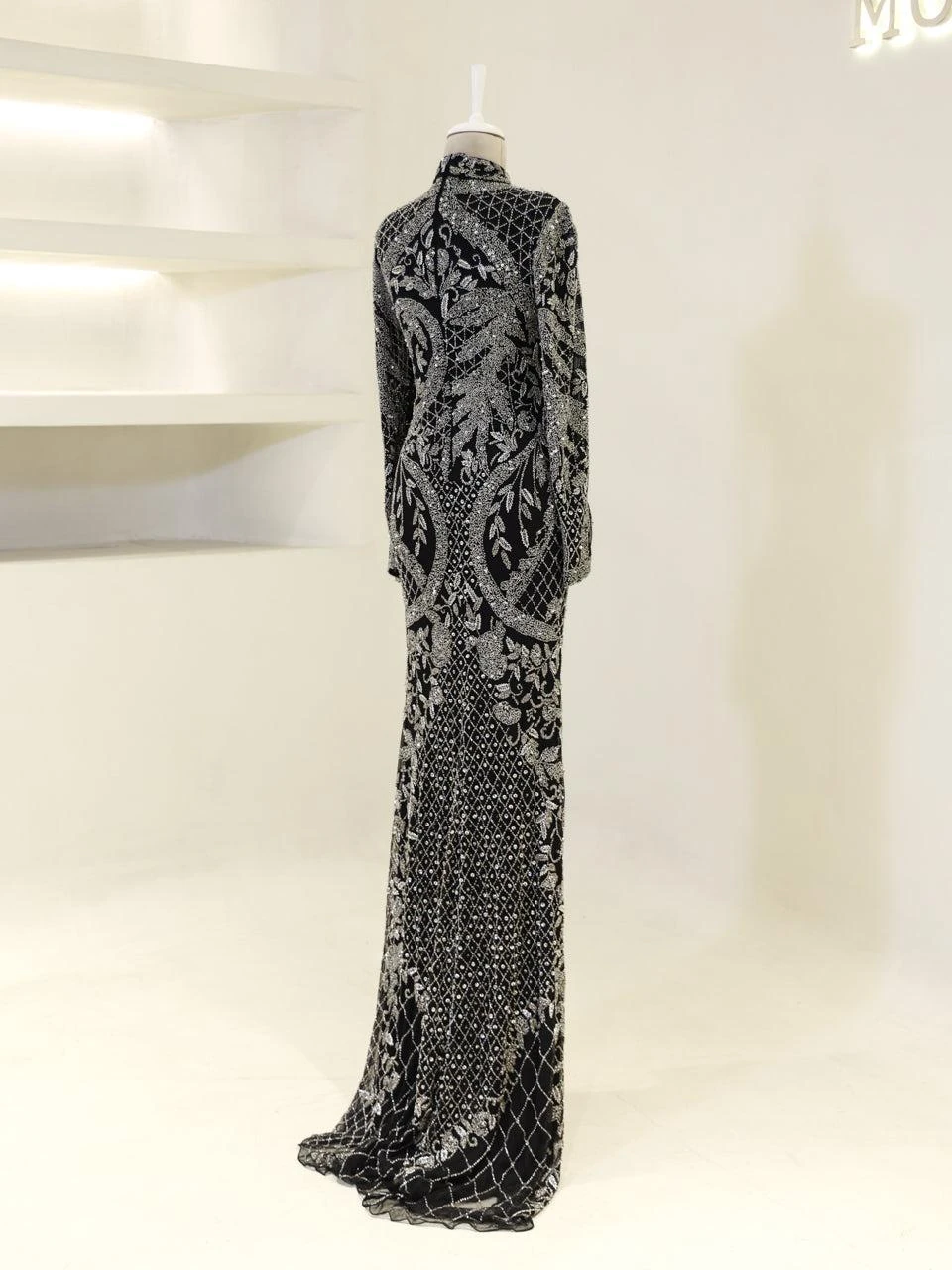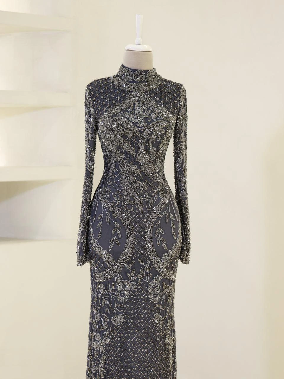 The Couture Trieste Modest Evening Dress is crafted with precision to offer a perfect fit. The dress measures approximately 160 cm in length and features a train for added elegance. It is designed with a back zipper for easy wear. Made from embroidered stretch fabric, it includes a lining for comfort. The dress has a straight skirt design and features transparent sleeves. Note: The transparent sleeve section can be covered upon request. For more details, please contact our WhatsApp line at +90 553 978 48 86.