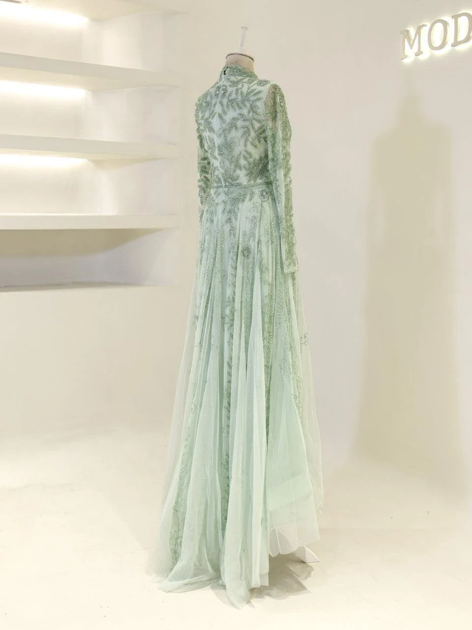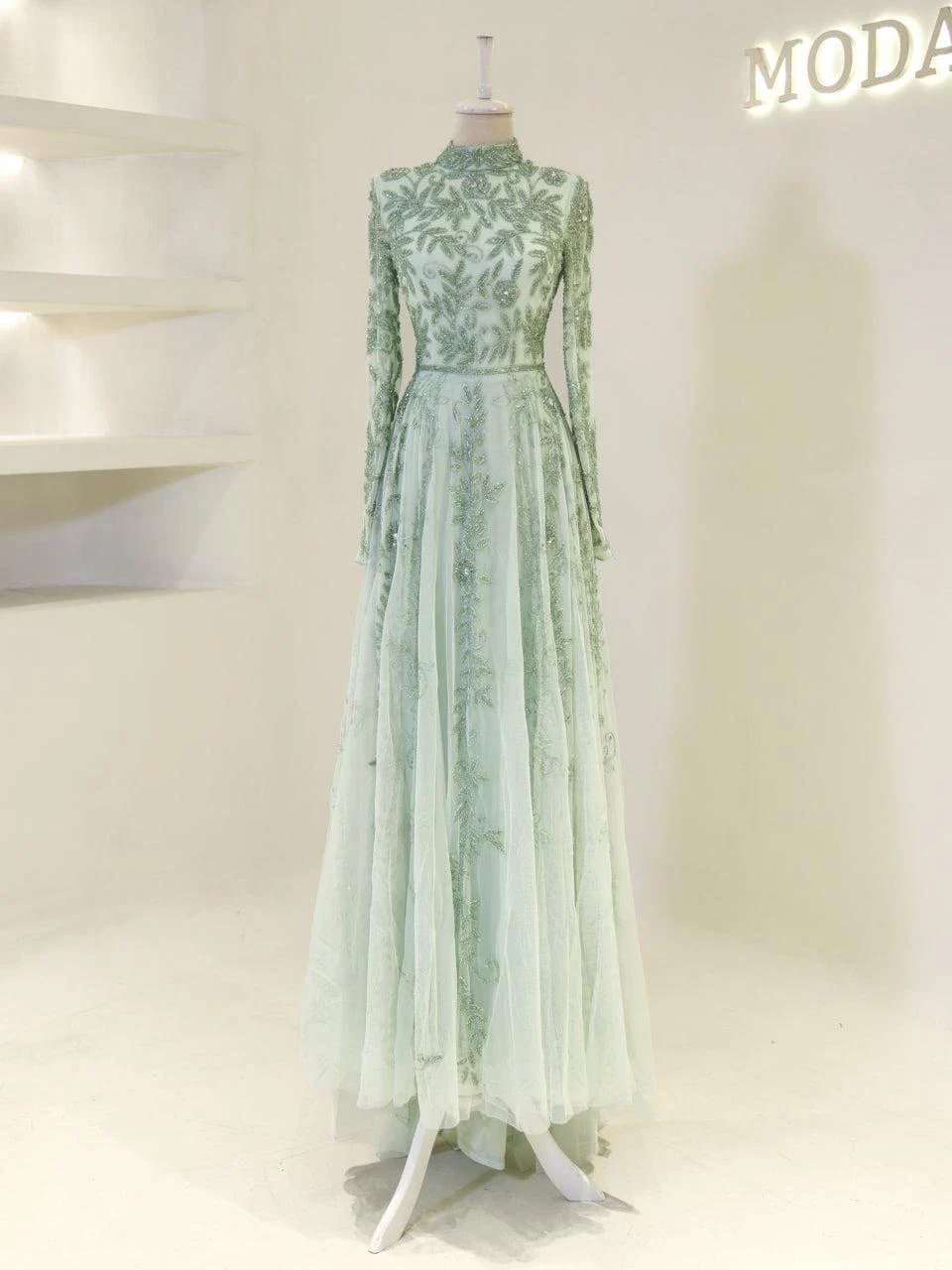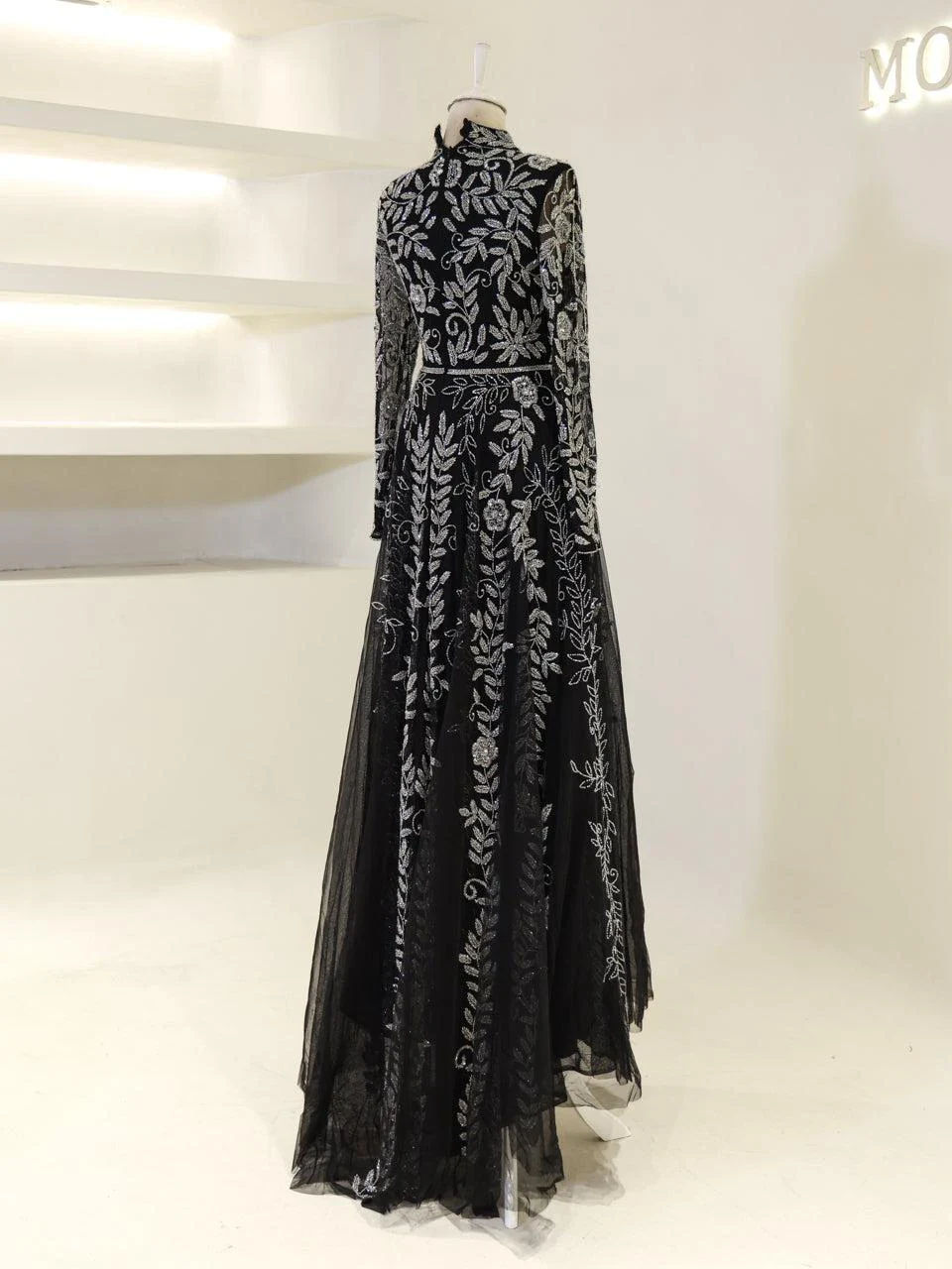 The Couture Velica Modest Evening Dress is designed with precision and elegance. It features a full-length design with an average length of 155 cm, complete with a train. The dress is lined for comfort and includes a built-in bust pad. It has a high neckline and a back zipper closure for ease of wear. The sleeves are transparent, adding a touch of sophistication, and the skirt has a flared design. Note: Transparent sleeve details can be covered upon request. For more information, please contact our WhatsApp line at -.