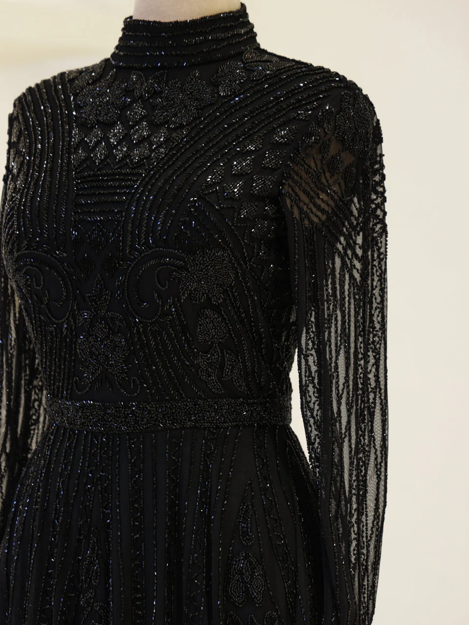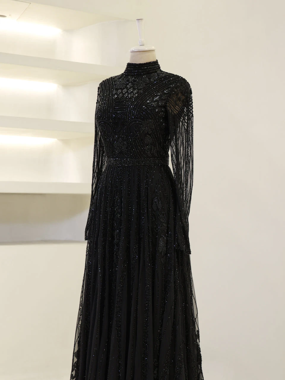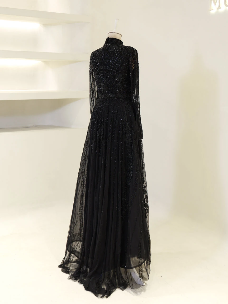 The Couture Veloura Evening Dress is designed to fit true to size, with an average length of 160 cm. It features a train and is adorned with non-adhesive embellishments. The dress is fully lined and includes a mandarin collar. It has a back zipper closure and transparent sleeves, complemented by a flared skirt design. Note: Transparent sleeve details can be customized upon request. For more information, contact our WhatsApp line at +90 553 978 48 86.