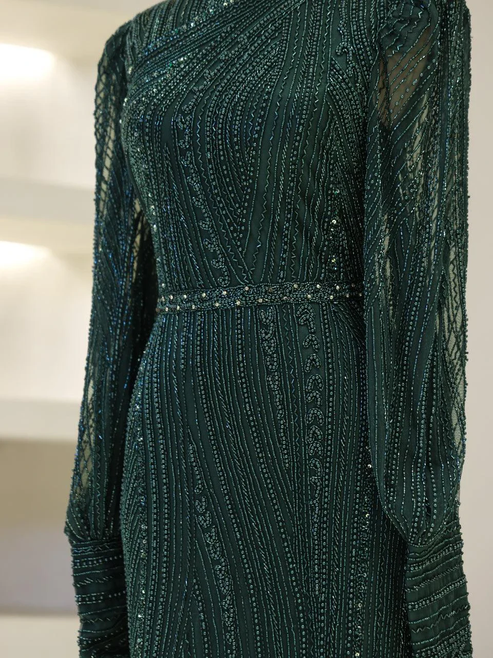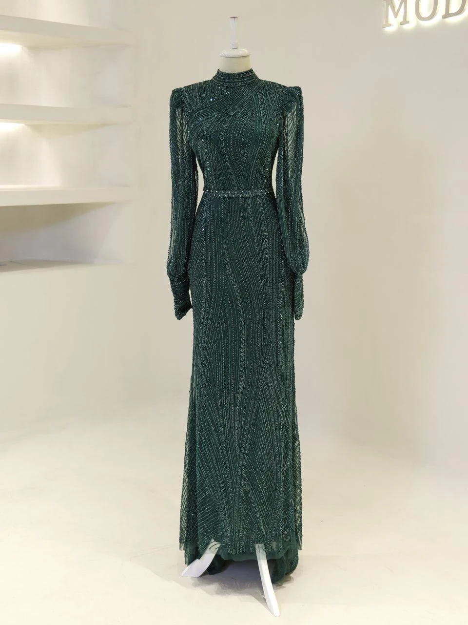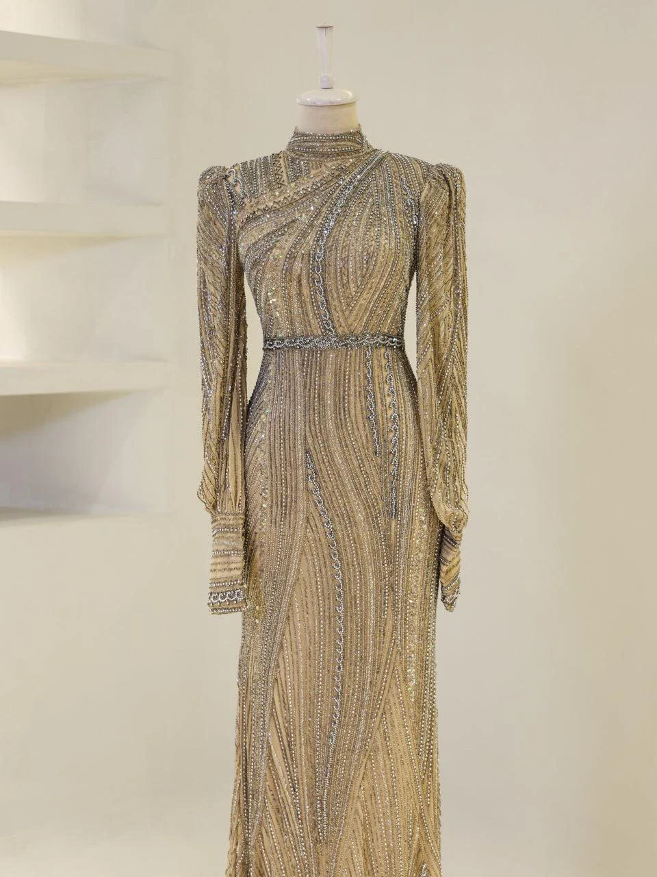The Couture Vespera Modest Evening Dress is designed to provide elegance and comfort. It features a full-length design with an average length of 160 cm and includes a train for added sophistication. The dress is crafted with a high neckline and is secured with a zipper at the back. Unlike many other designs, the embellishments are not glued but intricately applied. The dress is fully lined for comfort. It comes with long, transparent sleeves, which can be customized upon request to be non-transparent. For customization details, please contact our WhatsApp line at -.