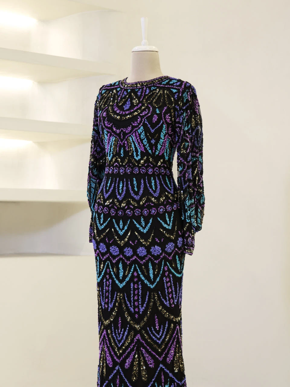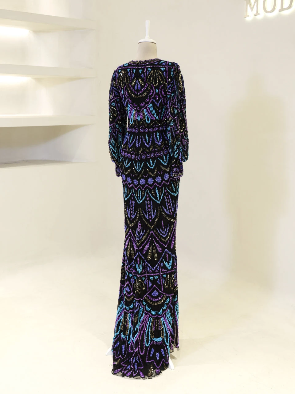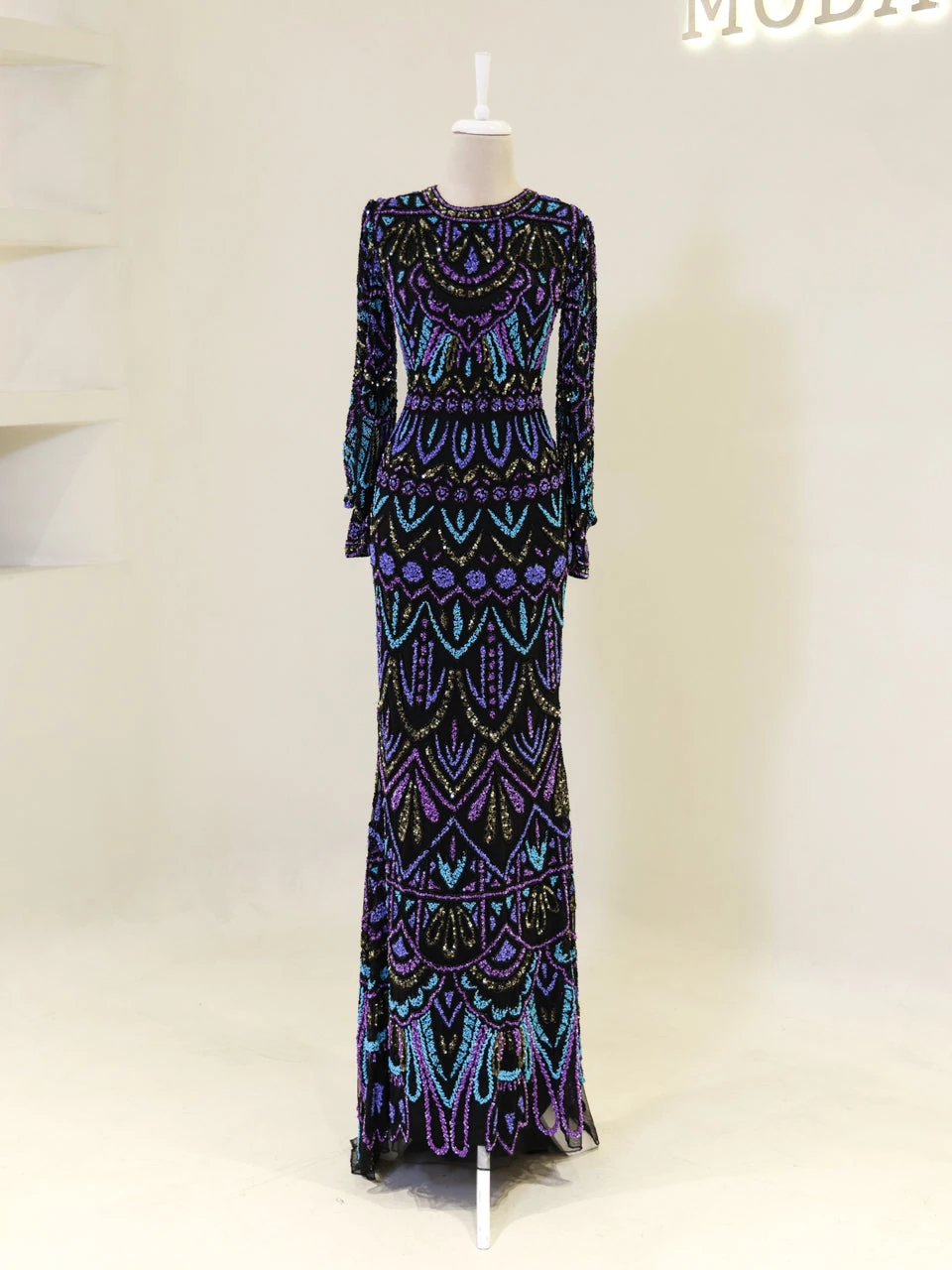 The Couture Vildan Modest Evening Dress is designed with precision, featuring a full-length fit and an average length of 160 cm. It includes a train and is fastened with a zipper at the back. The dress is made from embroidered, flexible fabric and comes with a lining for added comfort. It has a straight skirt design and features transparent sleeves. Note: Upon request, the transparent sleeve section can be covered. For more information, please contact our WhatsApp line at +90 553 978 48 86.