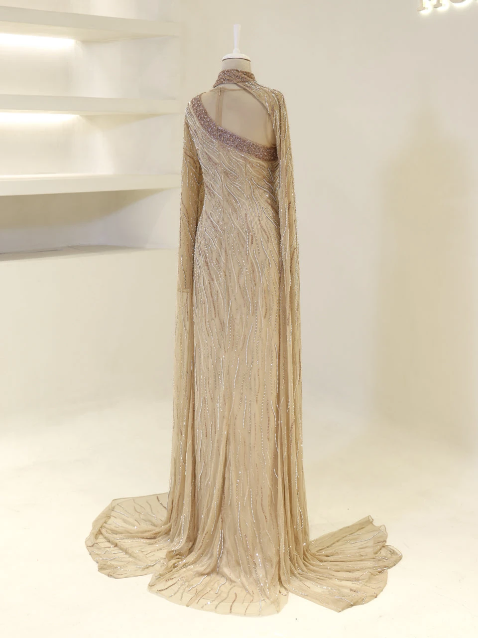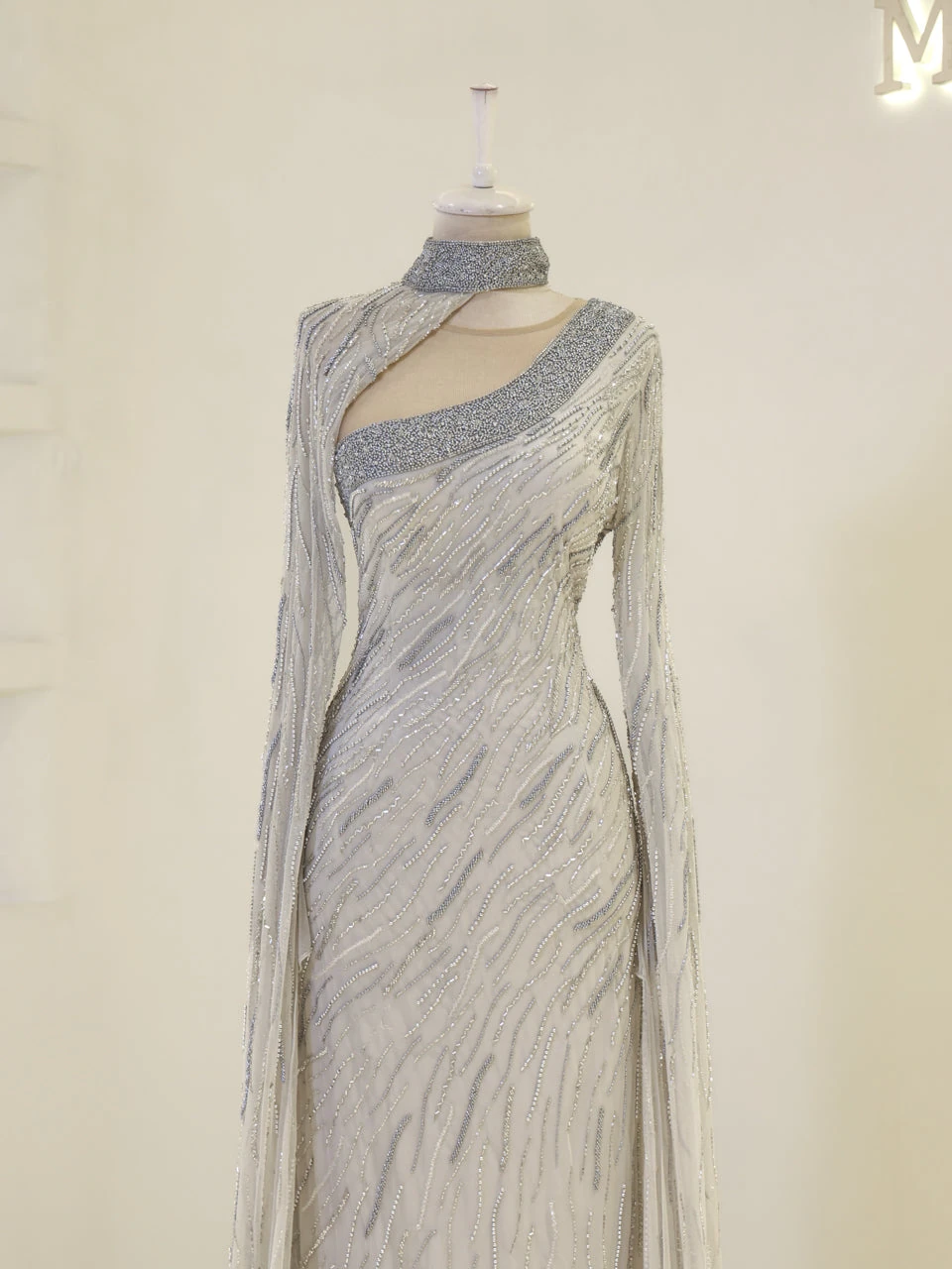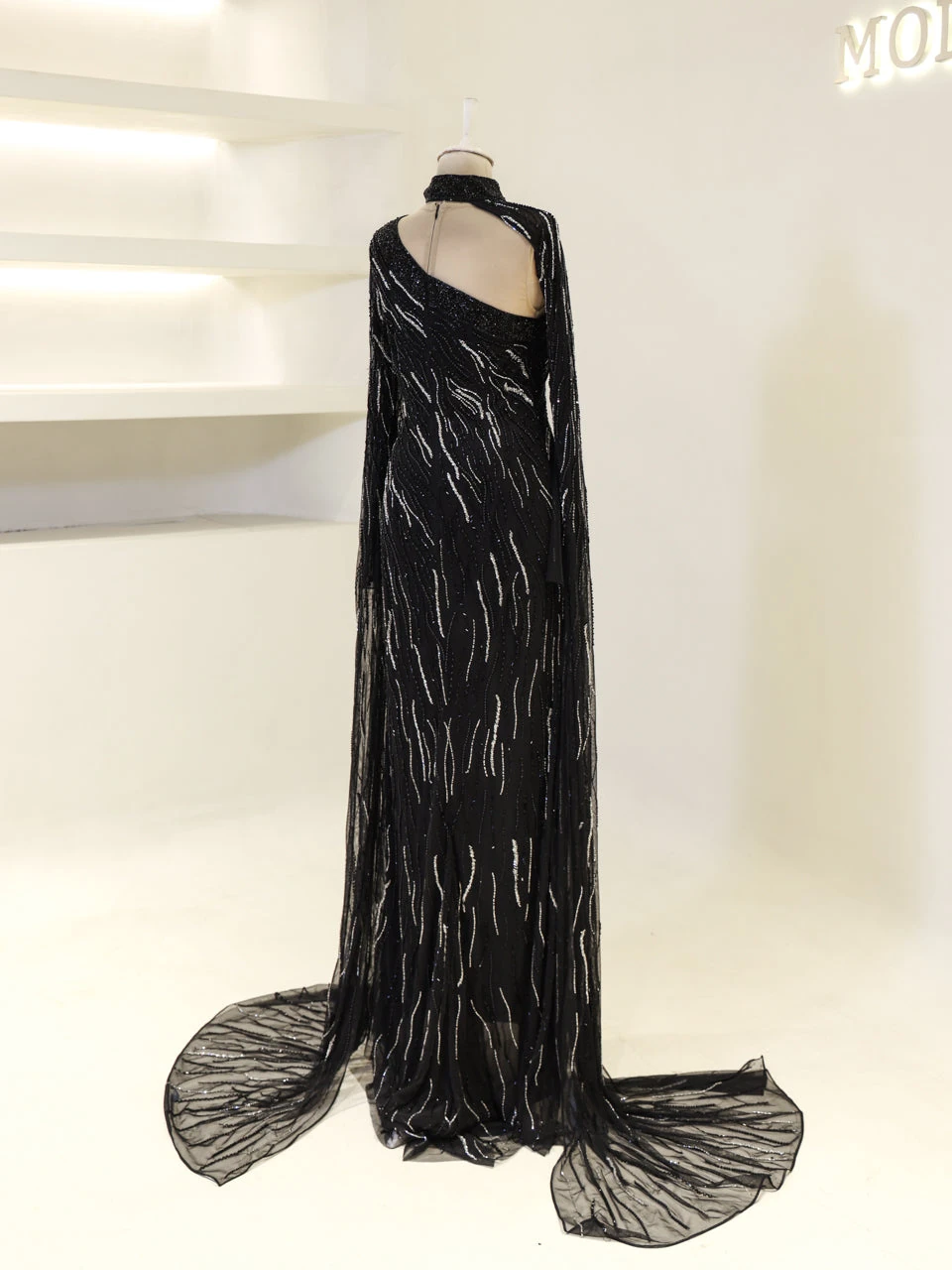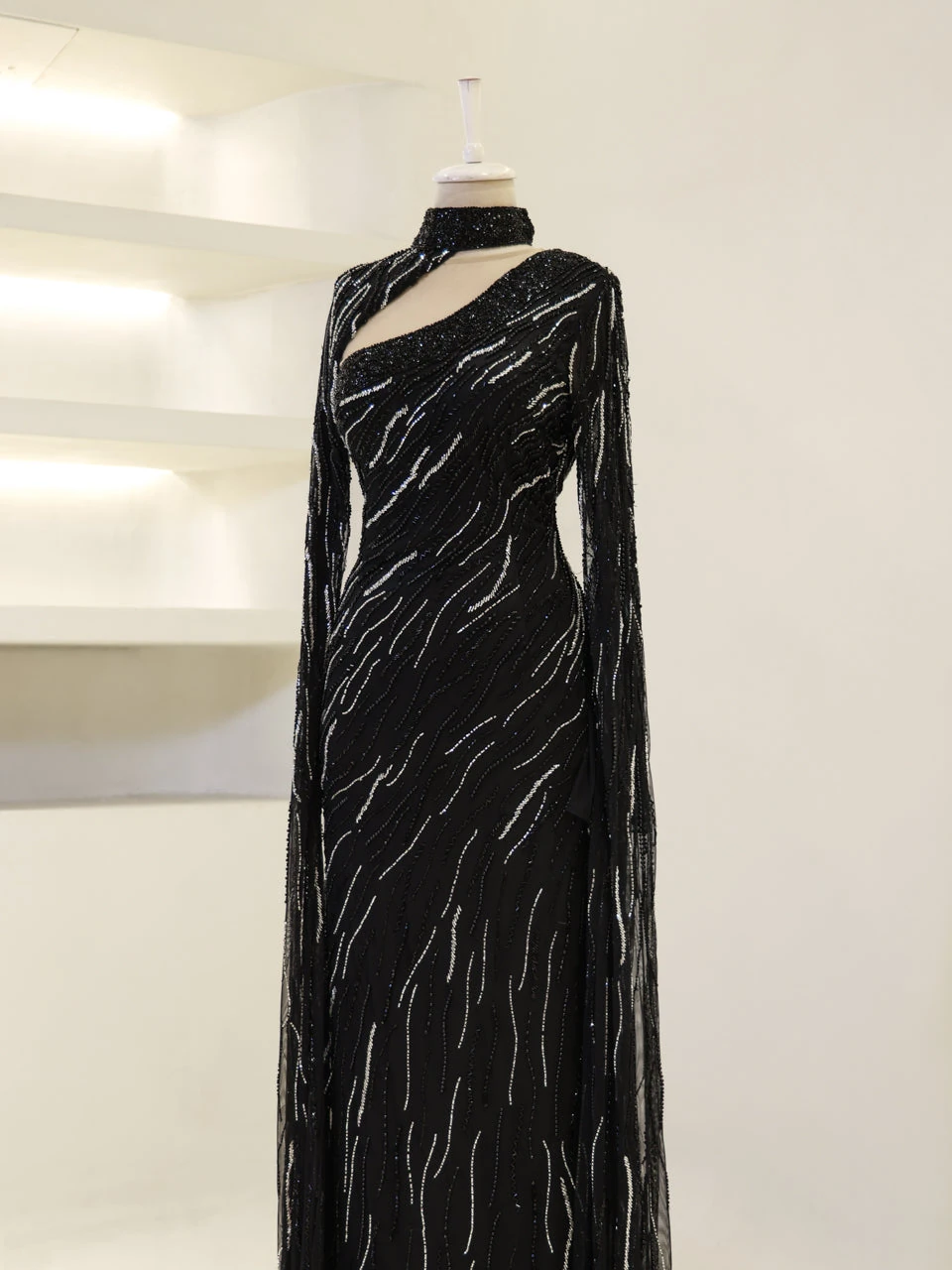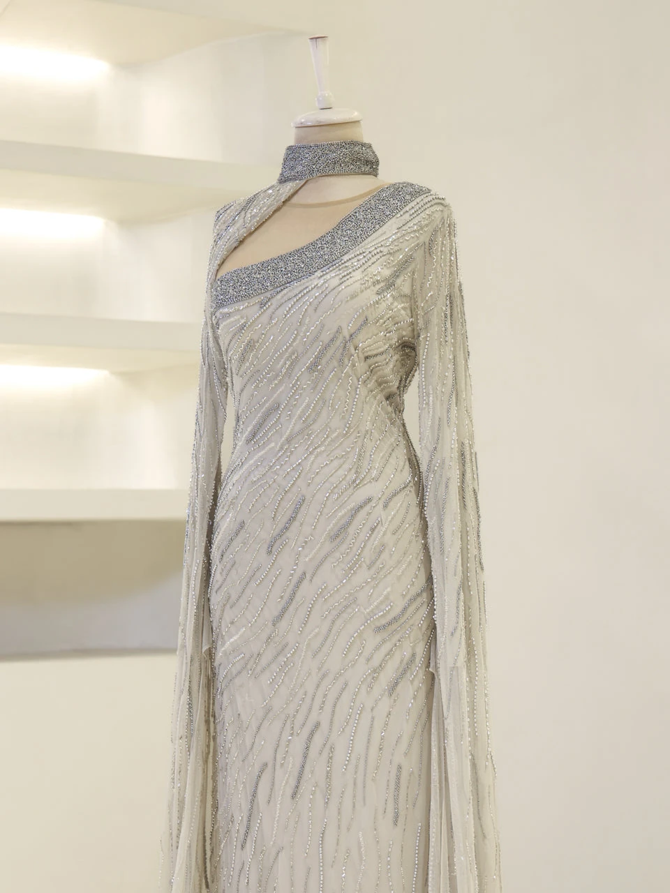 The Couture Zirelle Evening Dress is designed to fit true to size with an average length of 160 cm. This dress features non-adhesive embellishments and is fully lined for comfort. It includes a back zipper for easy wear and a detachable cape that flows from the neck to the hemline. The design incorporates a transparent single sleeve and a pencil skirt silhouette for a sophisticated look.