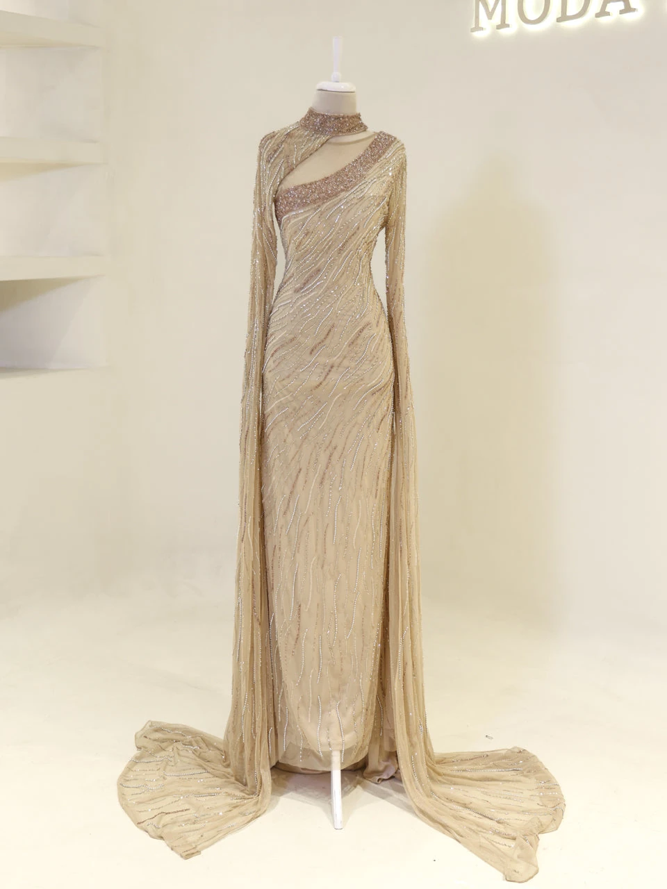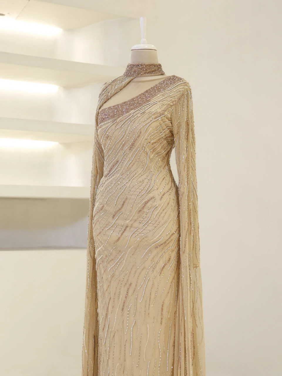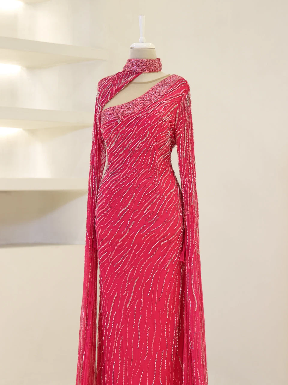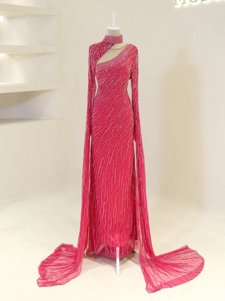 The Couture Zirelle Evening Dress is designed to fit true to size with an average length of 160 cm. This dress features non-adhesive embellishments and is fully lined for comfort. It includes a back zipper for easy wear and a detachable cape that flows from the neck to the hemline. The design incorporates a transparent single sleeve and a pencil skirt silhouette for a sophisticated look.