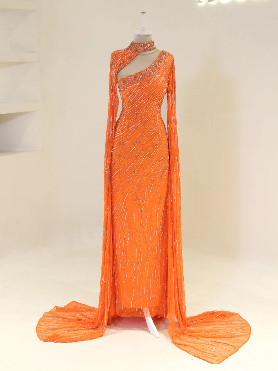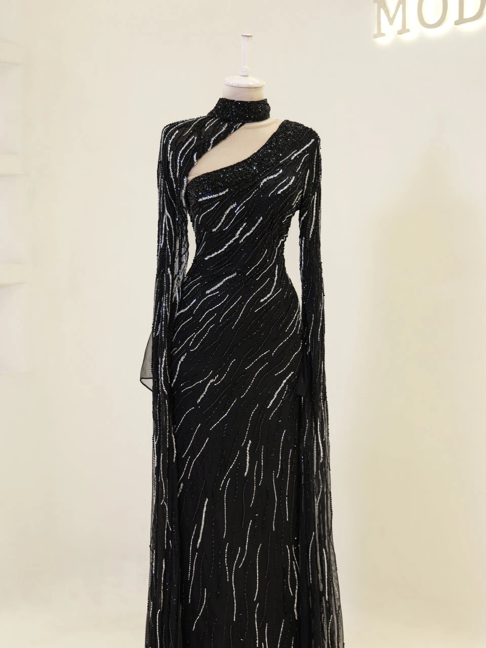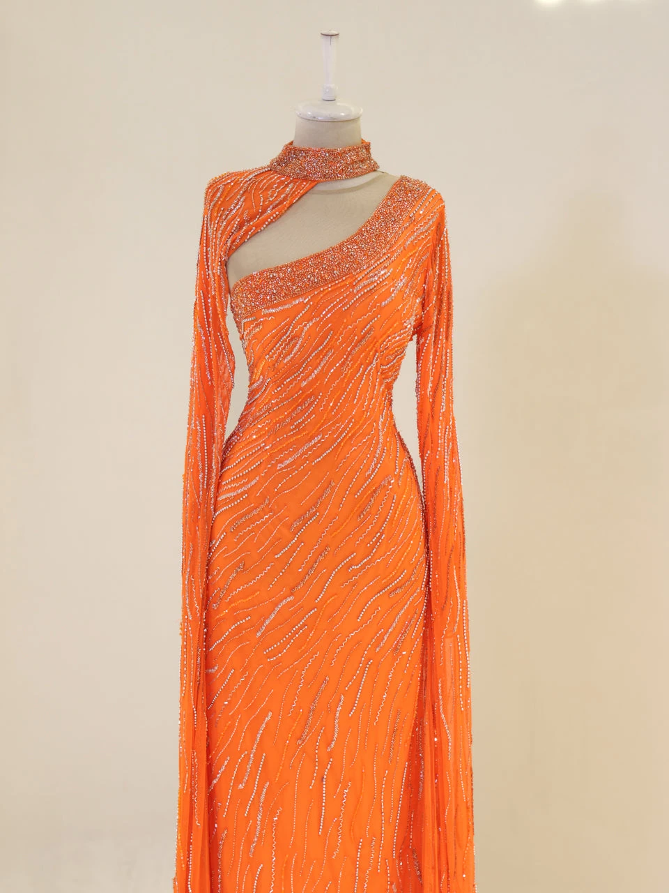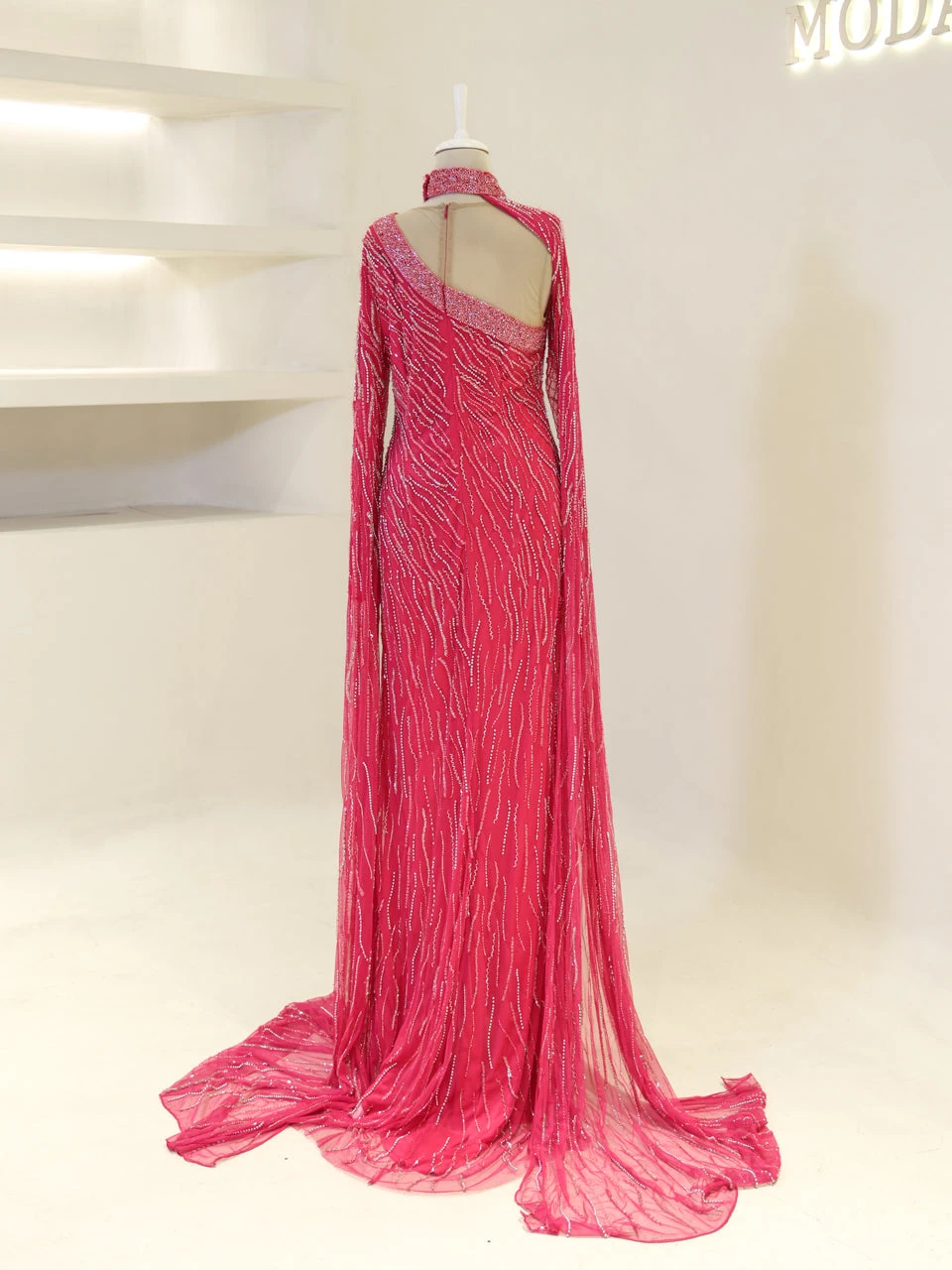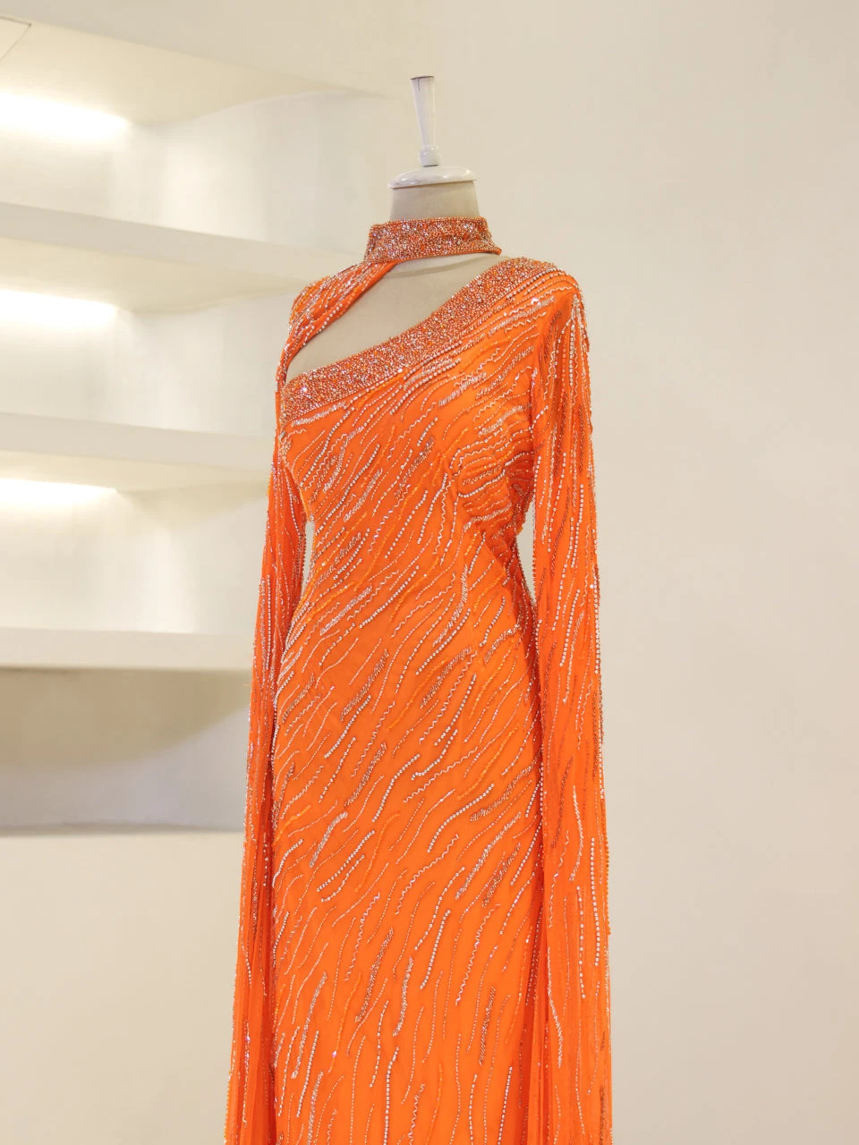 The Couture Zirelle Evening Dress is designed to fit true to size with an average length of 160 cm. This dress features non-adhesive embellishments and is fully lined for comfort. It includes a back zipper for easy wear and a detachable cape that flows from the neck to the hemline. The design incorporates a transparent single sleeve and a pencil skirt silhouette for a sophisticated look.