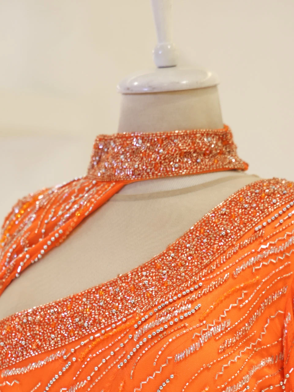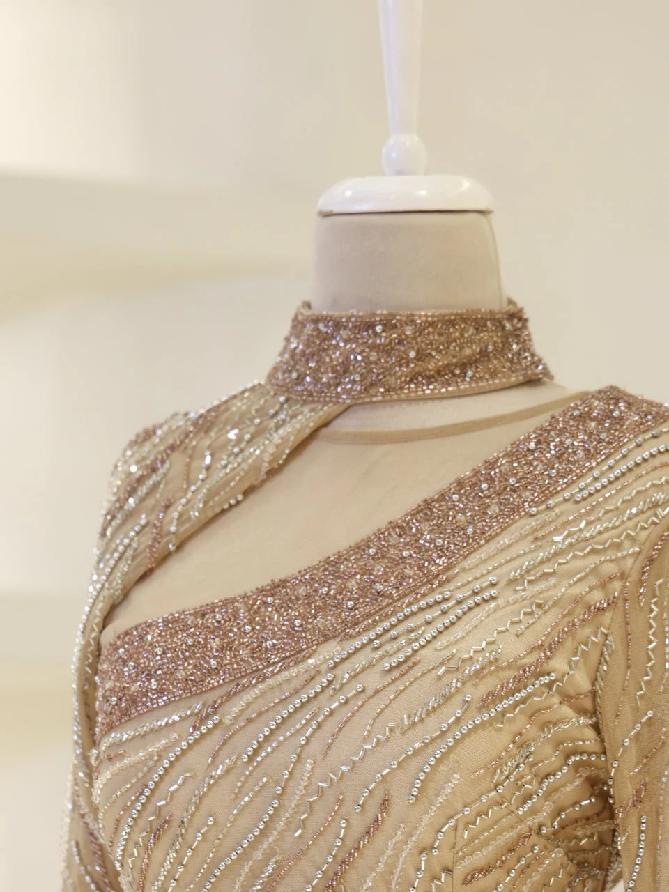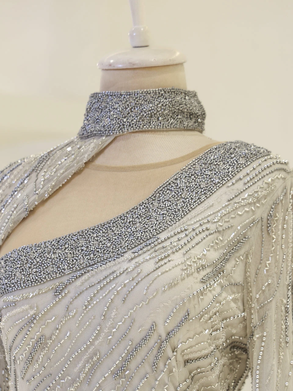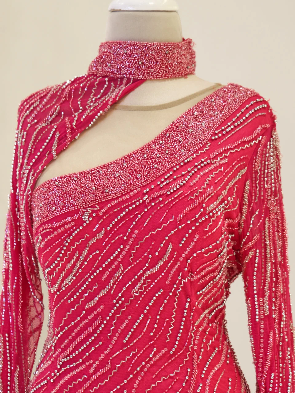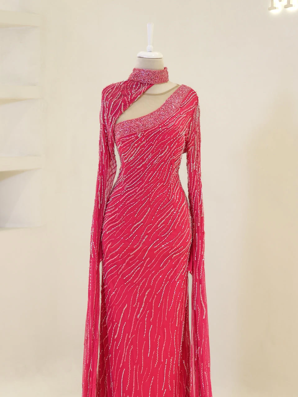 The Couture Zirelle Evening Dress is designed to fit true to size with an average length of 160 cm. This dress features non-adhesive embellishments and is fully lined for comfort. It includes a back zipper for easy wear and a detachable cape that flows from the neck to the hemline. The design incorporates a transparent single sleeve and a pencil skirt silhouette for a sophisticated look.