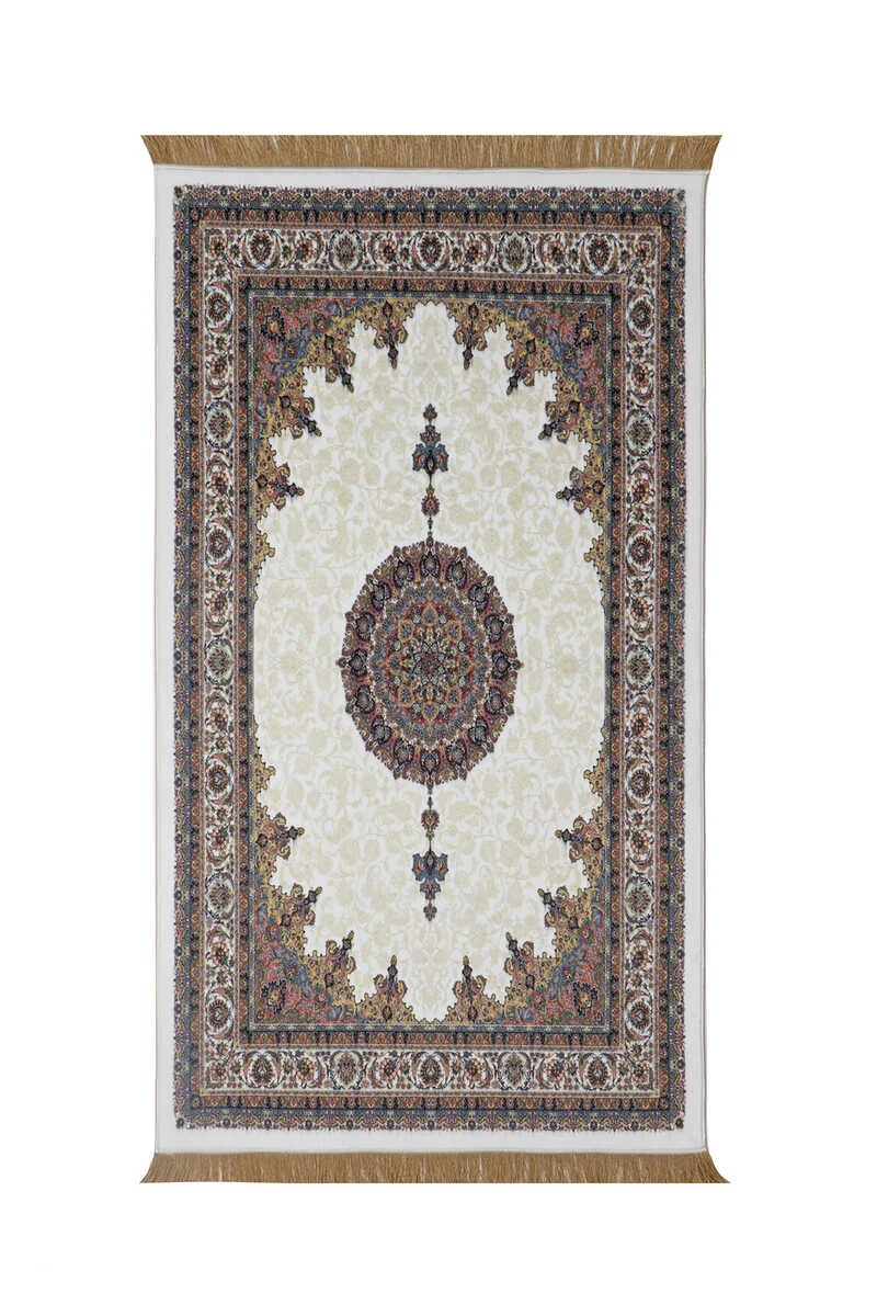 The Krem Bambu Halı Seccade features a silky texture with Turkish motifs and ceramic patterns, offering a decorative appearance. It is made from bamboo, measures 67×115 cm, and is designed for comfortable use.