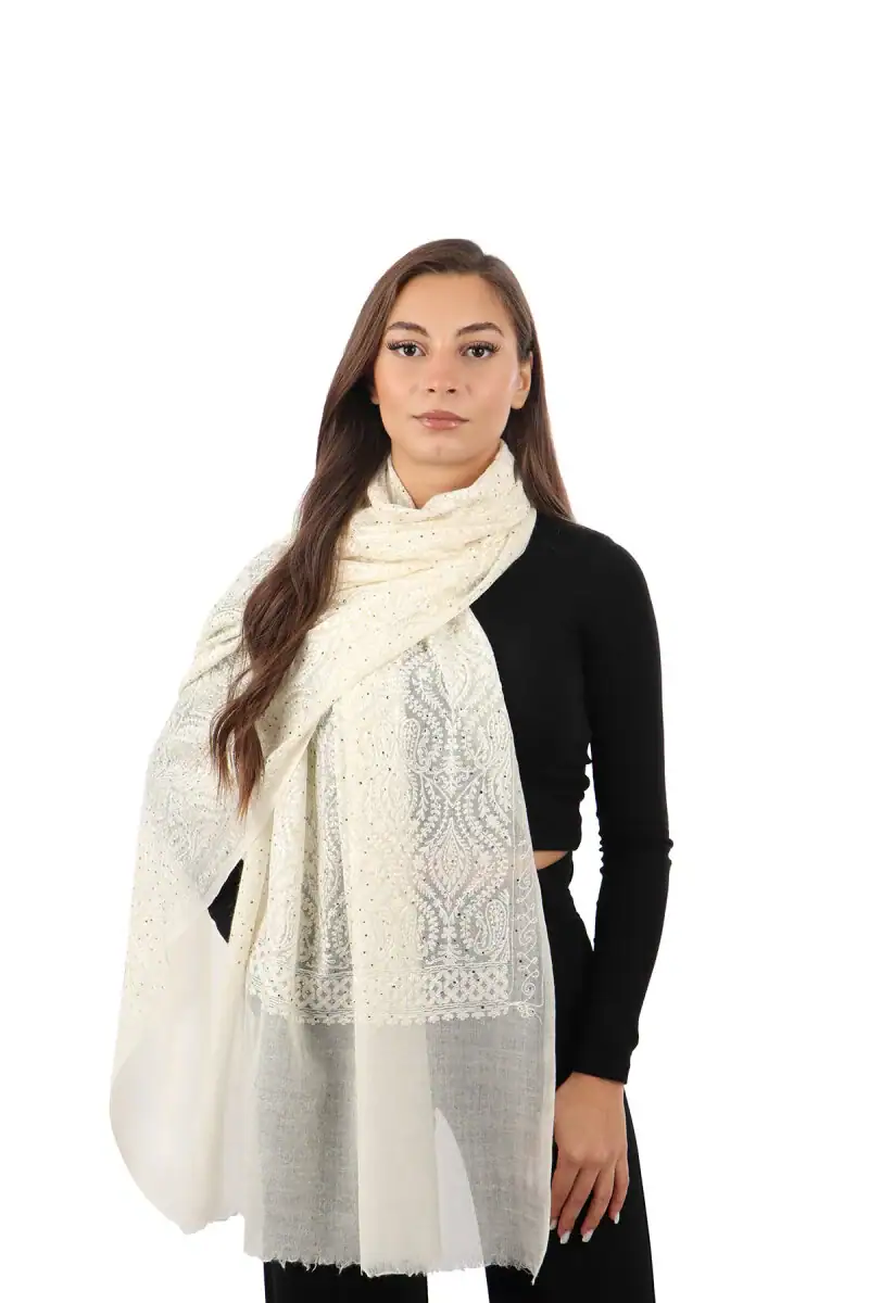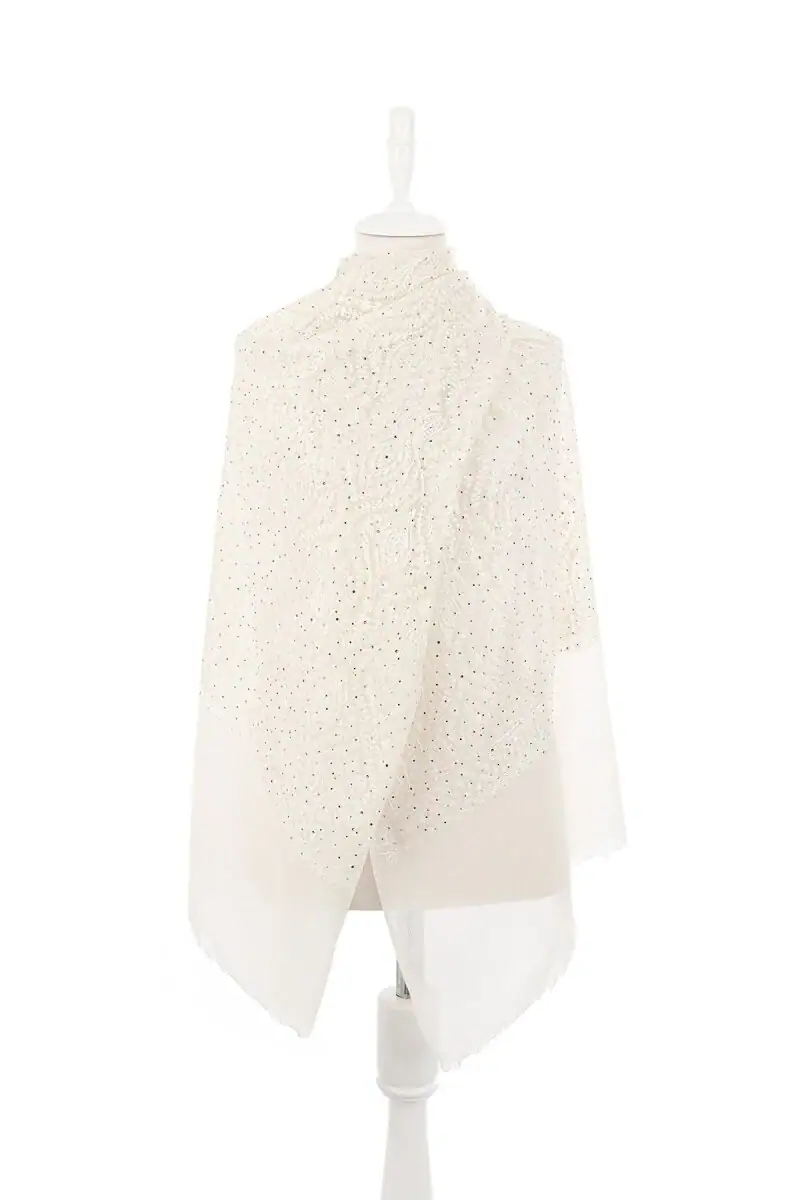 The Cream Embroidered Wool Silk Shawl is designed to keep you warm during cool winter days. This shawl features intricate embroidery and decorative stones, making it a stylish accessory. Crafted from a blend of 90% wool and 10% silk, it offers both warmth and elegance. With dimensions of 80 x 200 cm, it provides ease of use and versatility. Originating from Bursa, Turkey, this shawl combines traditional craftsmanship with modern design.