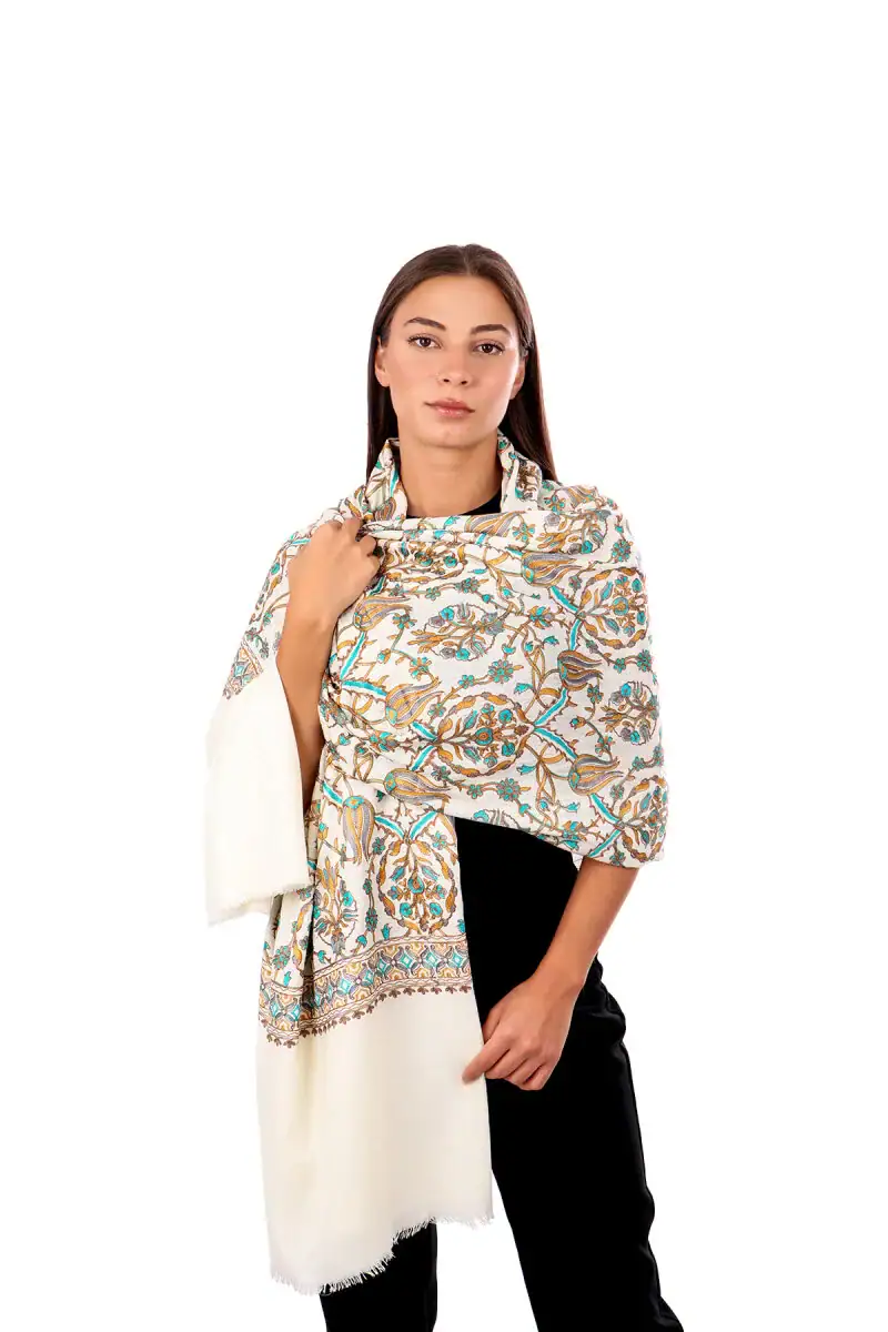 The Krem Gold Lale Desen İşlemeli Yün Şal is a wool shawl designed to keep you warm on cold winter days. Made in Bursa, Turkey, it features intricate designs and measures 75 x 210 cm.