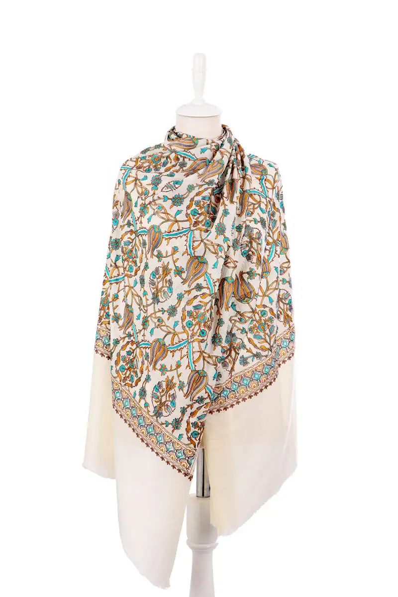 Stay warm during the cooler months with this Cream Gold Tulip Pattern Embroidered Wool Shawl. Made from 100% wool, it offers comfort and style with its detailed embroidery. The shawl measures 75 x 210 cm, providing ample coverage and ease of use. Originating from Bursa, Turkey, this piece combines traditional craftsmanship with functional design.