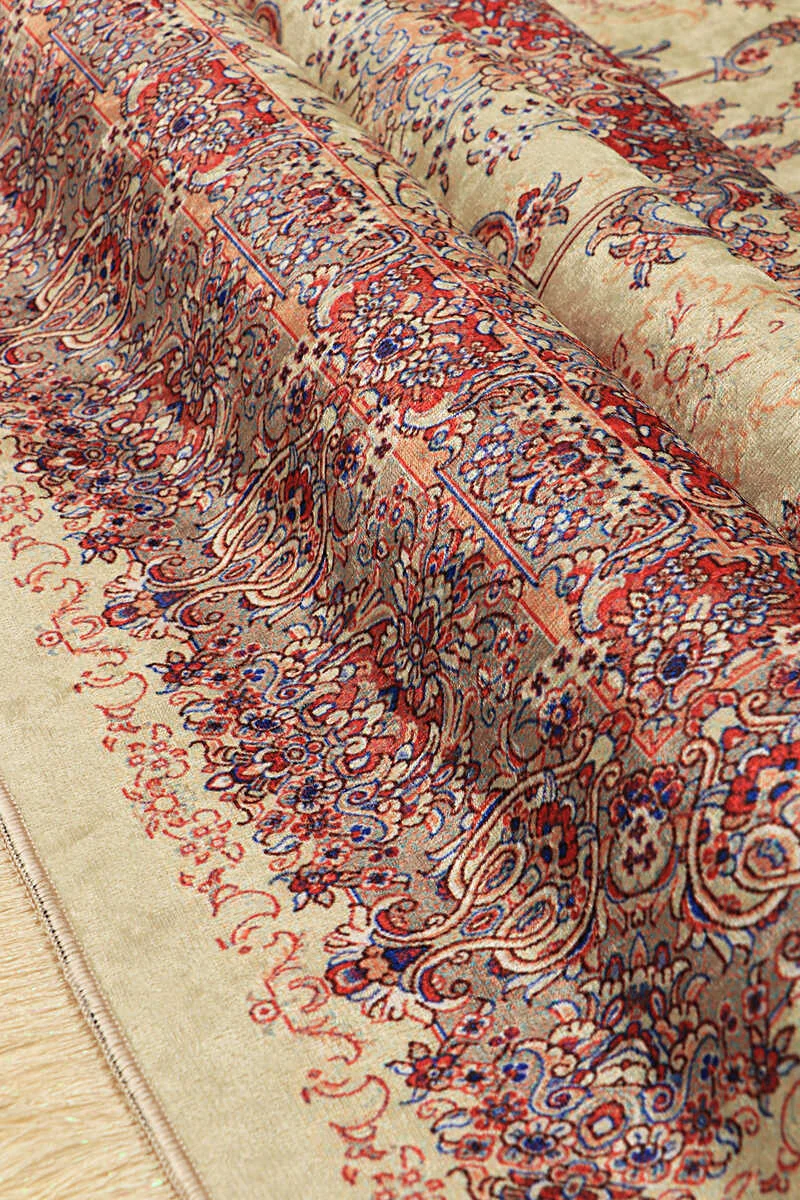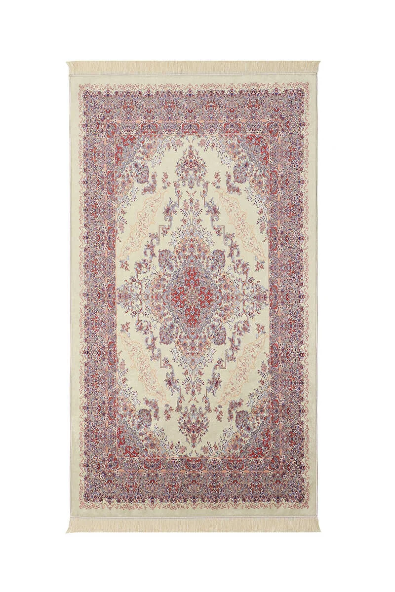 The Krem Kadife Halı Seccade is a Turkish prayer rug featuring silk-like texture and vibrant colors with traditional motifs and tile patterns. It measures 65×115 cm and is designed for comfortable use, originating from Bursa, Turkey.