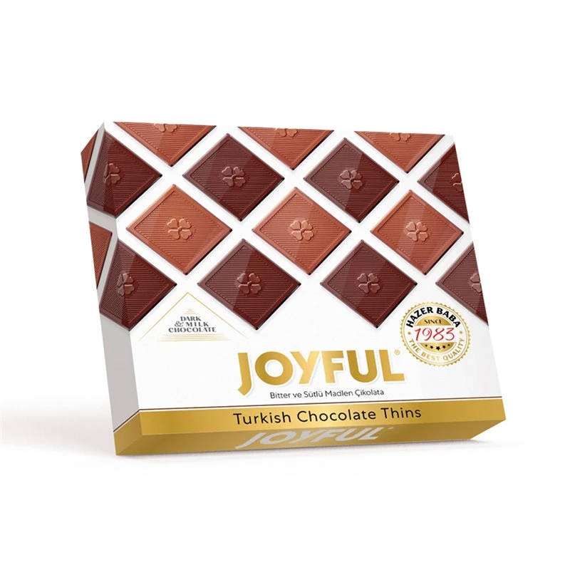 This product offers a combination of dark and milk Madlen chocolates. The dark chocolate contains sugar, cocoa mass, cocoa butter, emulsifier (sunflower lecithin), and vanilla, with a minimum of 60% cocoa solids. It may contain traces of nuts. The milk chocolate includes sugar, milk powder, cocoa butter, cocoa mass, emulsifier (sunflower lecithin), and vanilla, with a minimum of 35% cocoa solids. Allergens are highlighted in the ingredients list and may include other nut traces.