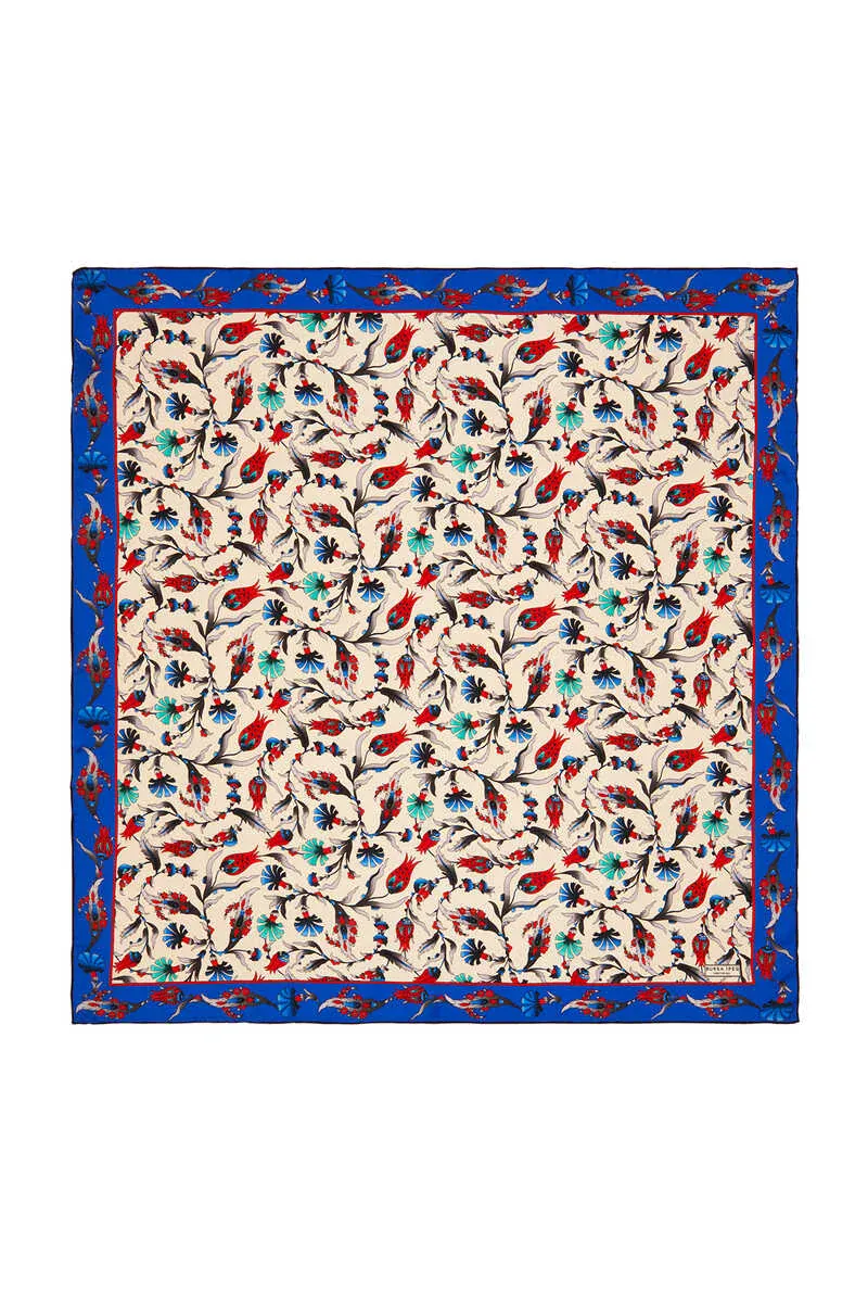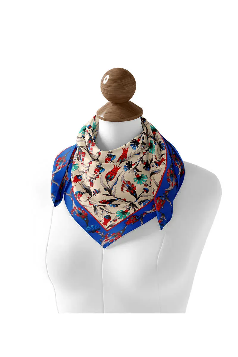 This ecru and blue silk scarf showcases a lively carnation tulip pattern, bringing together classic elegance with a touch of fun. Made from 100% silk, it offers a luxurious feel and vibrant colors. With dimensions of 90×90 cm, this scarf is versatile and easy to style in various ways. Originating from Bursa, Turkey, it reflects the region's rich textile heritage.
