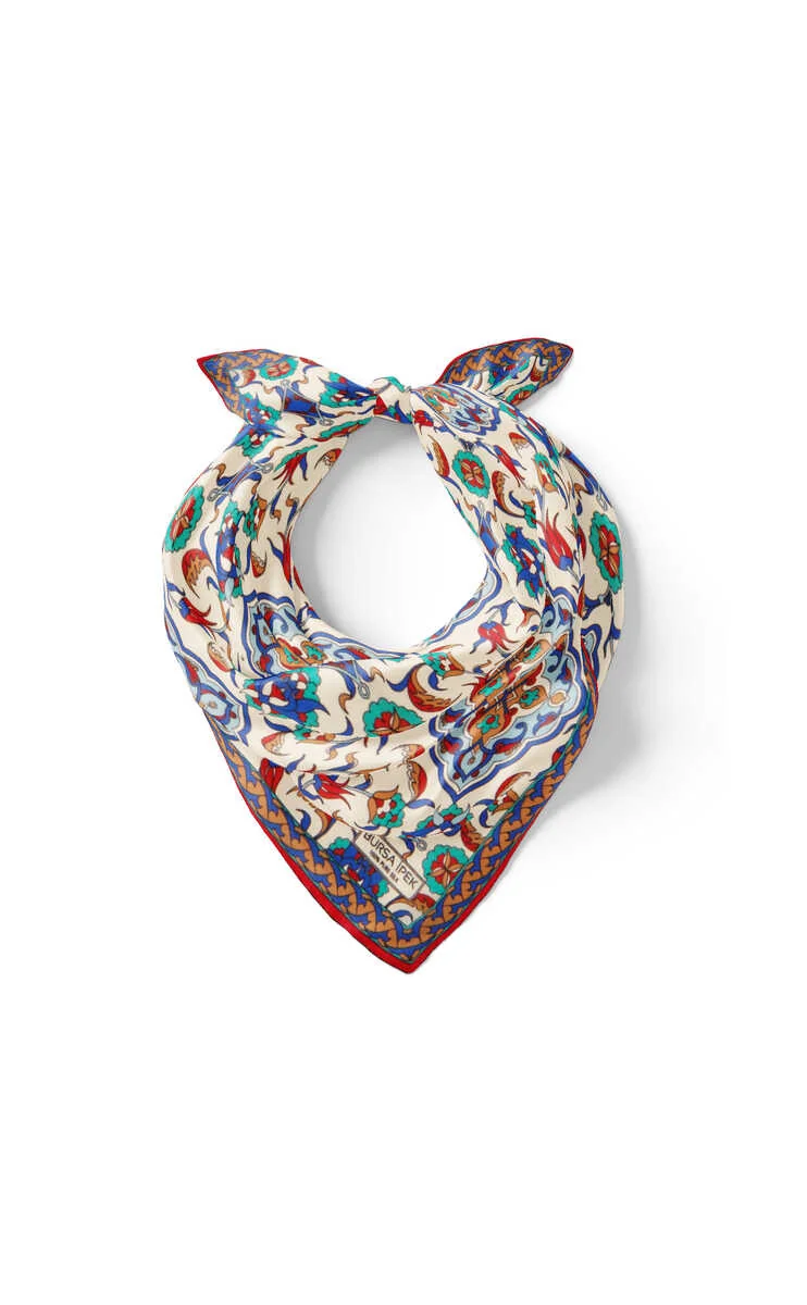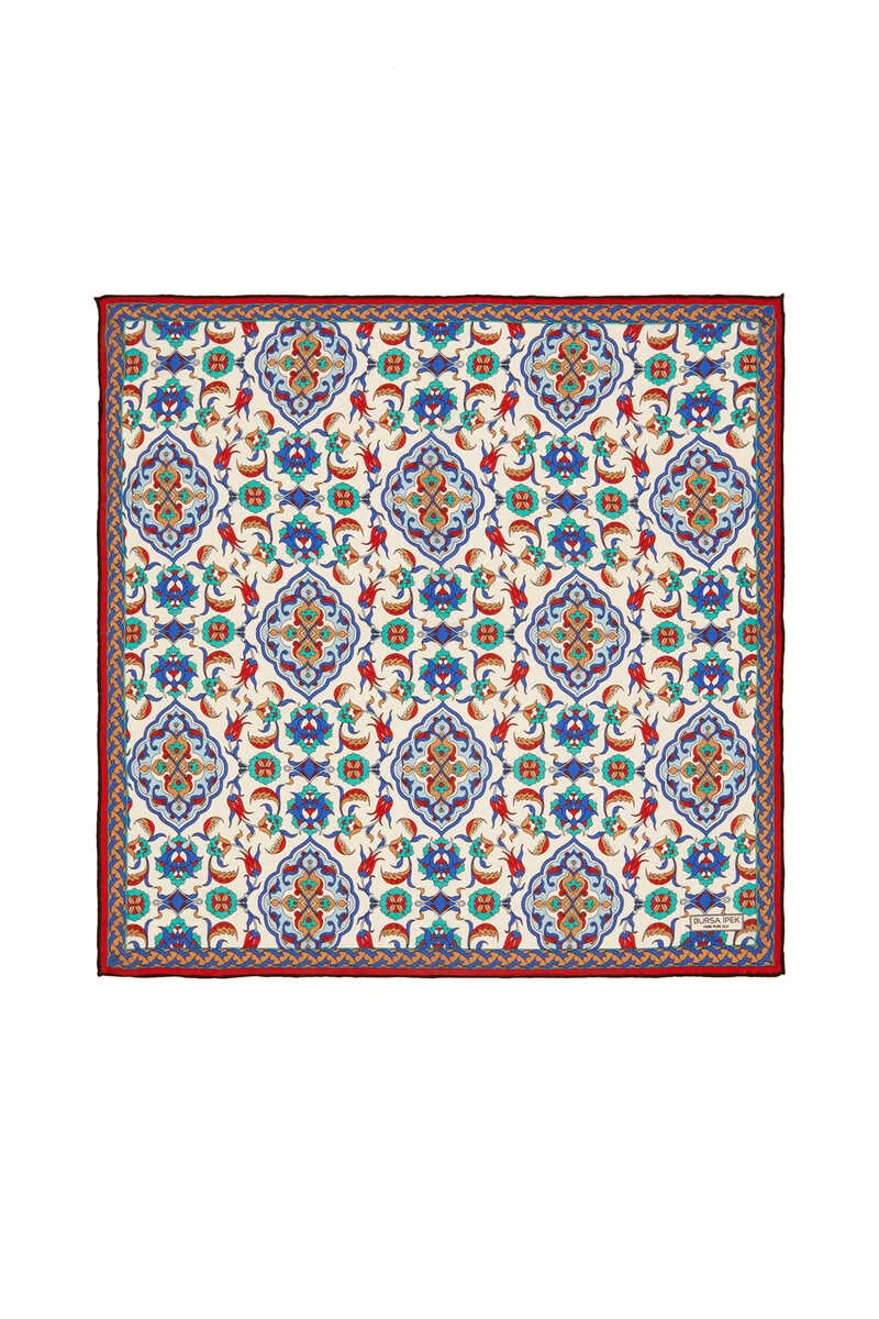 The Ekru Gold Çini Lale Desen İpek Mendil is a silk handkerchief featuring traditional Turkish motifs in an ivory and gold color scheme. Measuring 55×55 cm, it is made from 100% silk and originates from Bursa, Turkey.