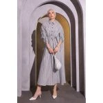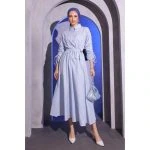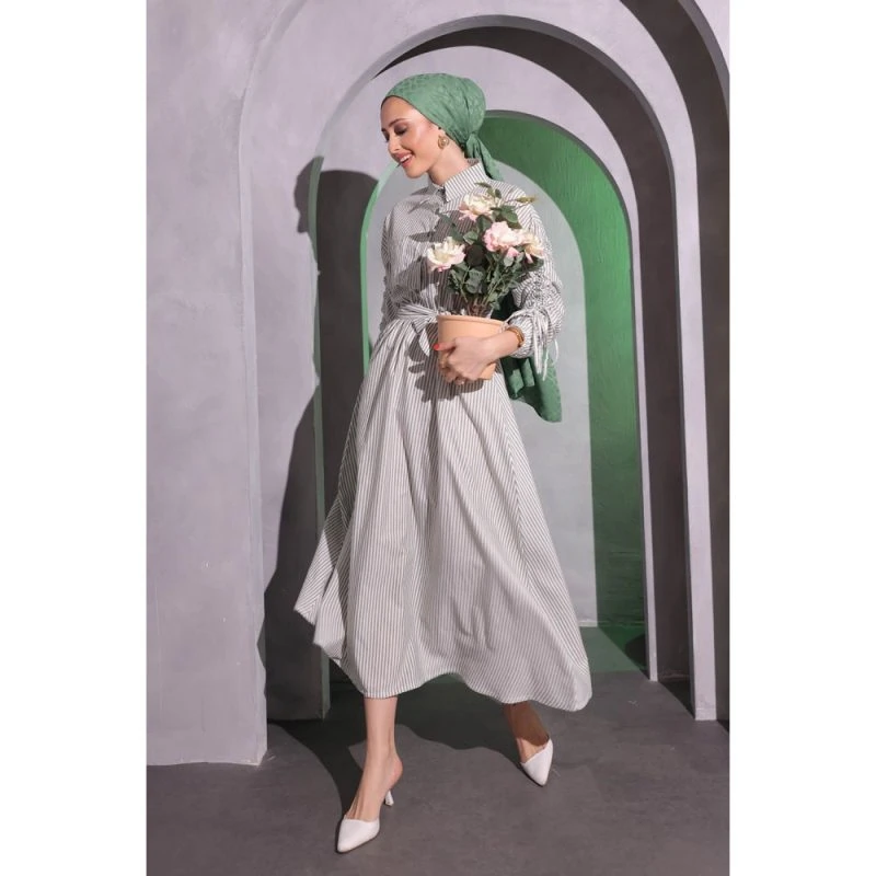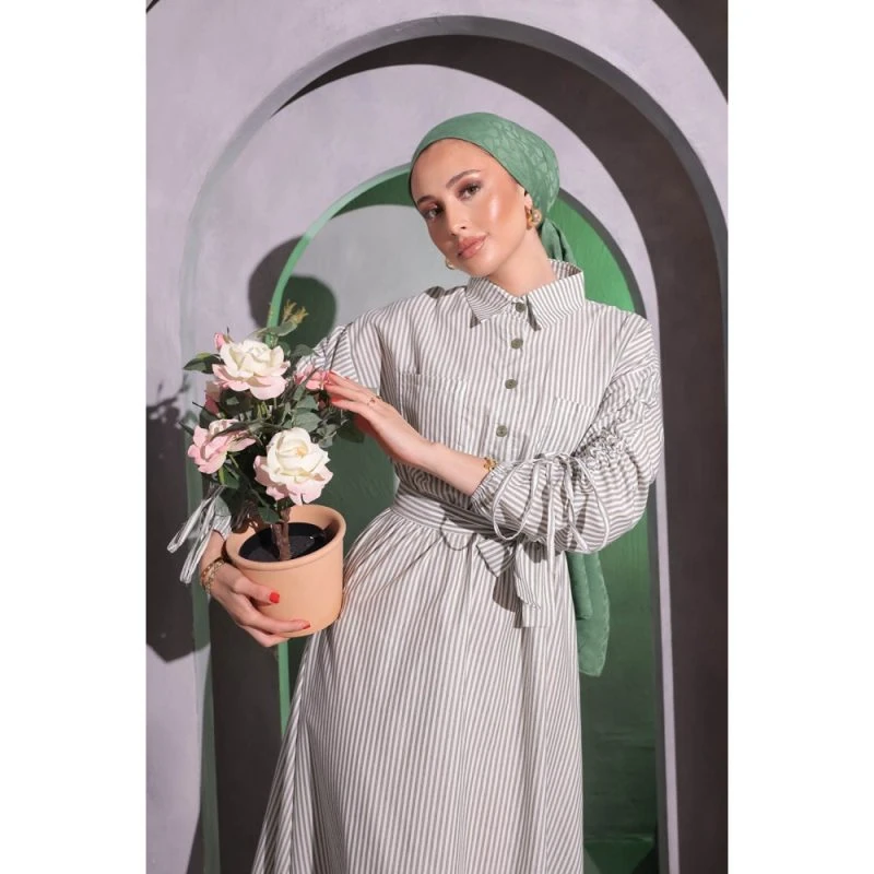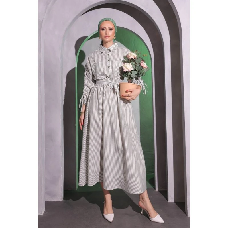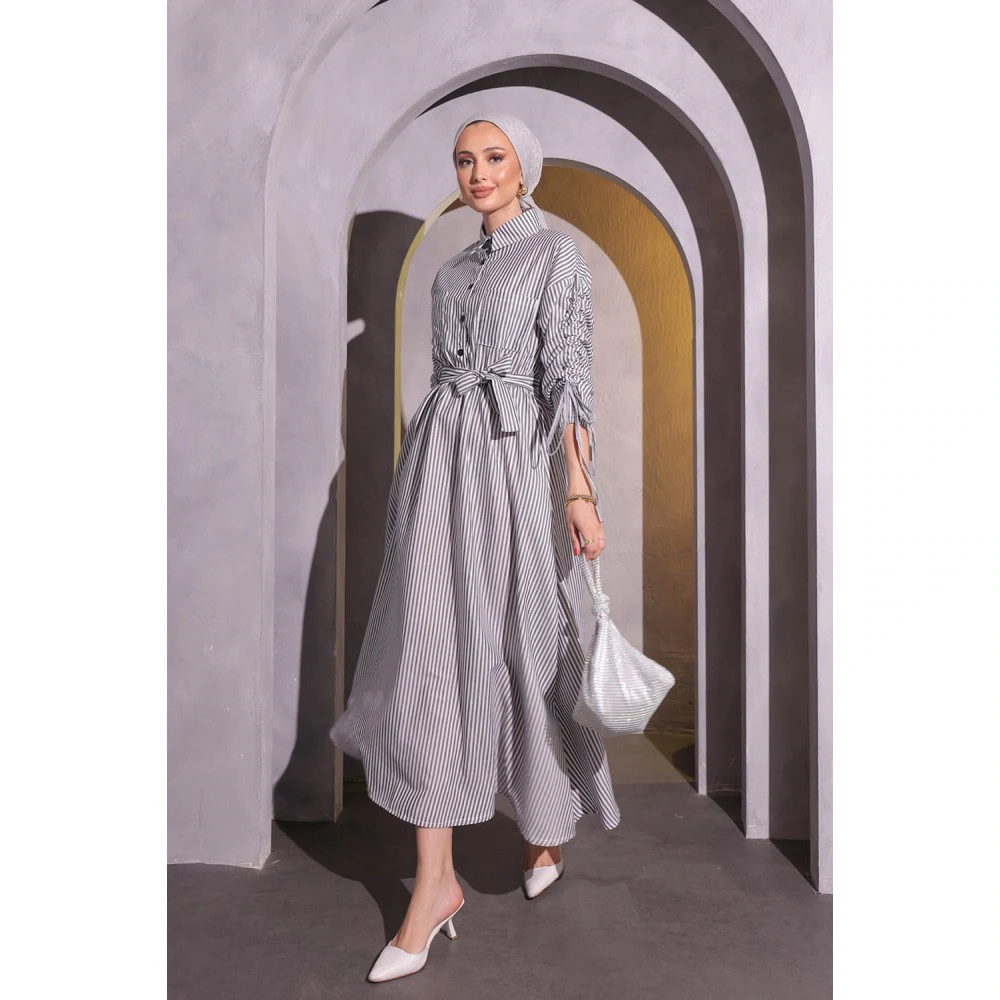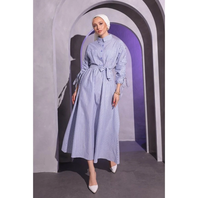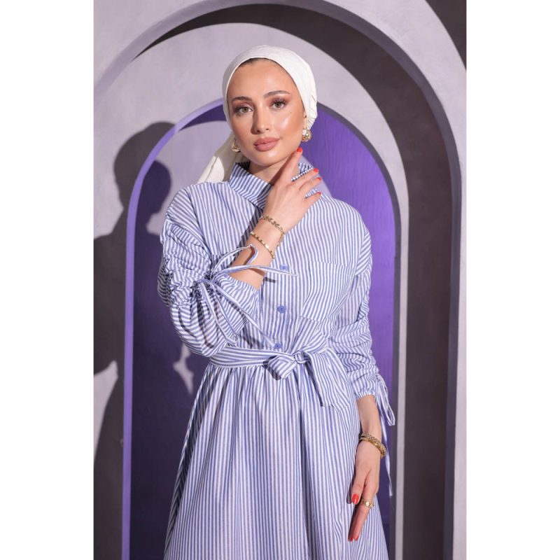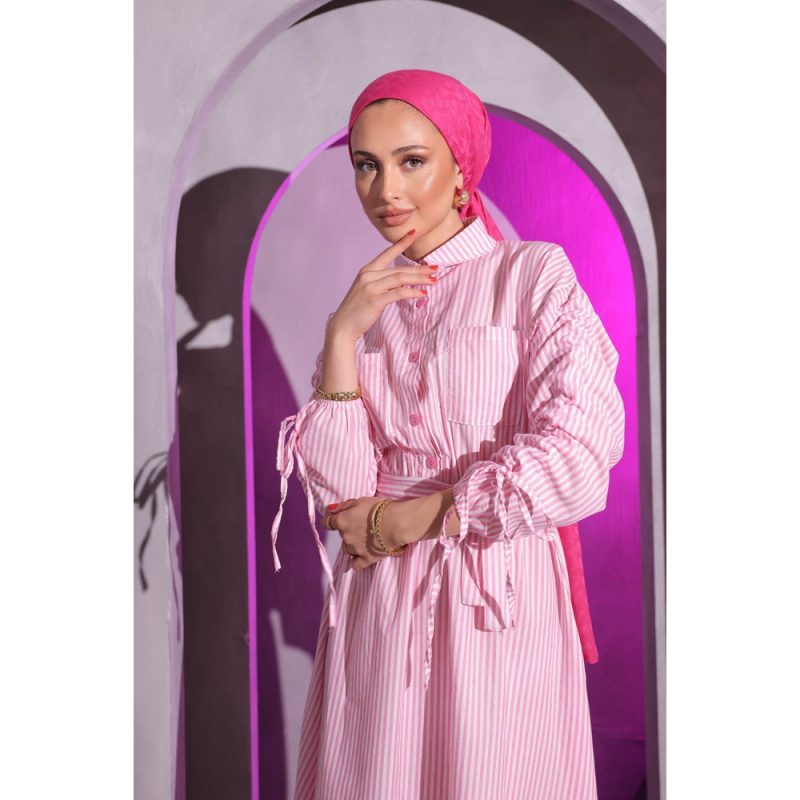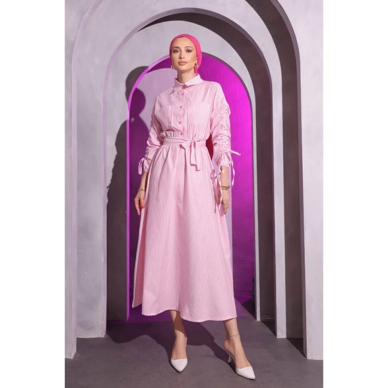 Introducing our Elegant Stripe Long-Sleeve Maxi Dress, a perfect blend of modesty and contemporary style. Elegant Stripe Long-Sleeve Maxi Dress with Waist Tie and Button Details dress showcases a delightful pink and white striped pattern that exudes both grace and sophistication, ideal for various occasions such as casual outings, office wear, or festive gatherings. Crafted from high-quality, breathable fabric, it ensures comfort without compromising on style. The dress features a classic button-down front, adding a touch of traditional charm, while the stand collar offers a modern twist to the timeless design. The cohesive look is further enhanced by the full-length sleeves adorned with delicate lace-up details at the cuffs, providing an element of chic flair. Accentuate your waist with the included adjustable belt, which can be tied into a charming bow for a flattering silhouette. Its flowing A-line skirt ensures ease of movement and a relaxed fit, making it perfect for all body types. Pair this versatile maxi dress with your favorite heels and statement jewelry to complete an effortlessly elegant look. The Elegant Stripe Long-Sleeve Maxi Dress not only offers timeless appeal but also becomes a staple piece in your wardrobe. Dare to stand out and let this exquisite piece bring a touch of elegance and sophistication to your everyday attire.