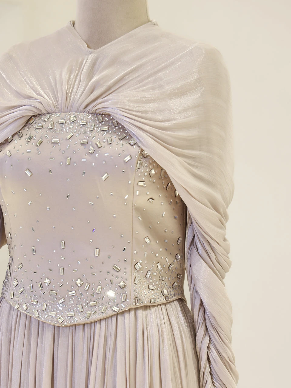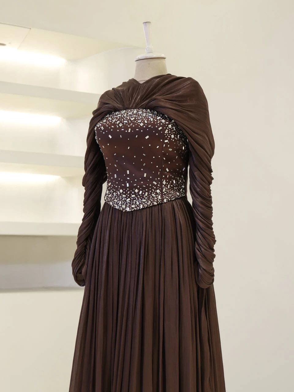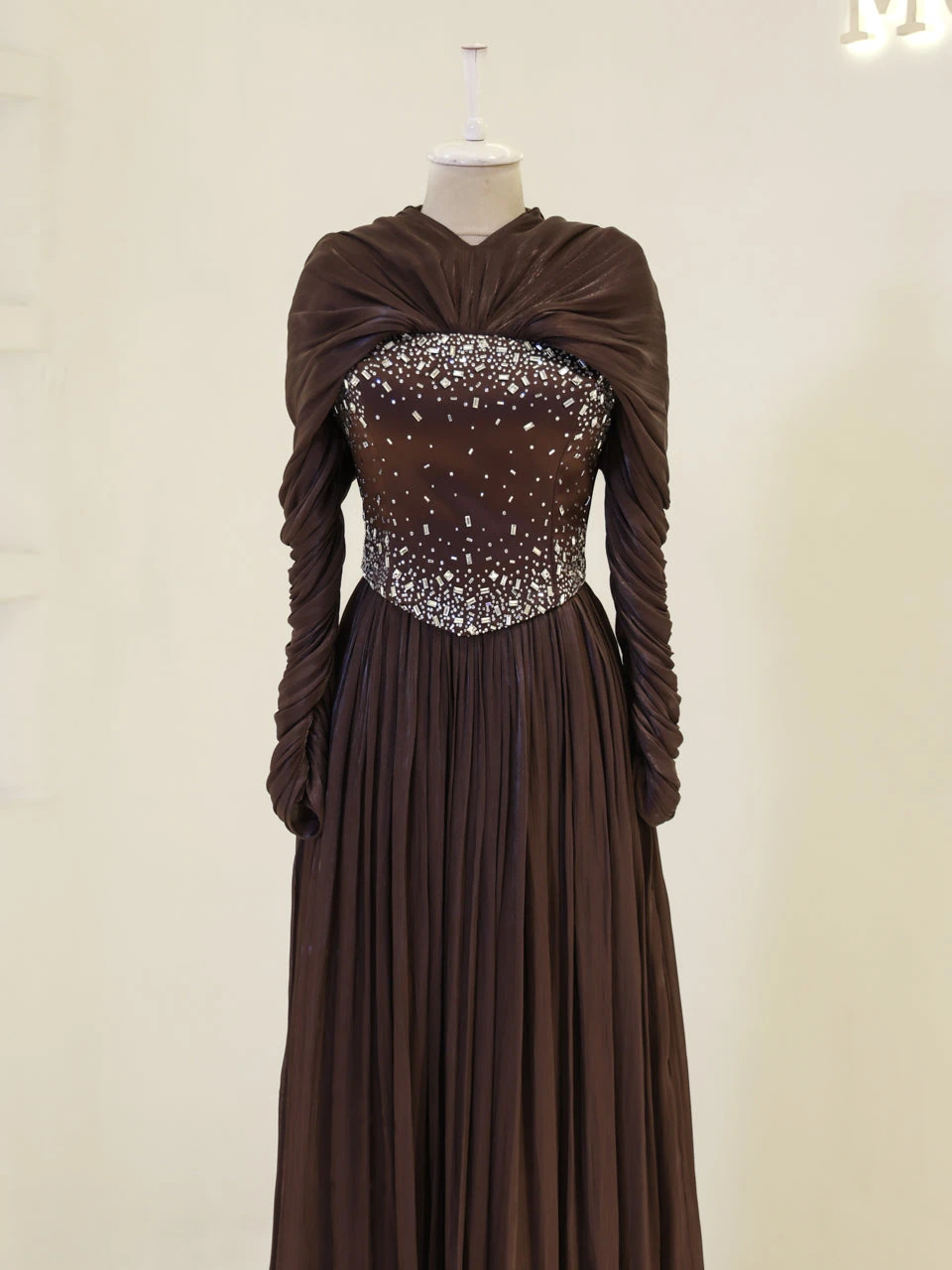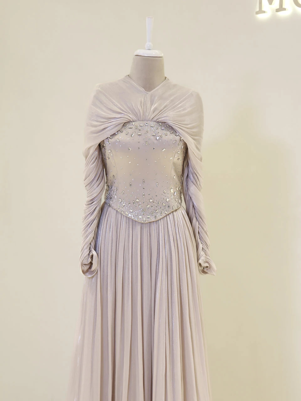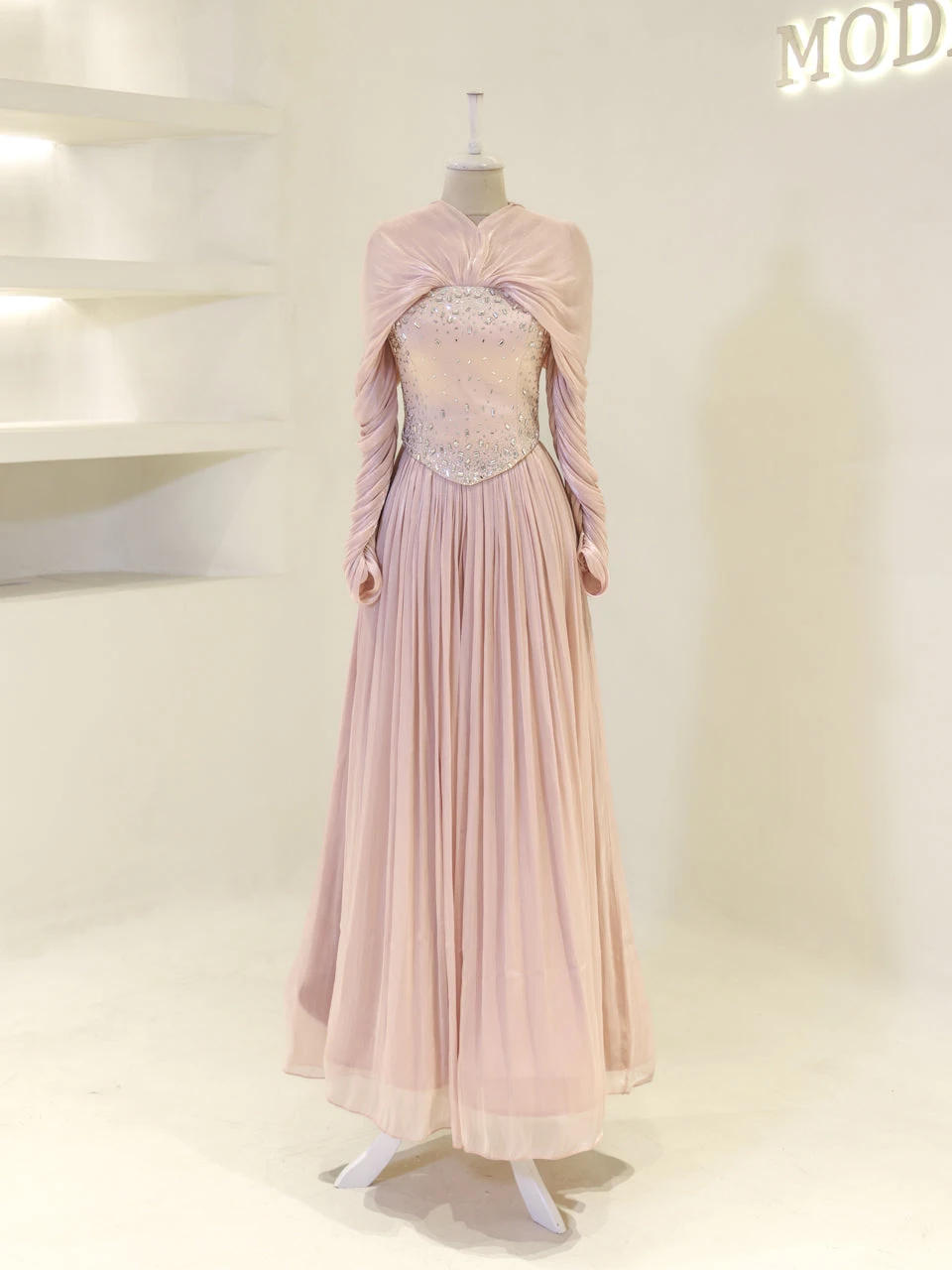 The Elzara Modest Evening Dress is designed with precision to offer a perfect fit. It features a V-neckline and an average length of 150 cm. Crafted from orchid fabric, this dress includes a back zipper closure and built-in chest pads for added comfort. The dress is fully lined and has draped sleeves. The embellishments are adhered securely, and it boasts a flared skirt design.