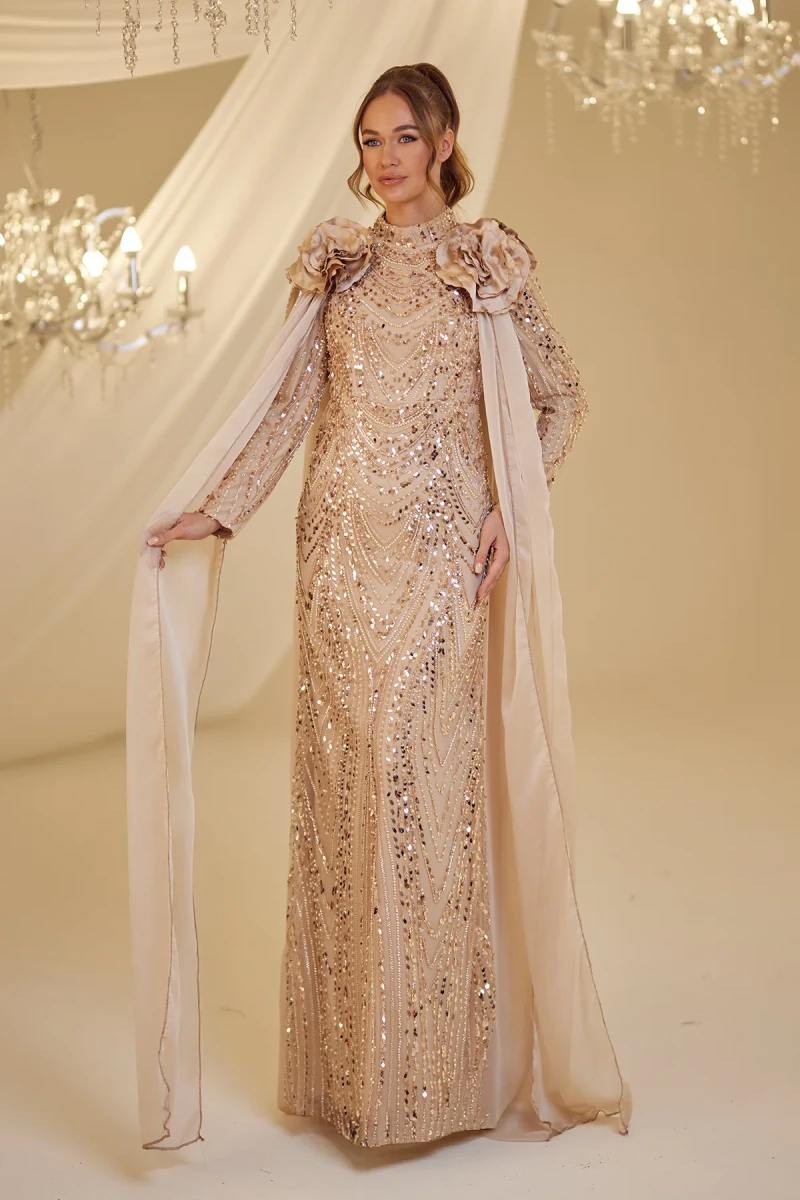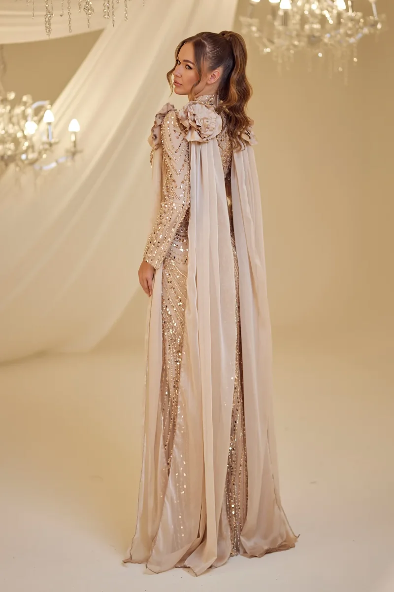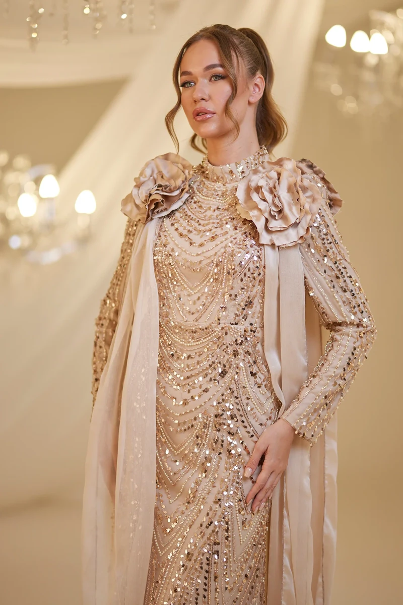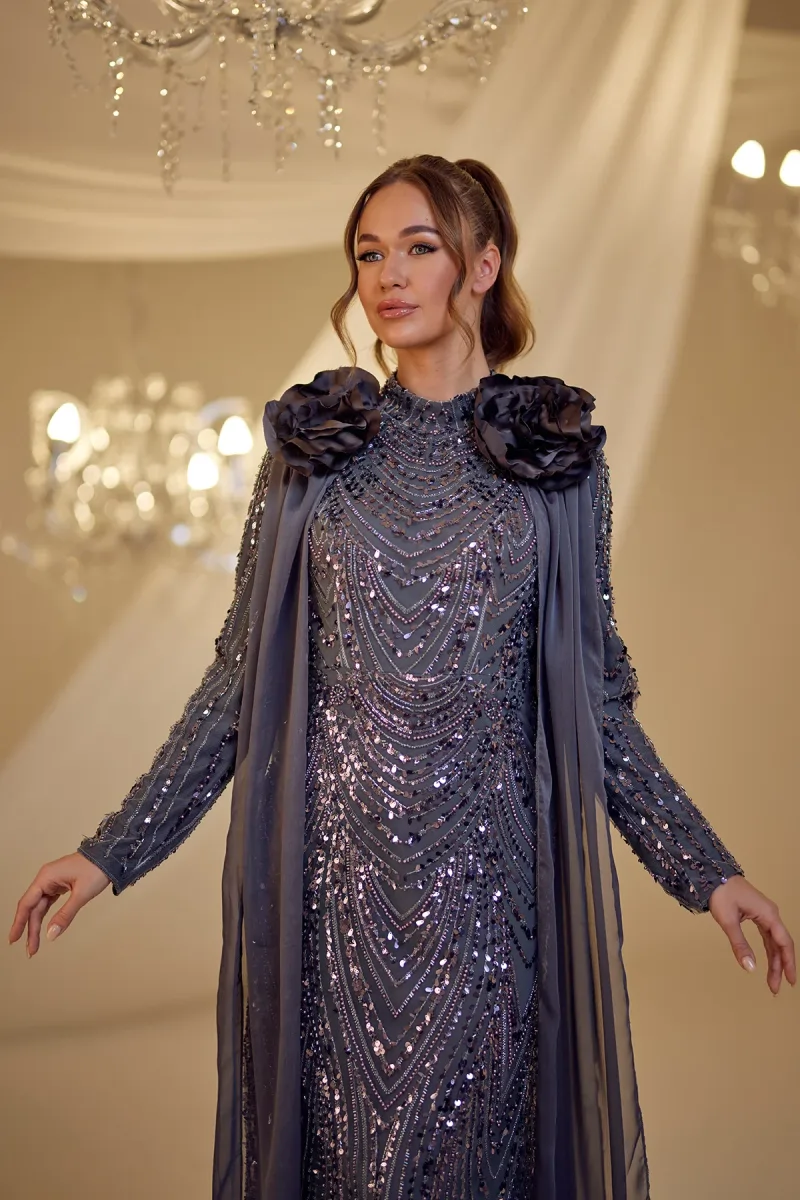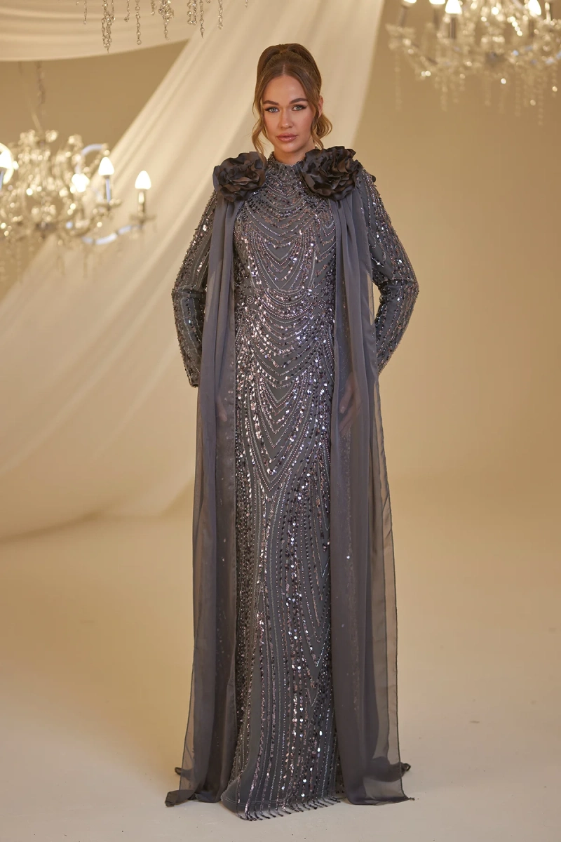 Make a stunning entrance in this captivating Mihrimah evening gown, where elegance meets opulence. Designed for special occasions, this modest gown features a high neckline, full-length silhouette, and a dramatic floral cape draping gracefully from the shoulders.