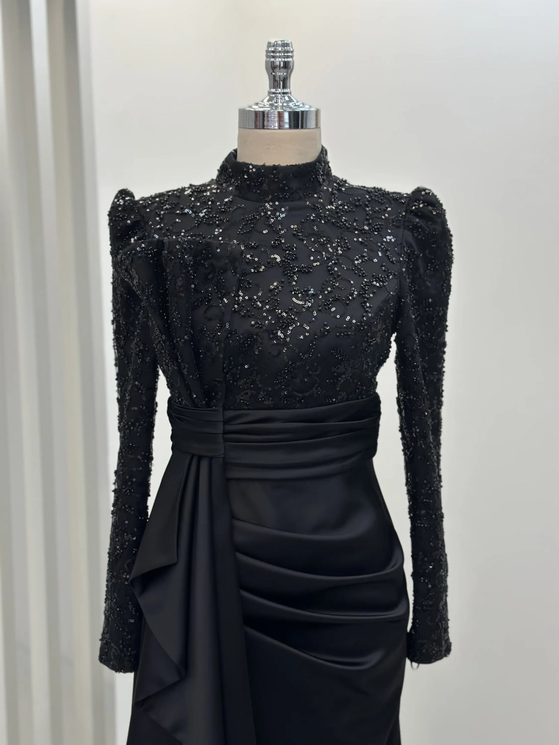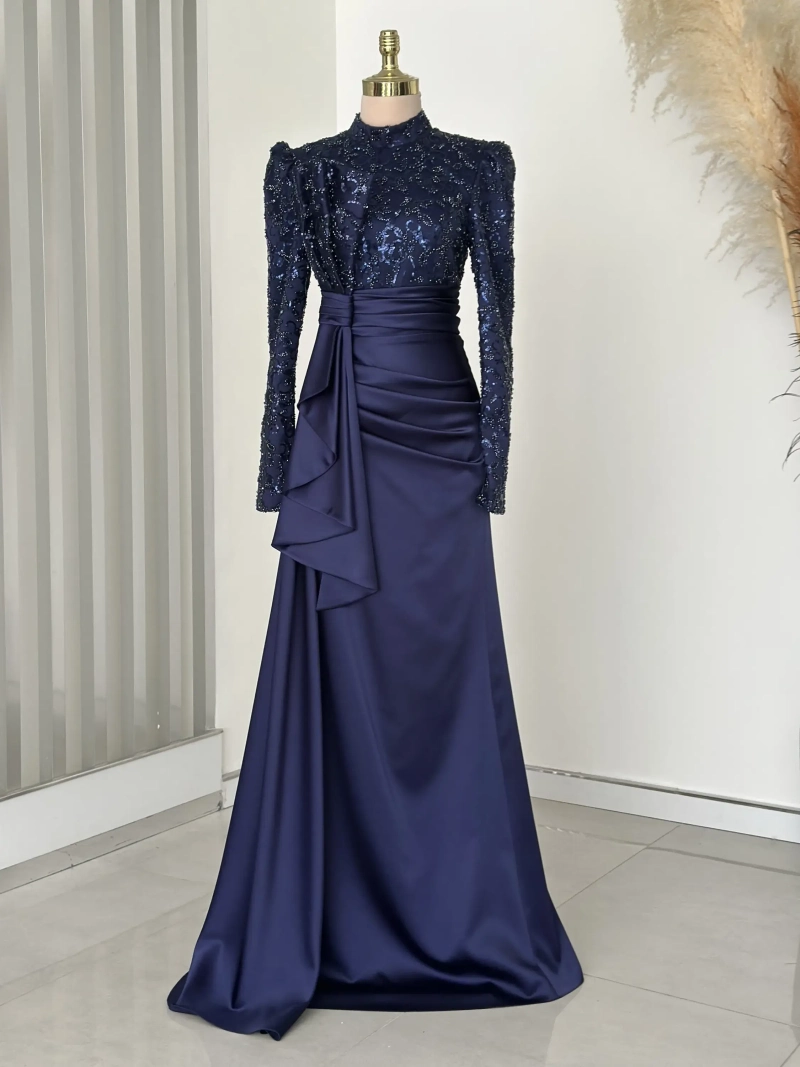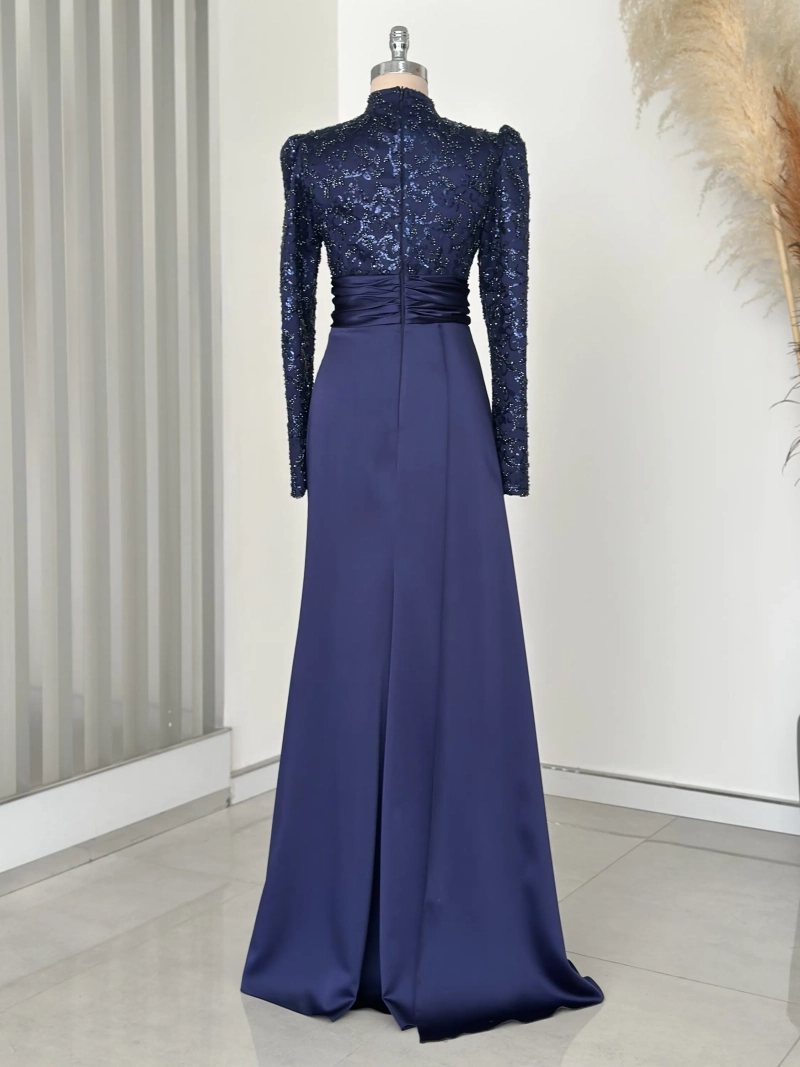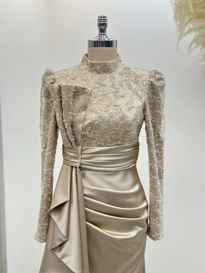 This stunning gown blends timeless modesty with luxurious detailing, making it an ideal choice for weddings, receptions, and formal events. Featuring a high neckline, long sleeves, and a flattering silhouette, it offers full coverage with a graceful, tailored fit.