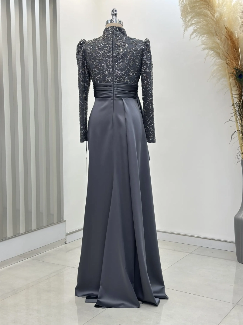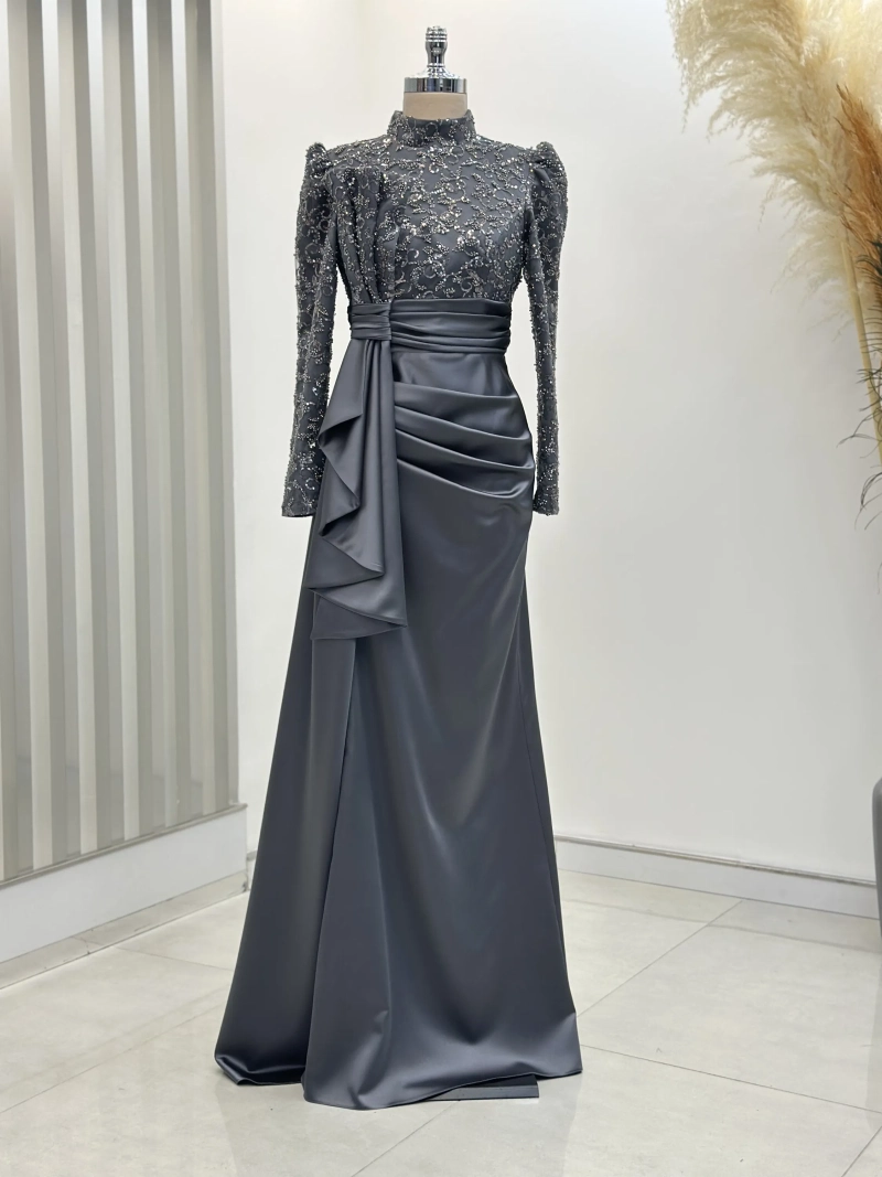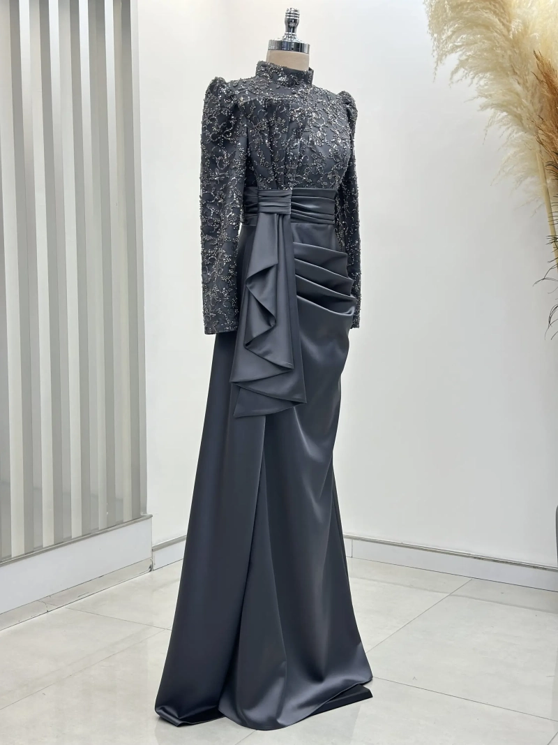 Crafted from premium satin and fully lined, this gown ensures comfort while maintaining its refined structure. Available in rich, sophisticated tones like charcoal grey, dark indigo, gold, and olive green — each reflecting a distinct mood from modern glamour to classic charm.