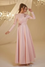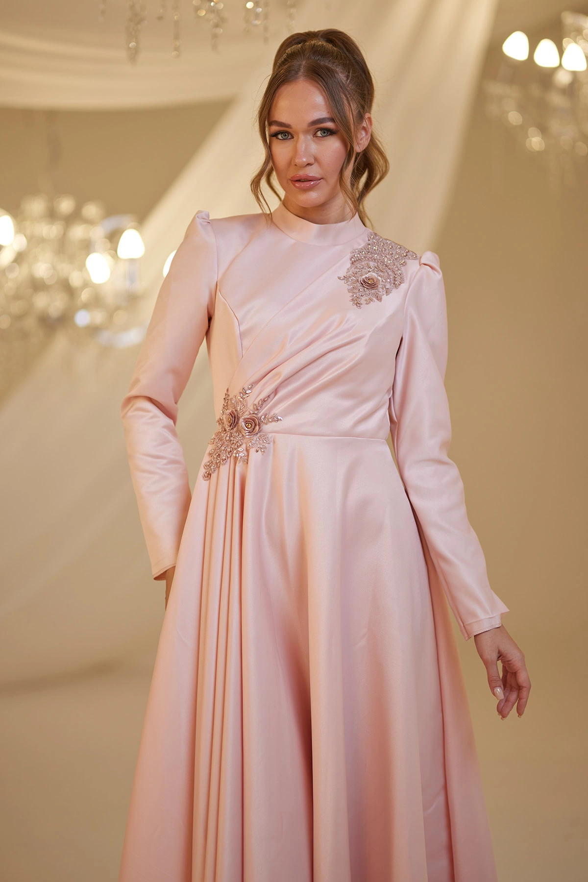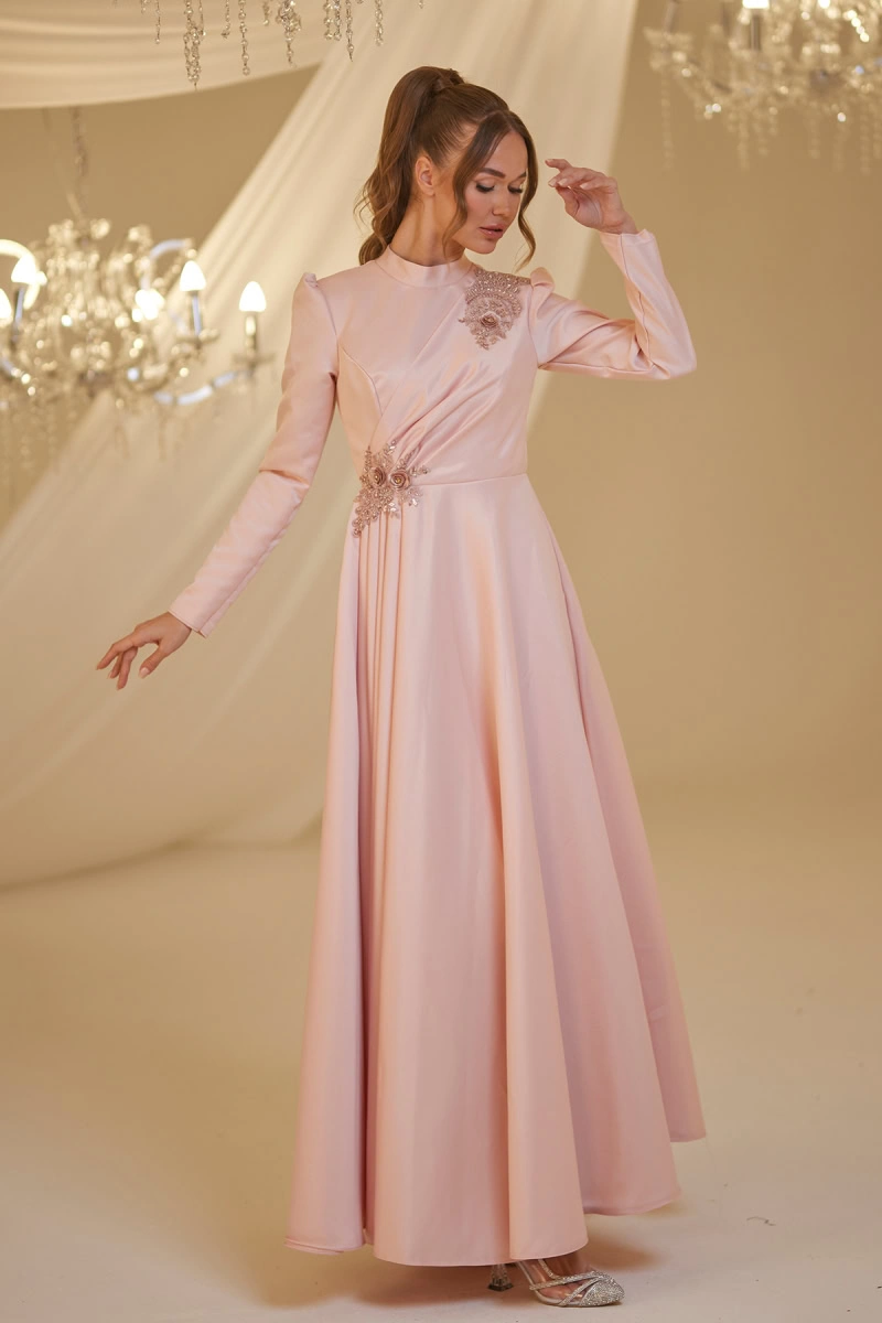 This elegant satin gown features delicate embroidery on the shoulder and waist, offering a graceful and sophisticated look for modest fashion lovers.