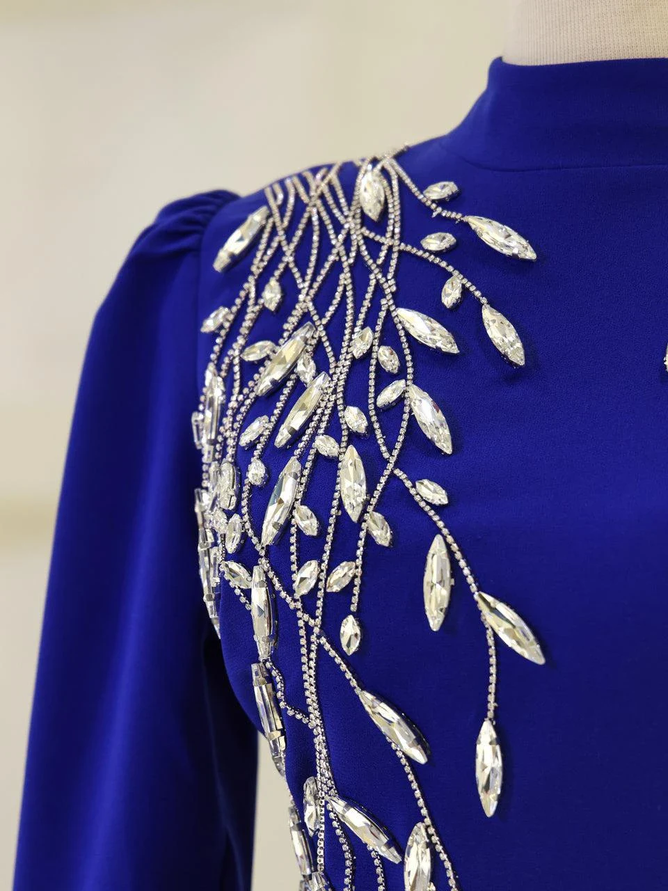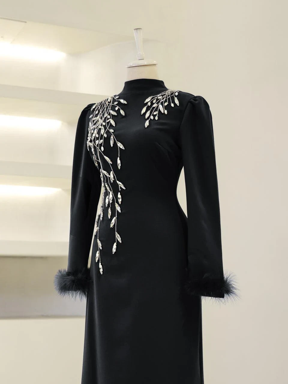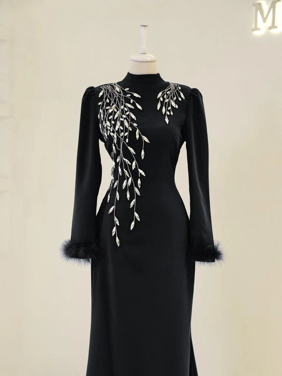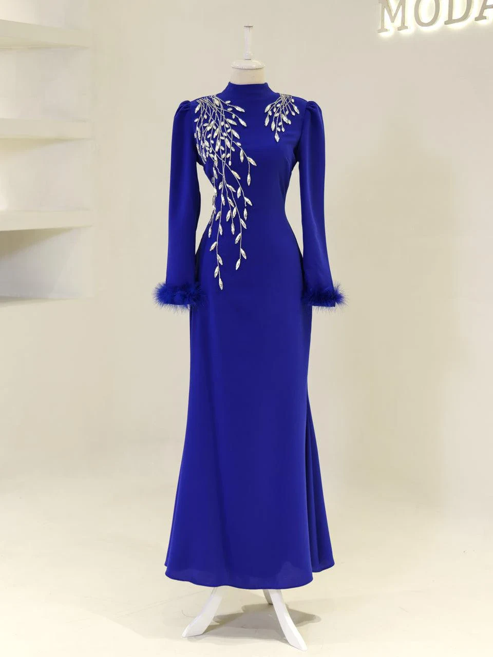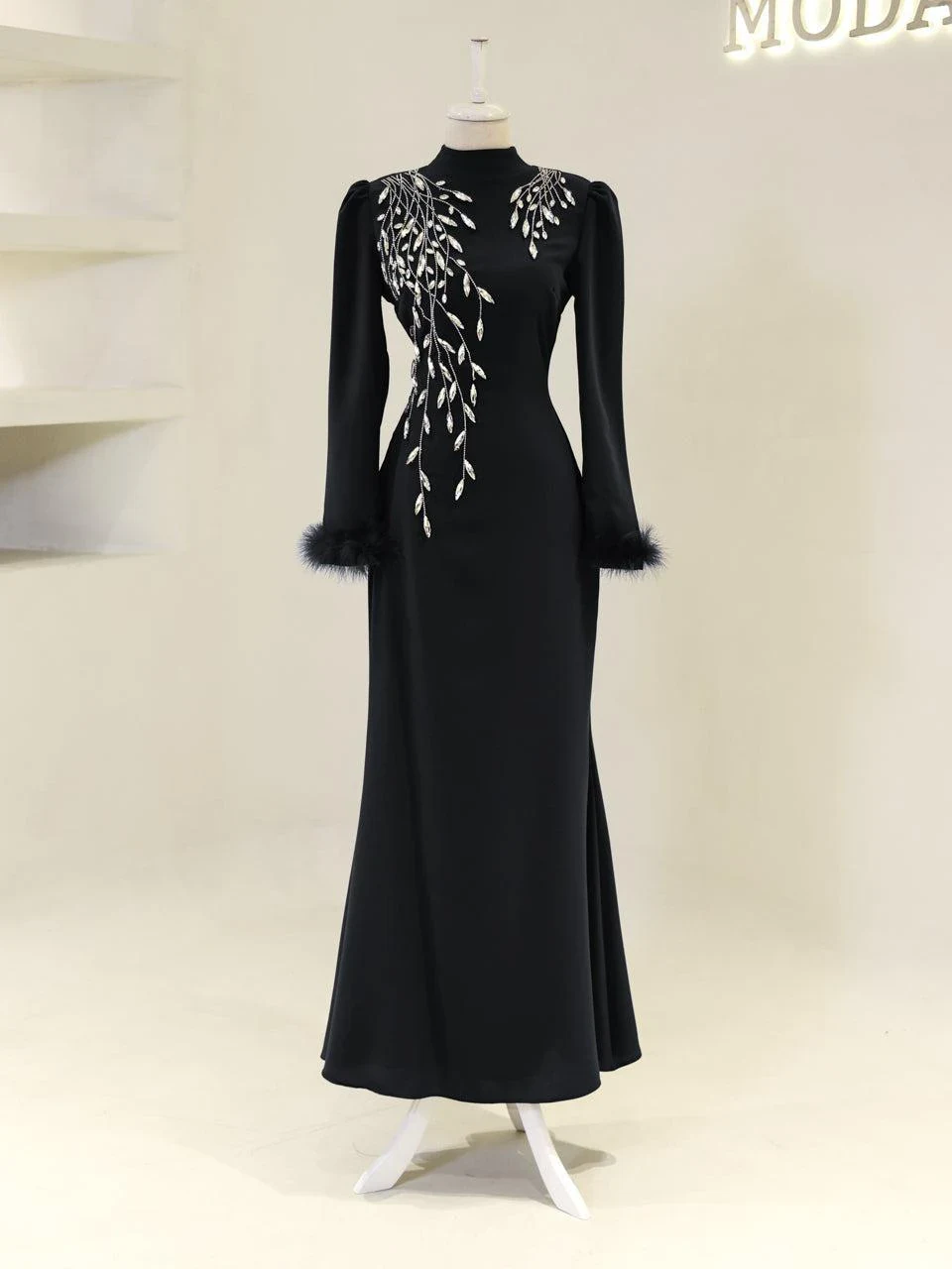 The Erva Modest Evening Dress is designed with precision to offer a perfect fit. Made from crepe fabric, the dress measures 160 cm in length and features a convenient back zipper. It is fully lined and includes a built-in chest pad for added comfort. The embellishments are securely attached, and the cuffs feature ostrich feather details. The dress is styled in a mermaid silhouette.