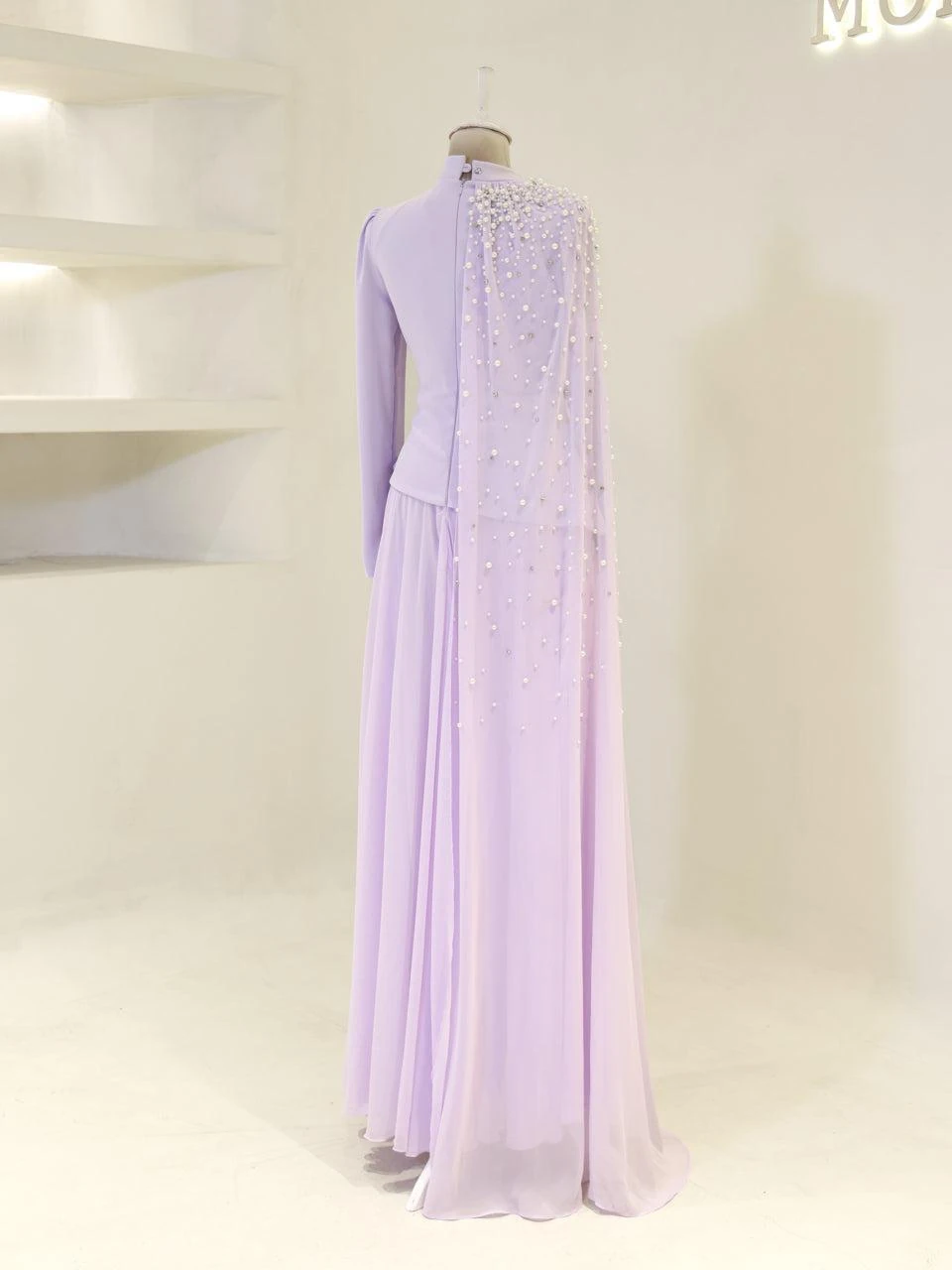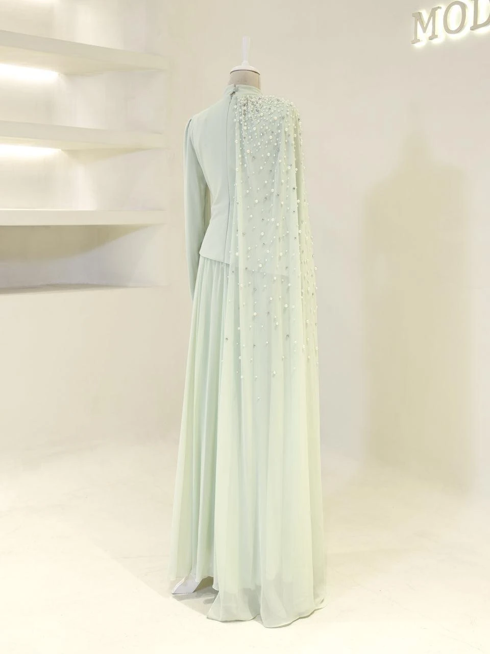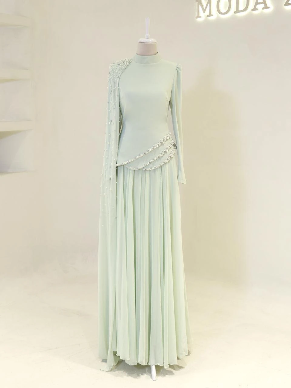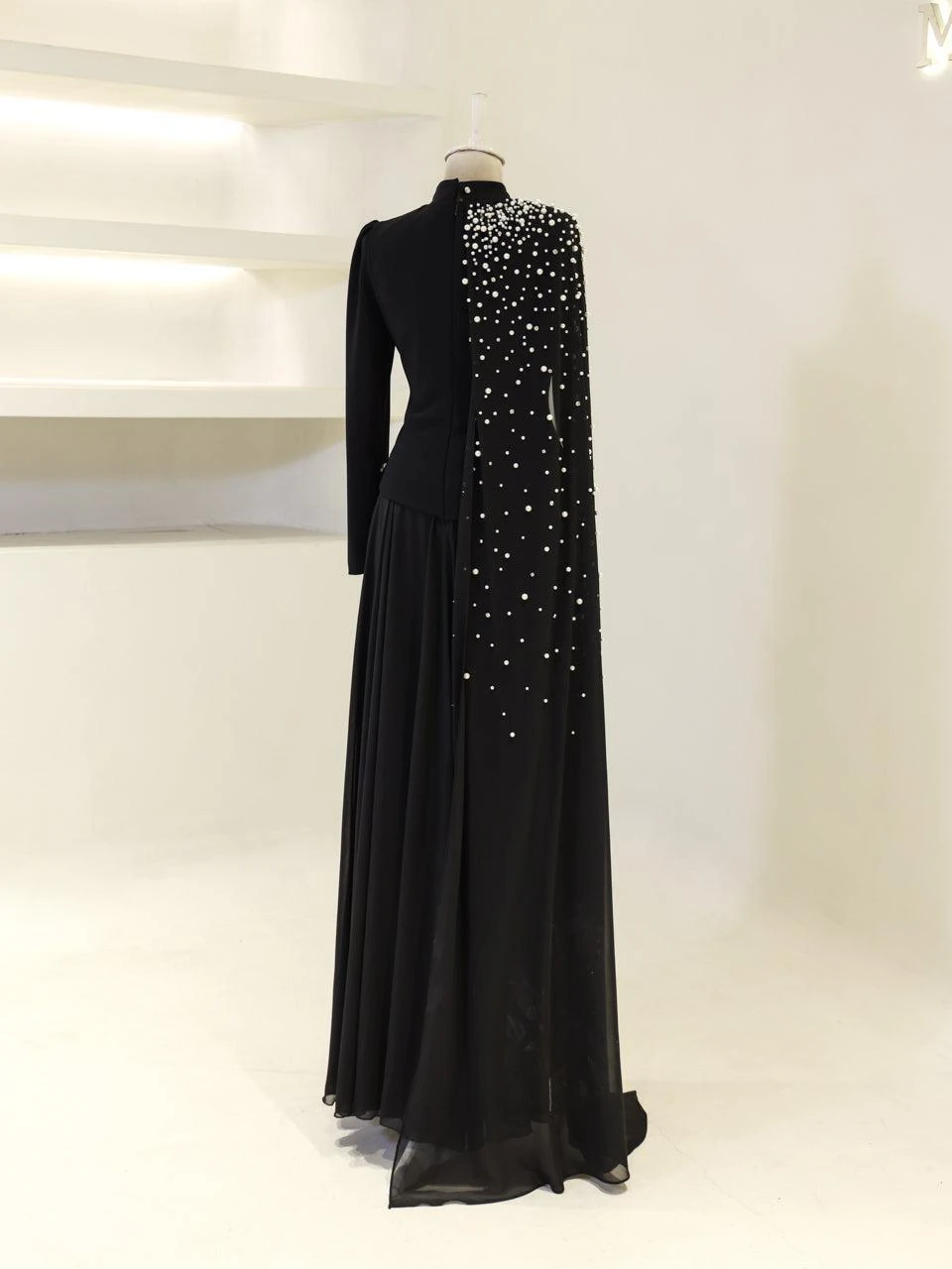 The Evangeline Modest Evening Dress is designed to offer elegance and comfort. It features a standard fit with an average length of 160 cm. The upper part of the dress is made from crepe fabric, while the lower part is crafted from chiffon material. The dress includes a back zipper for easy wear and a built-in chest pad for added support. It is fully lined for comfort and modesty. A unique cape detail flows from the right shoulder to the hem, adding a touch of sophistication. The dress is adorned with studded embellishments and has a flared skirt design.