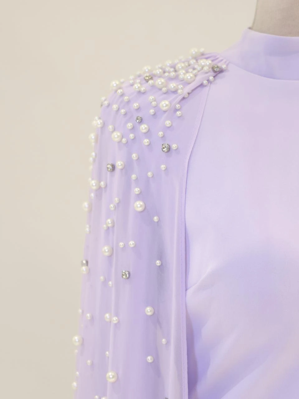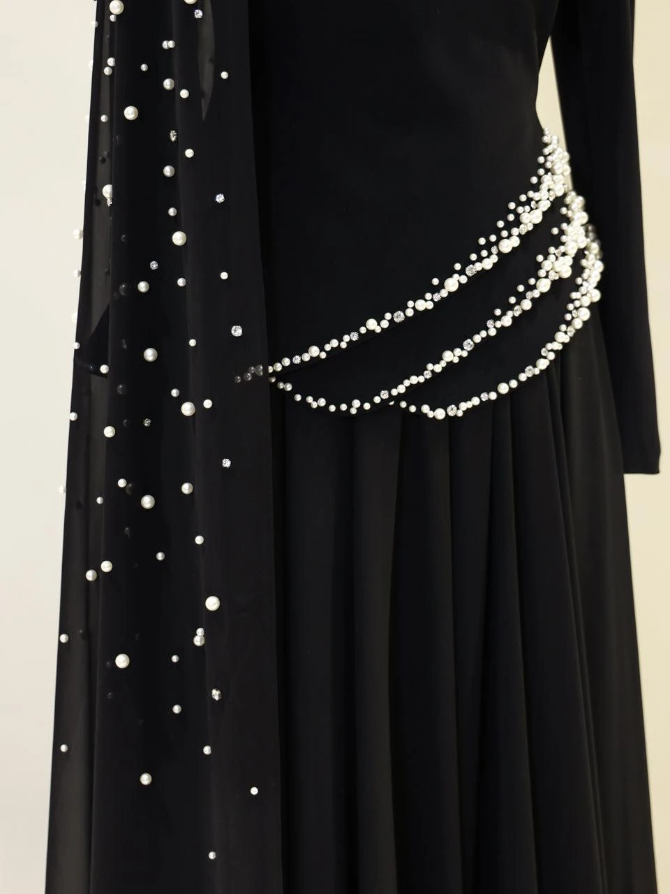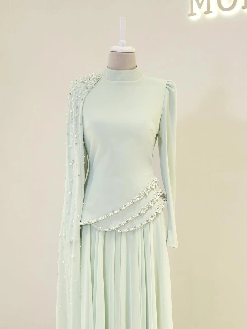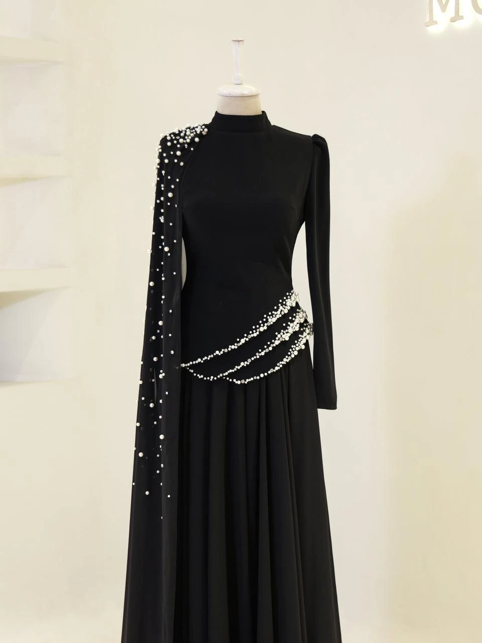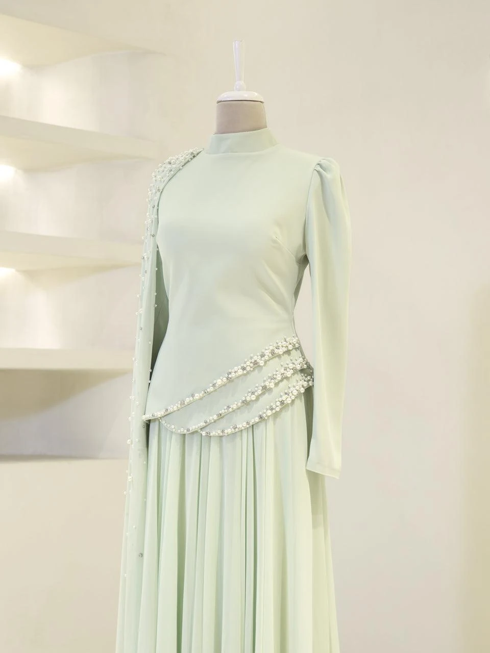 The Evangeline Modest Evening Dress is designed to offer elegance and comfort. It features a standard fit with an average length of 160 cm. The upper part of the dress is made from crepe fabric, while the lower part is crafted from chiffon material. The dress includes a back zipper for easy wear and a built-in chest pad for added support. It is fully lined for comfort and modesty. A unique cape detail flows from the right shoulder to the hem, adding a touch of sophistication. The dress is adorned with studded embellishments and has a flared skirt design.