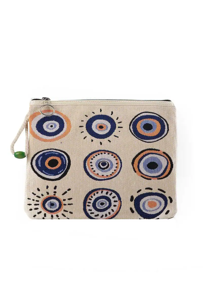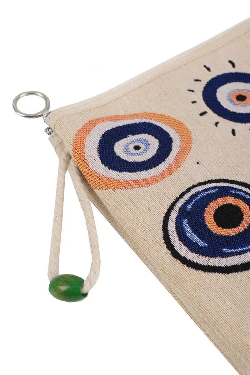 The Evil Eye Pattern Tapestry Handbag is a stylish accessory originating from Bursa, Turkey. Measuring 20 by 25 cm, it offers convenience and ease of use. The tapestry design is intricately crafted and can be paired with various materials such as leather or fabric, making it versatile for different occasions.