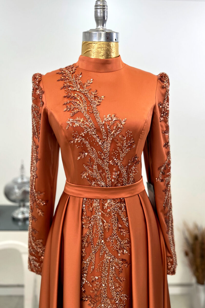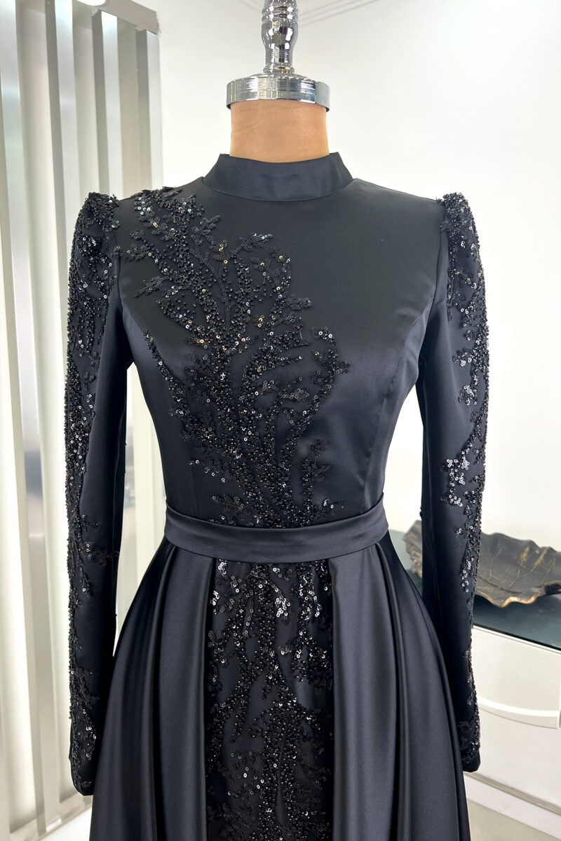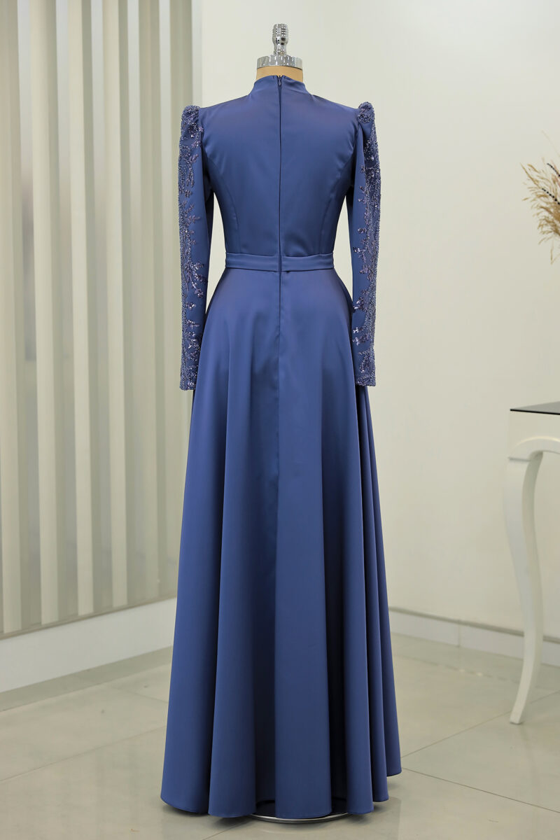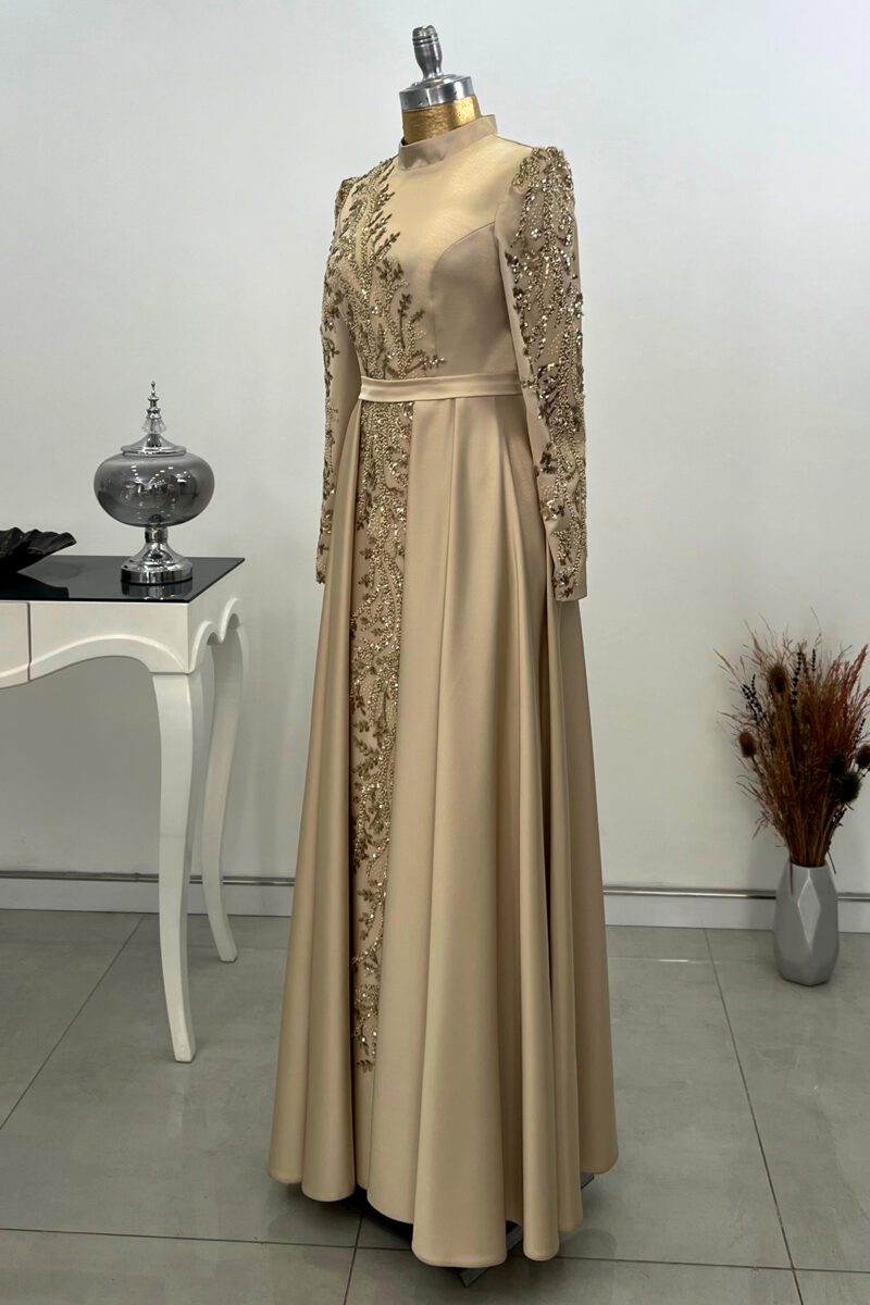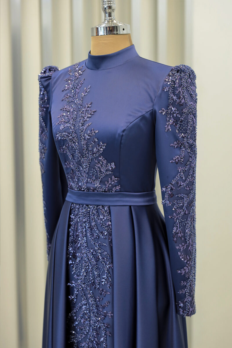 Exclusive Satin Hijab Evening Dress model with sequin bead detail embroidered on the front and sleeves is pleated in the skirt and has a hidden zipper and lining at the back
