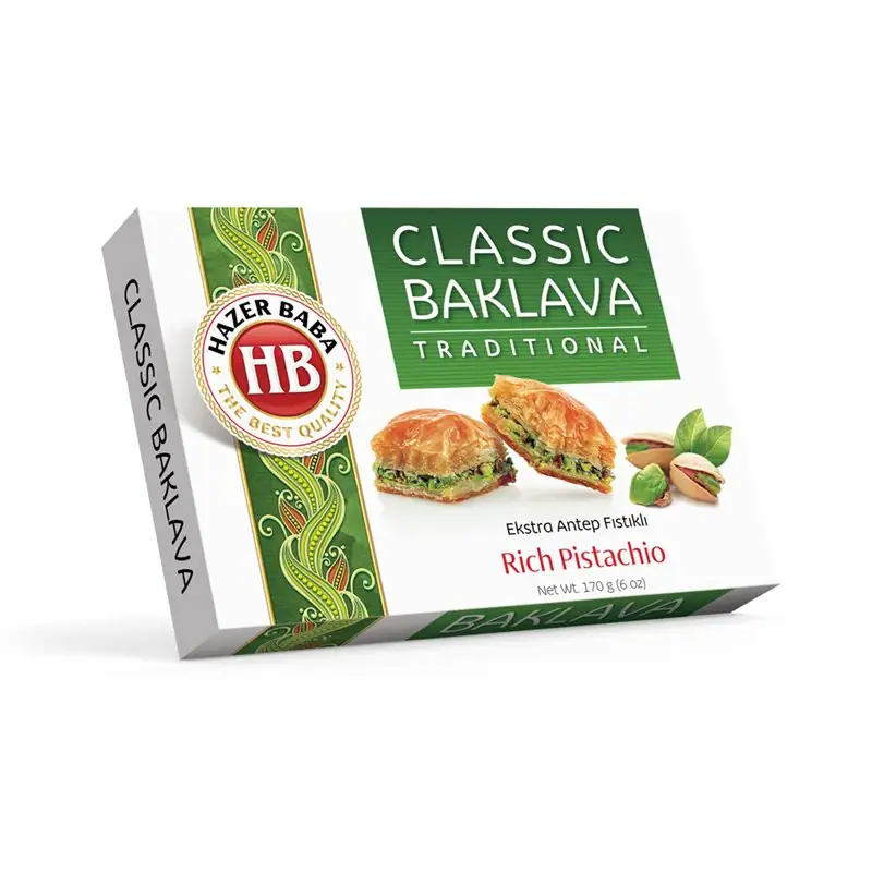 Extra Pistachio Baklava is a traditional Turkish dessert made with a rich blend of ingredients including 20% pistachios, sugar, wheat flour, water, wheat starch, vegetable oil, milk powder, salt, butter, glucose, and preservative (potassium sorbate). This product contains gluten and may include traces of other nuts.